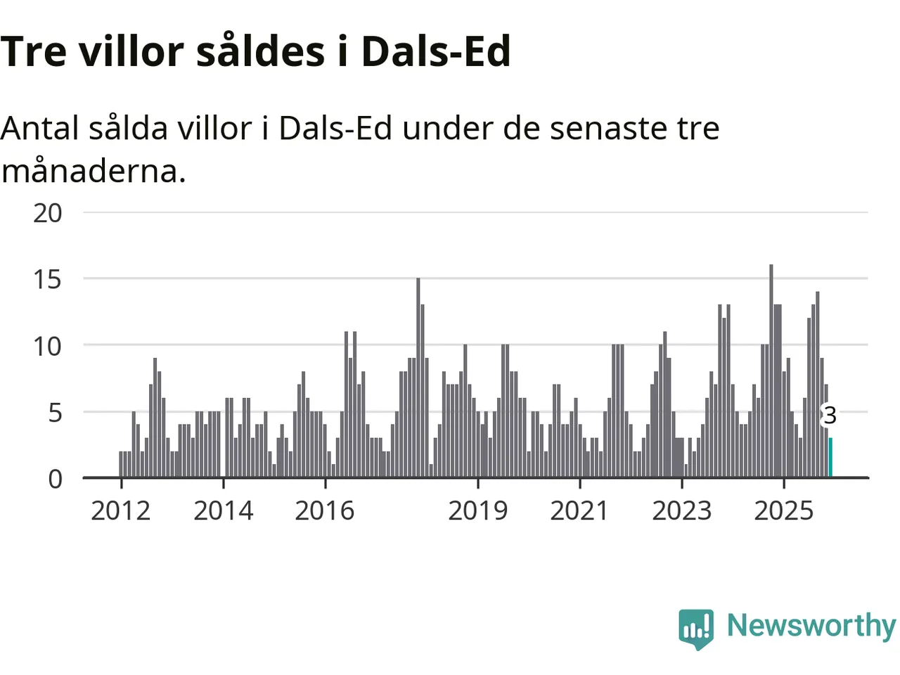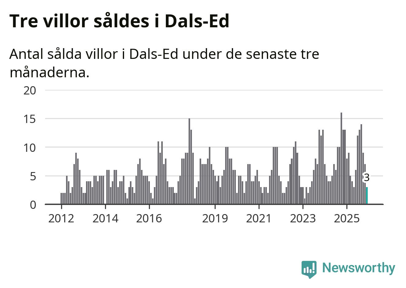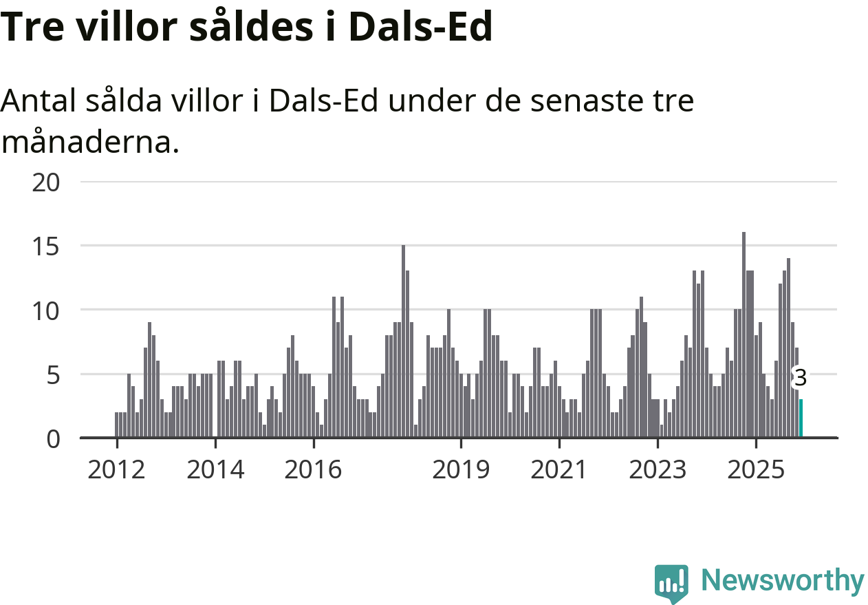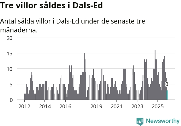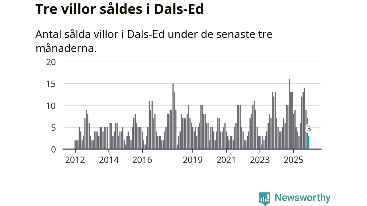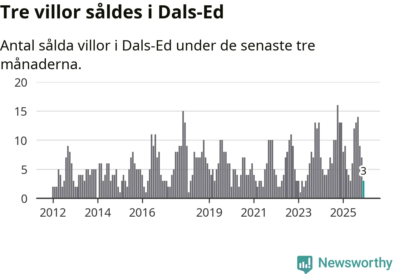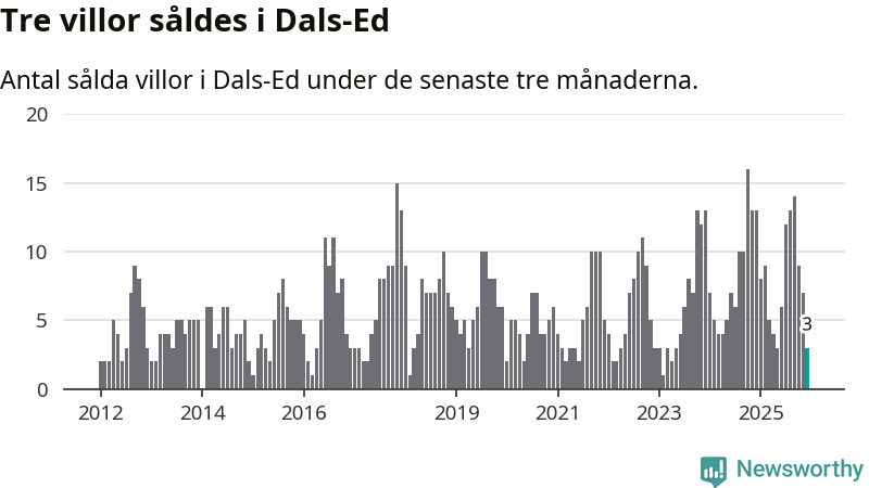 Mellan oktober och december gjordes sammanlagt tre affärer med villor i Dals-Eds kommun. Det kan jämföras med 13 vid motsvarande tid i fjol.