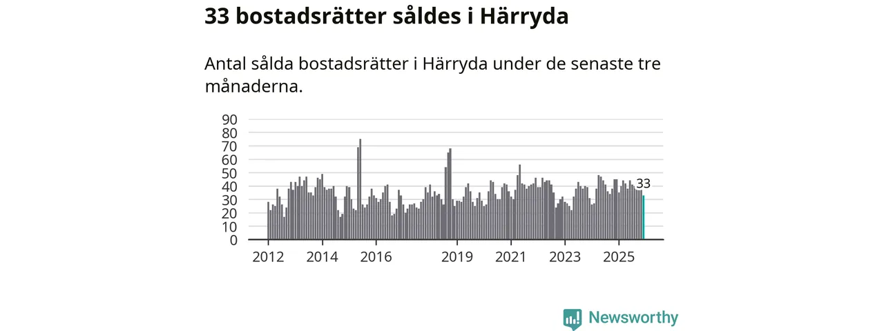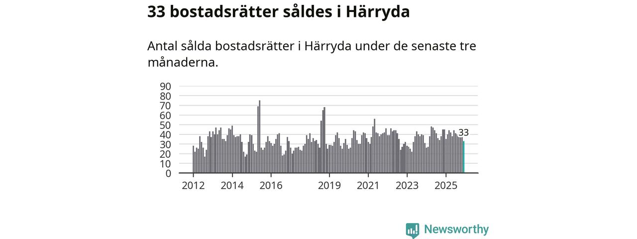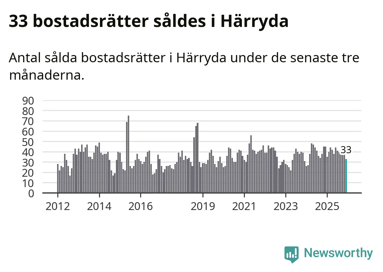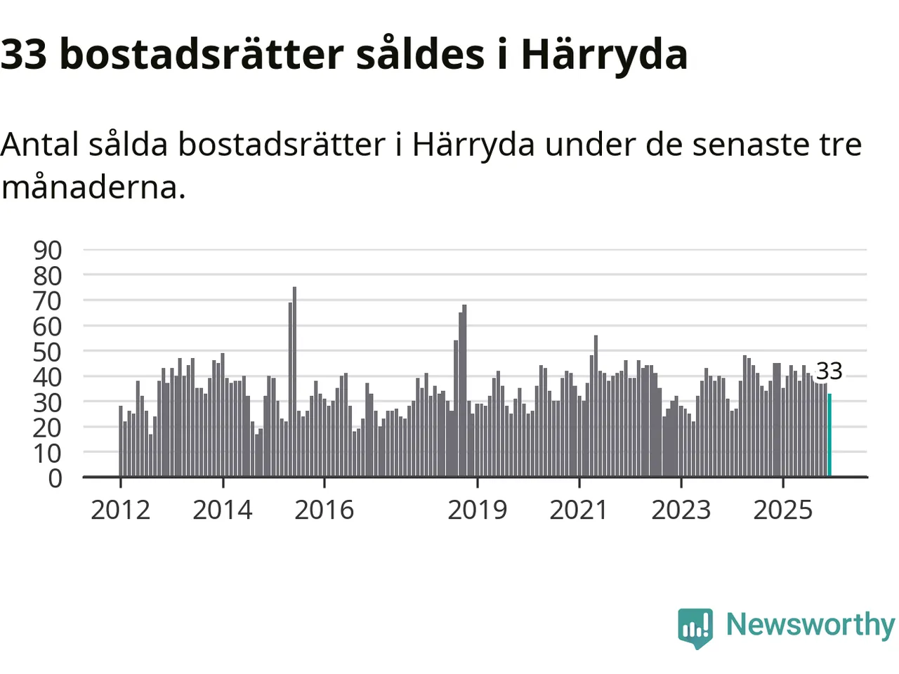 Sammanlagt såldes 33 bostadsrätter i Härryda kommun mellan oktober och december till ett genomsnittligt pris på 3,4 miljoner kronor. I fjol gjordes 45 affärer vid den här tiden på året.