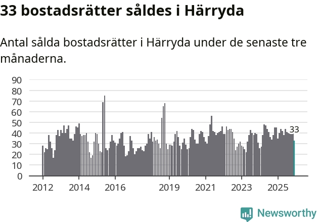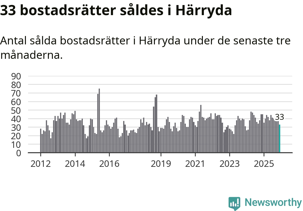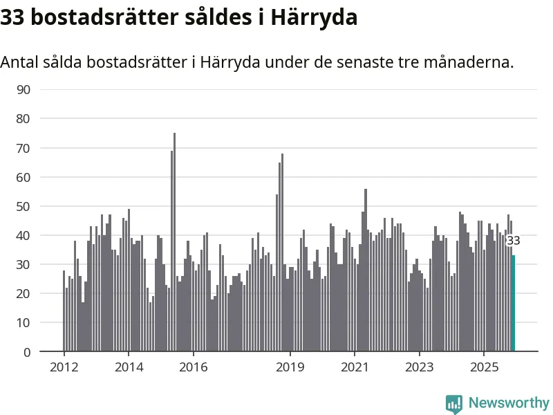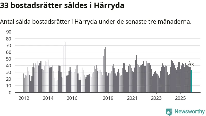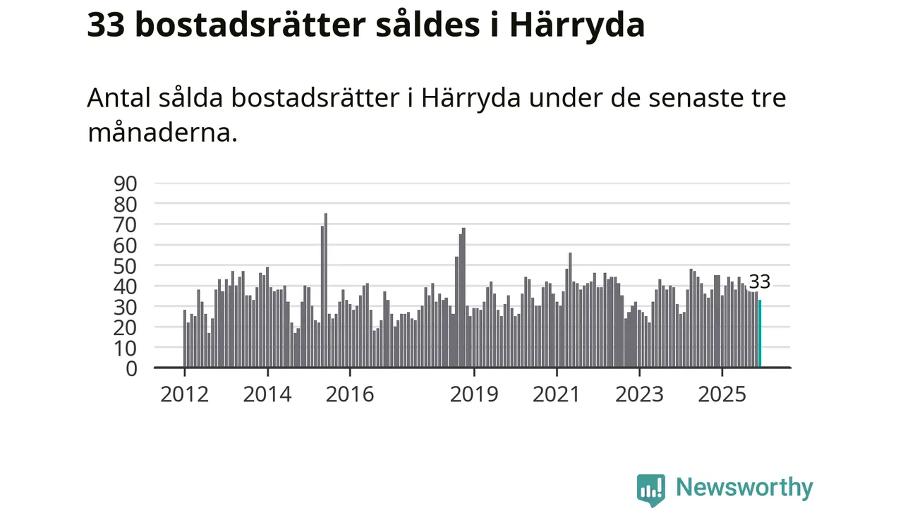 Sammanlagt såldes 33 bostadsrätter i Härryda kommun mellan oktober och december till ett genomsnittligt pris på 3,4 miljoner kronor. I fjol gjordes 45 affärer vid den här tiden på året.