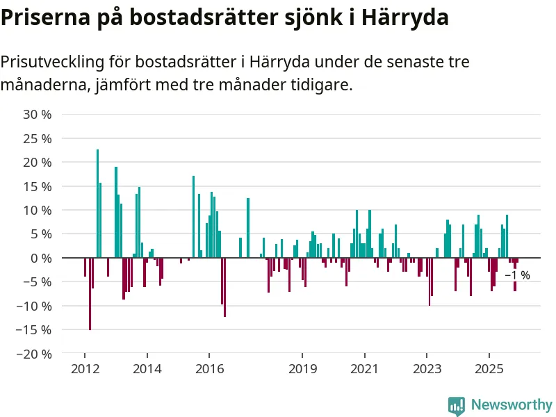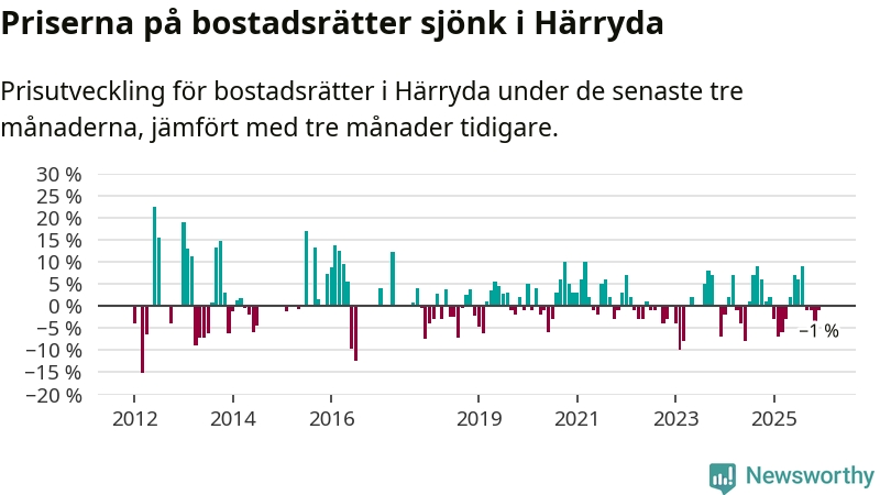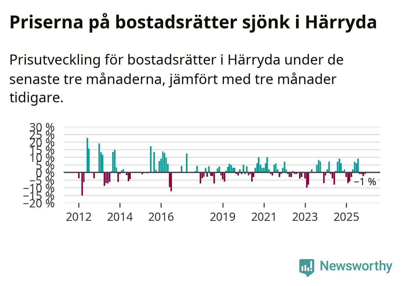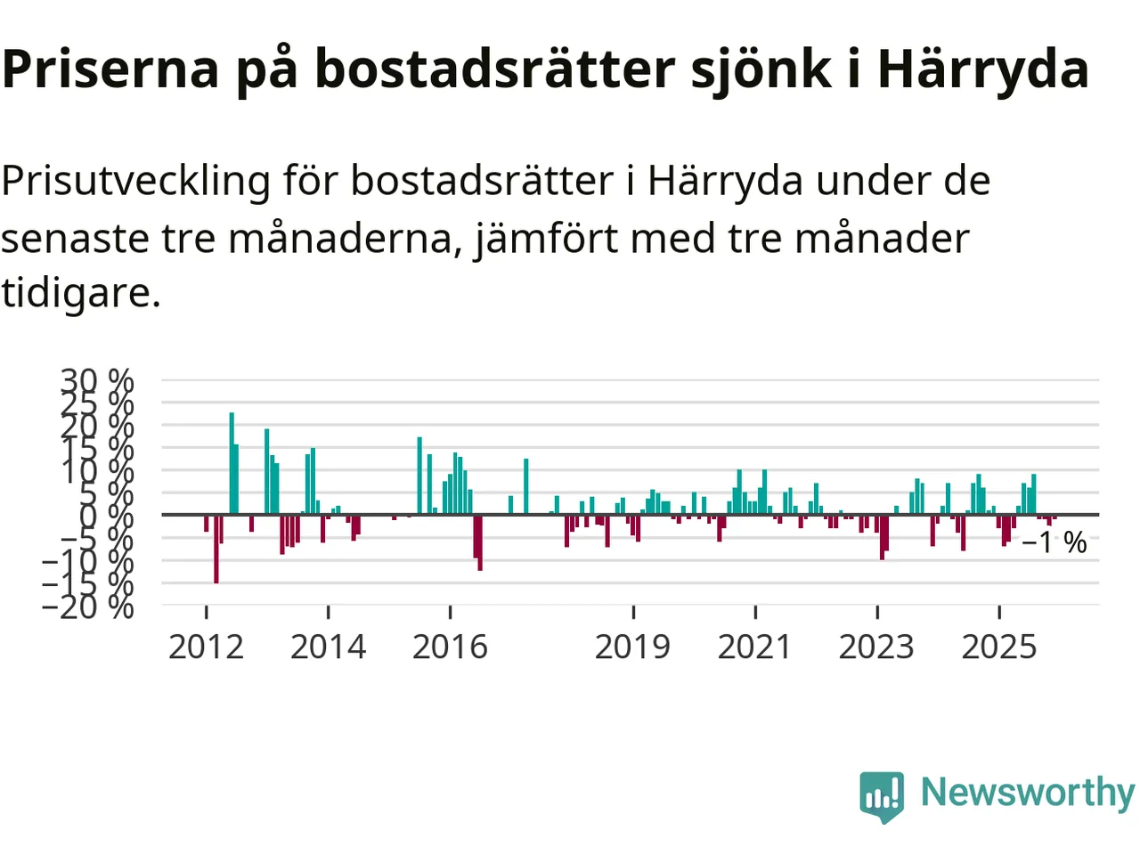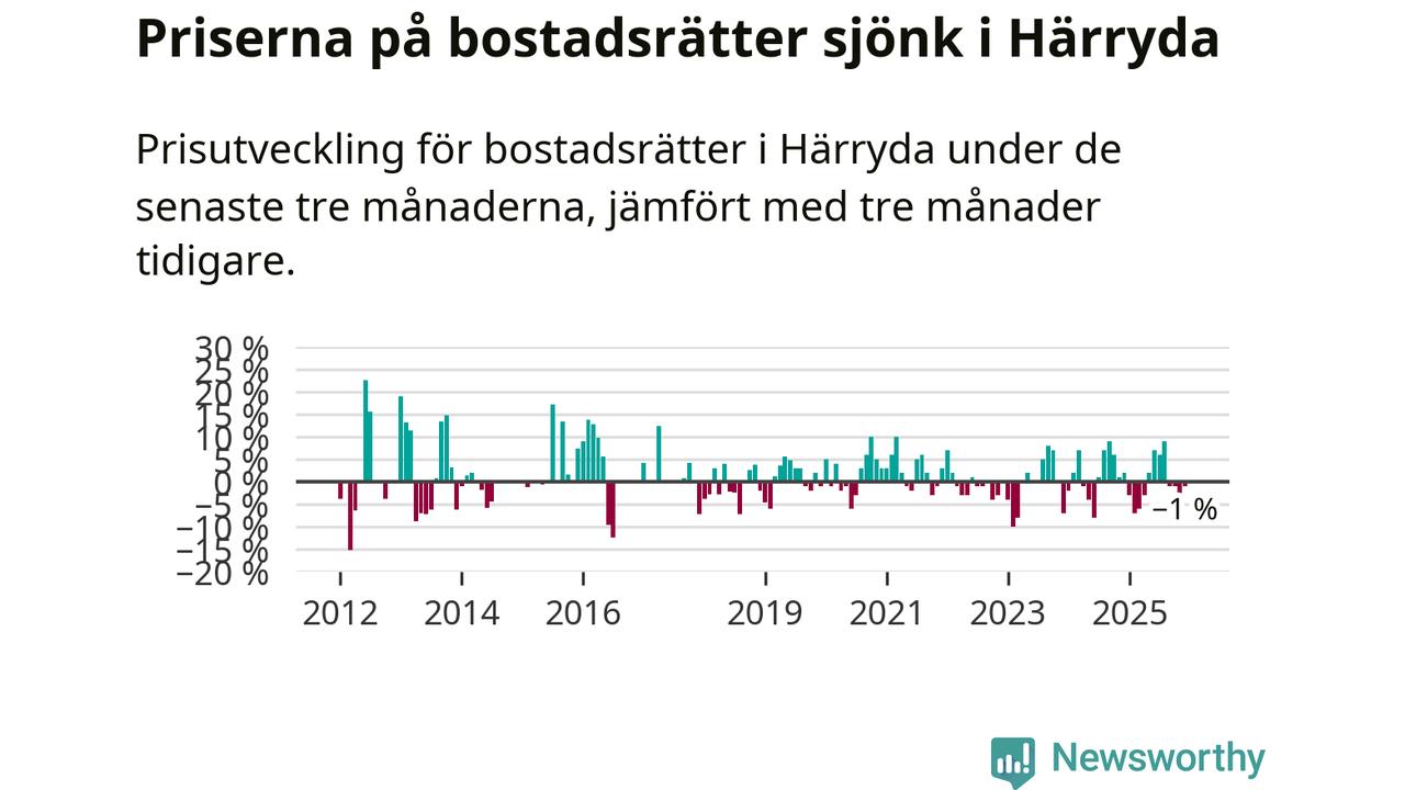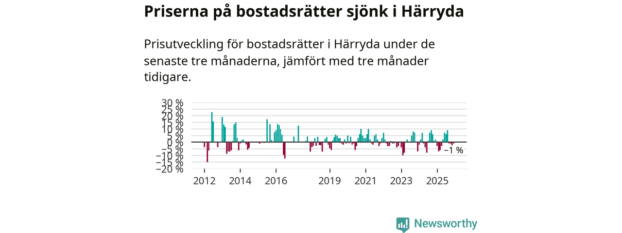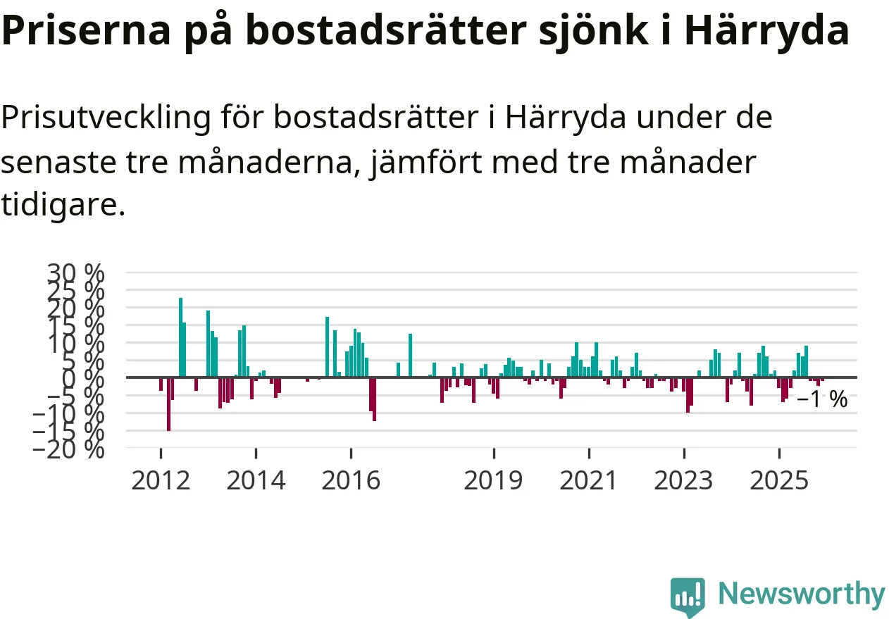 Priserna på bostadsrätter har gått ner i Härryda kommun. Medelpriset på försäljningarna under de senaste tre månaderna visar på en nedgång med 1 procent.