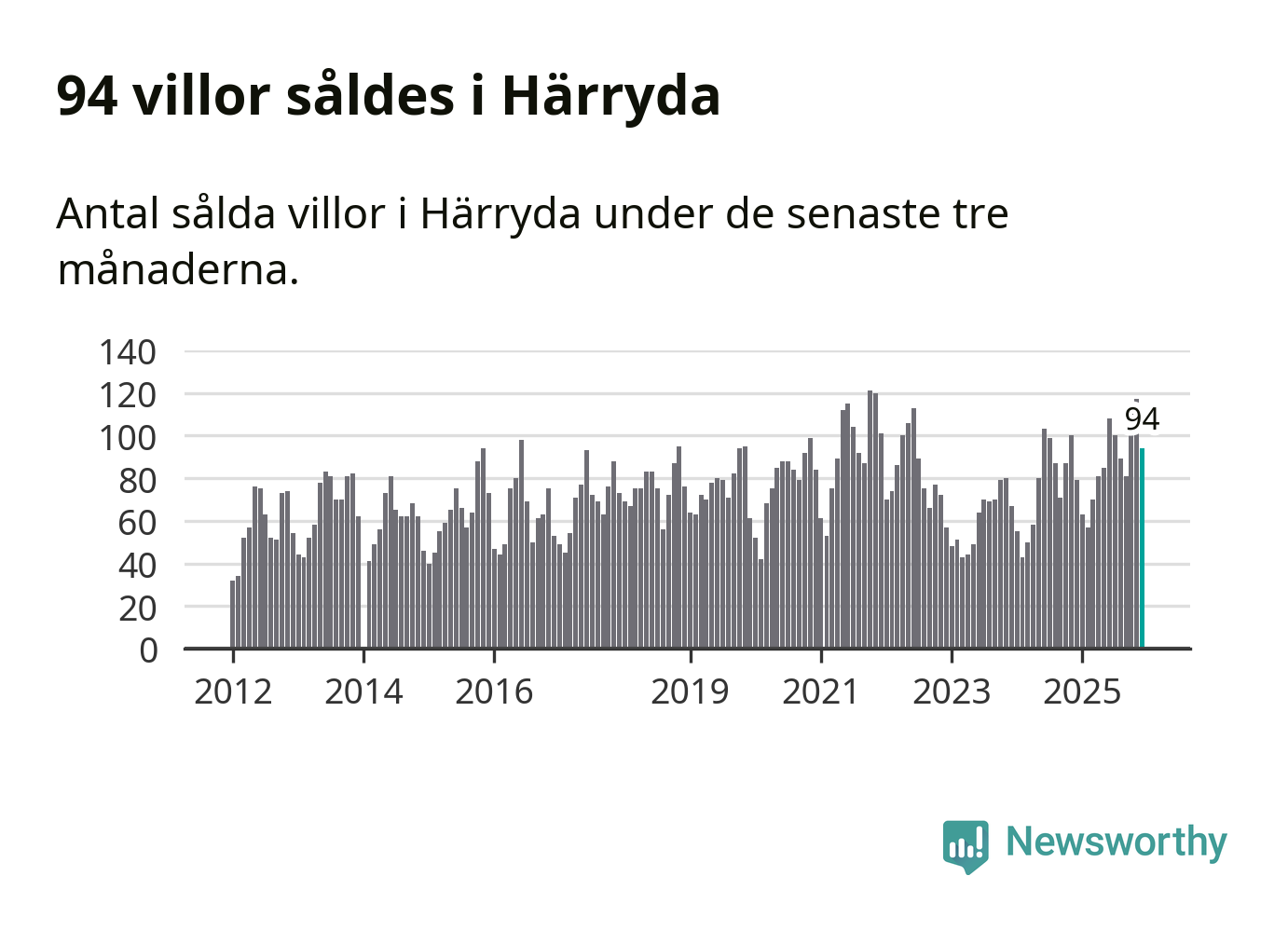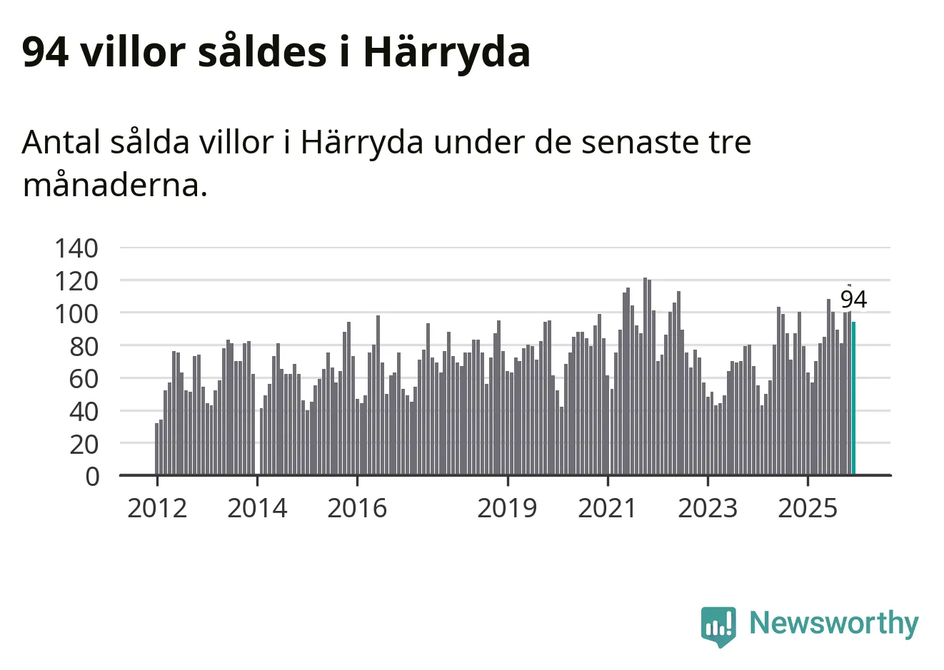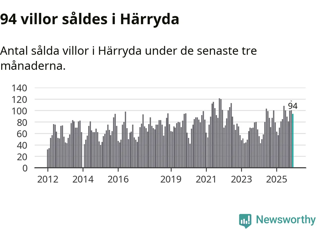 Sammanlagt såldes 94 villor i Härryda kommun mellan oktober och december till ett genomsnittligt pris på 5,0 miljoner kronor. I fjol gjordes 79 affärer vid den här tiden på året.