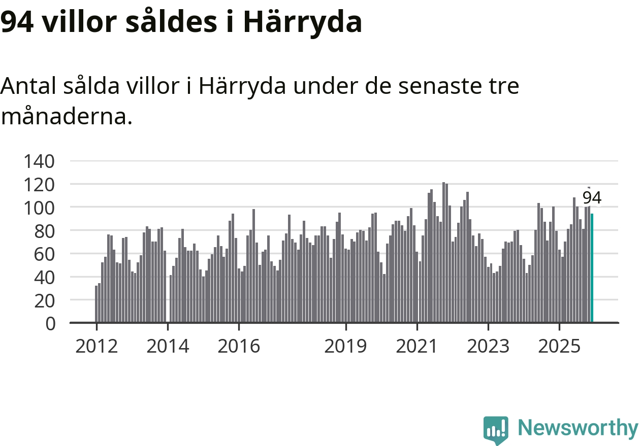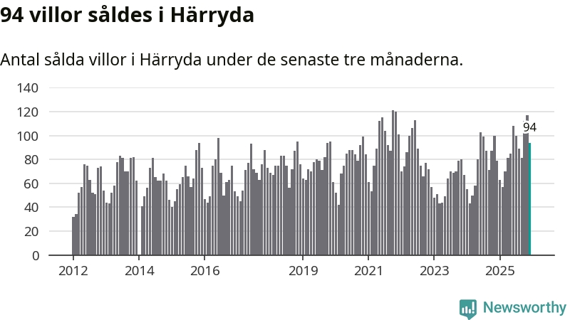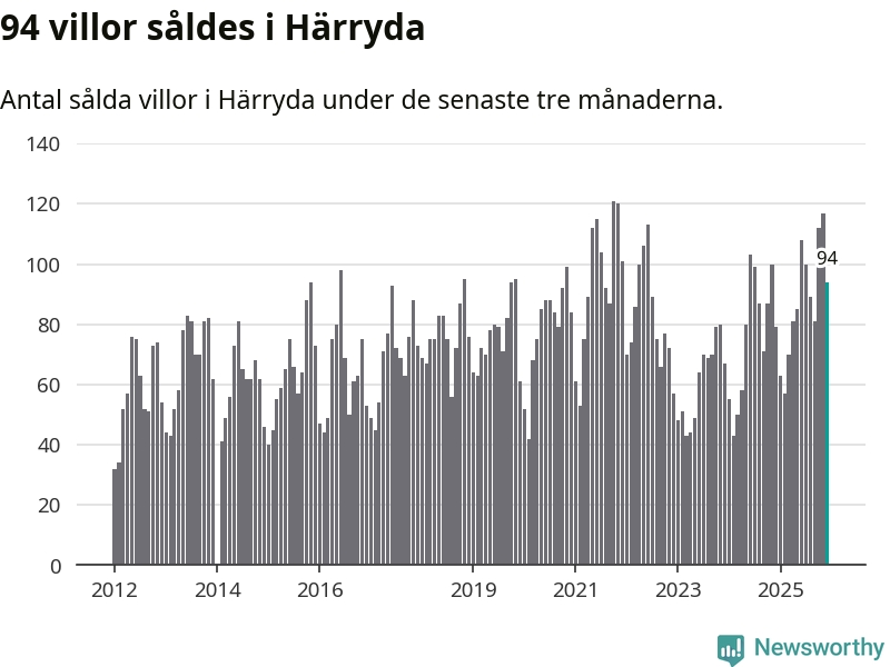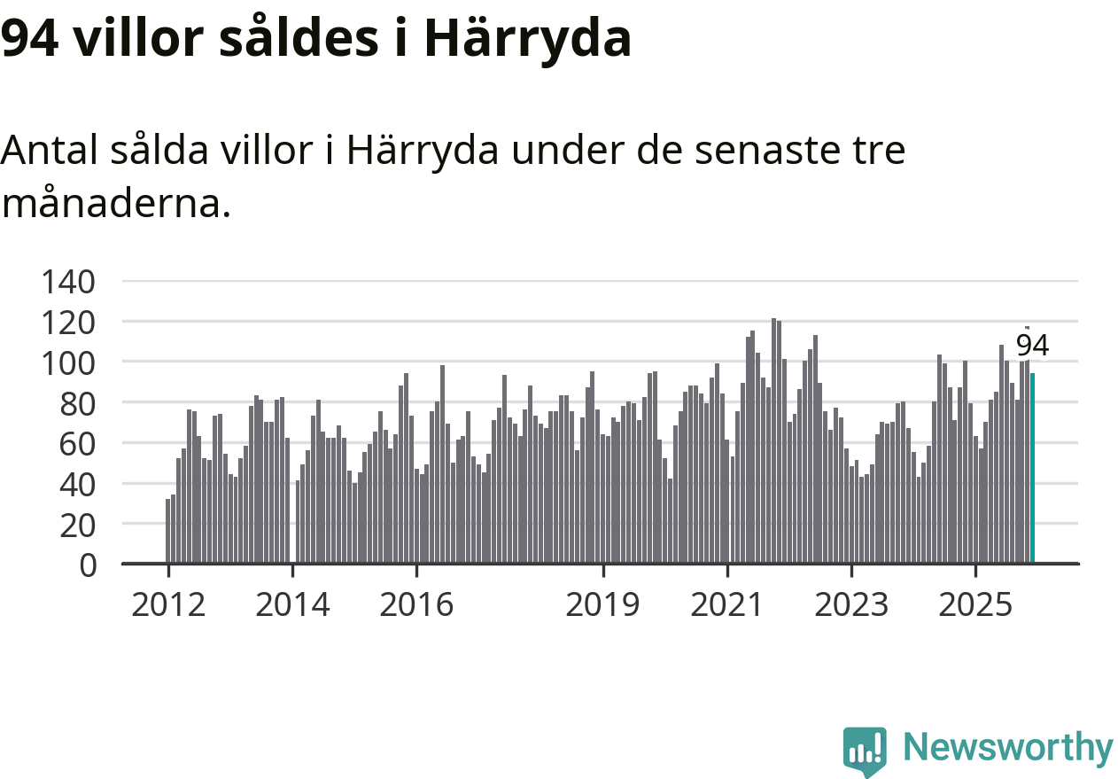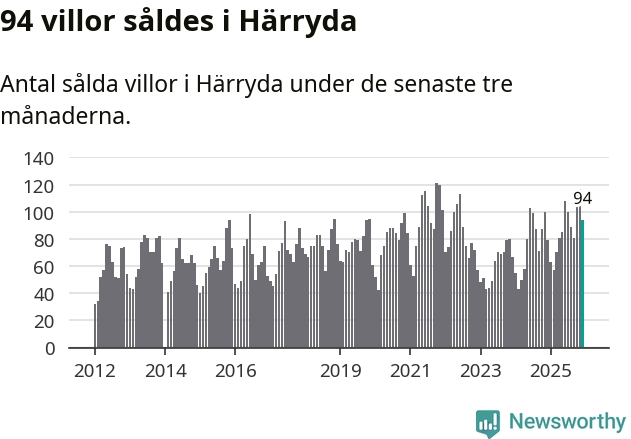 Sammanlagt såldes 94 villor i Härryda kommun mellan oktober och december till ett genomsnittligt pris på 5,0 miljoner kronor. I fjol gjordes 79 affärer vid den här tiden på året.