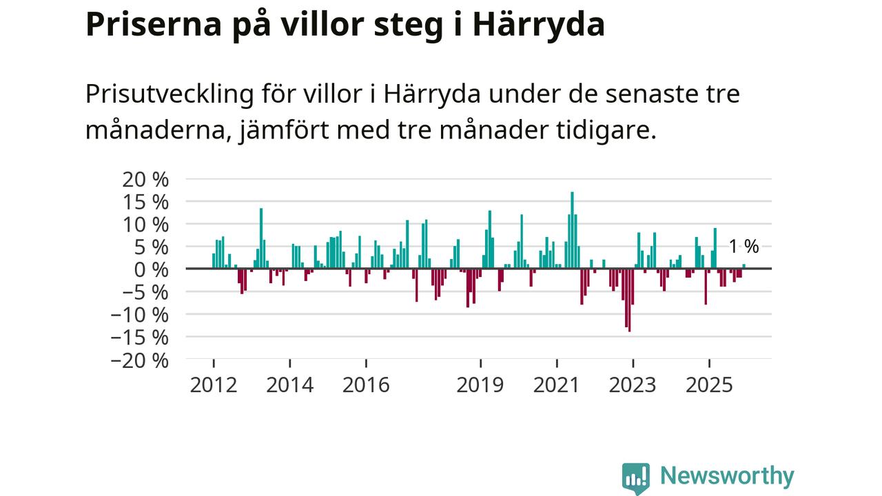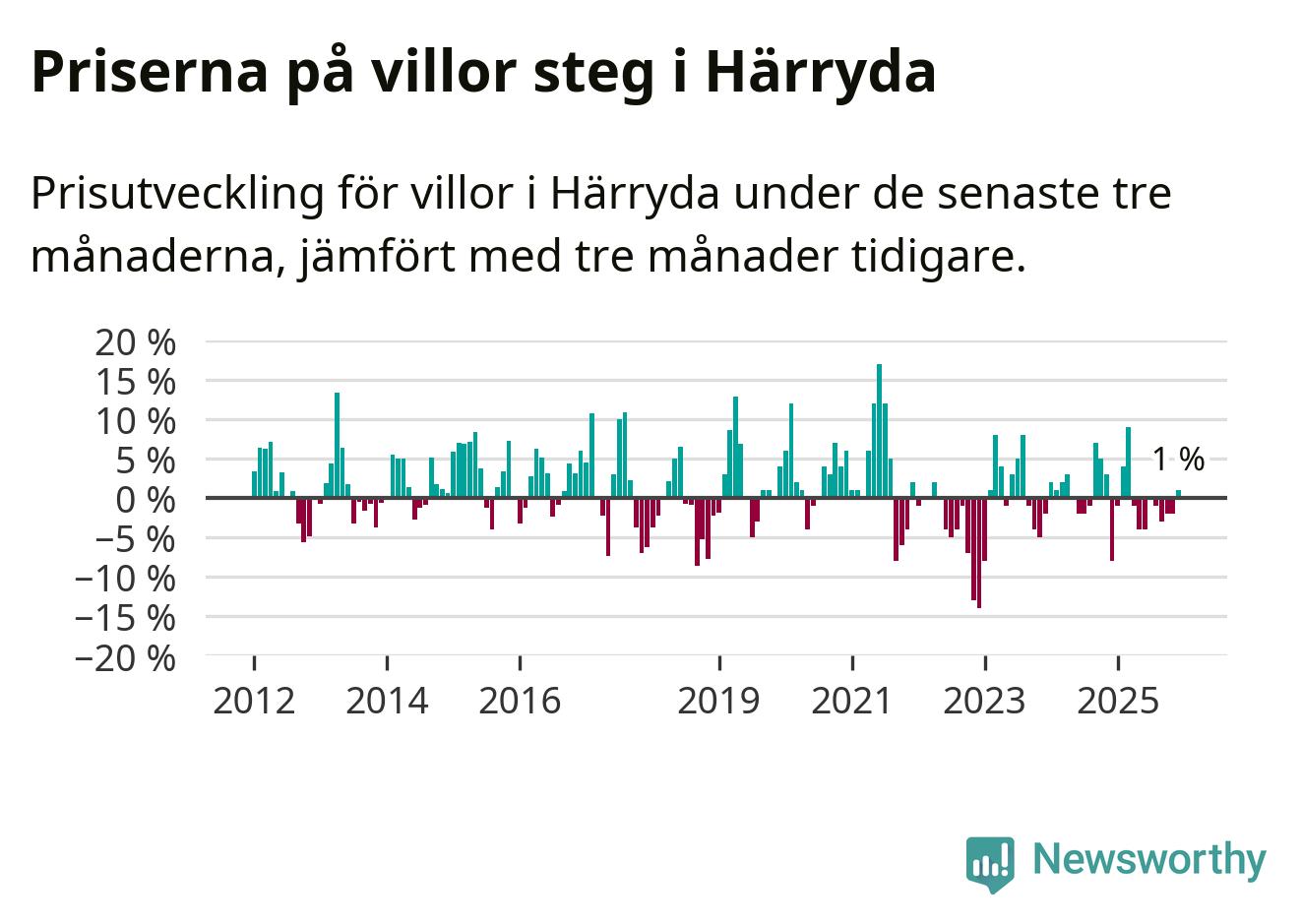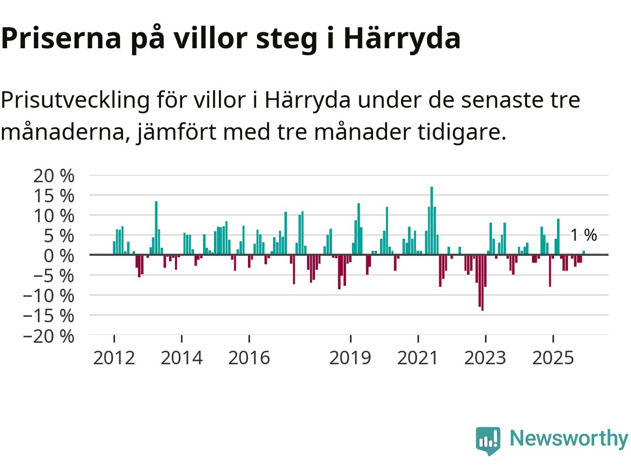 Villapriserna har gått upp i Härryda kommun. Medelpriset på försäljningarna under de senaste tre månaderna visar på en uppgång med 1 procent.