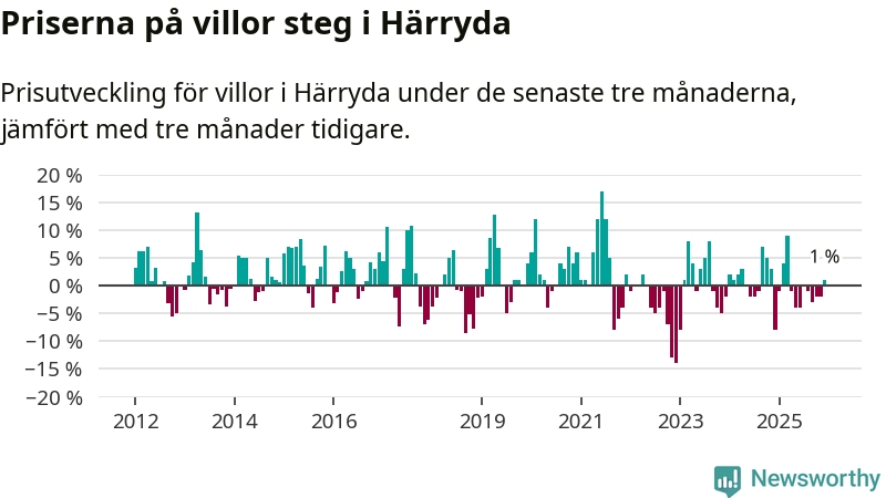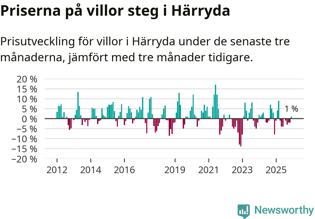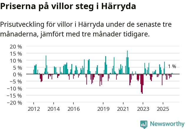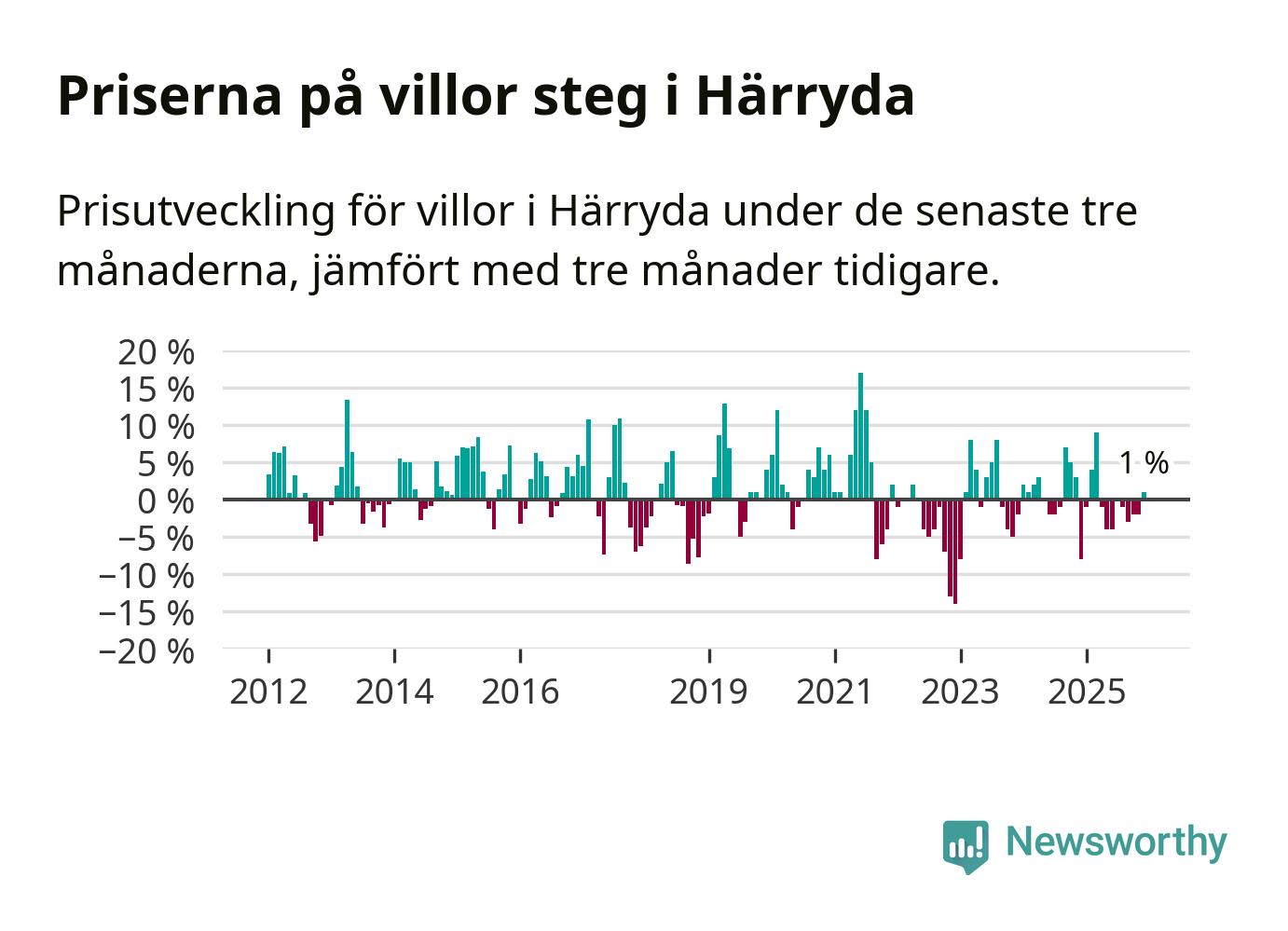 Villapriserna har gått upp i Härryda kommun. Medelpriset på försäljningarna under de senaste tre månaderna visar på en uppgång med 1 procent.