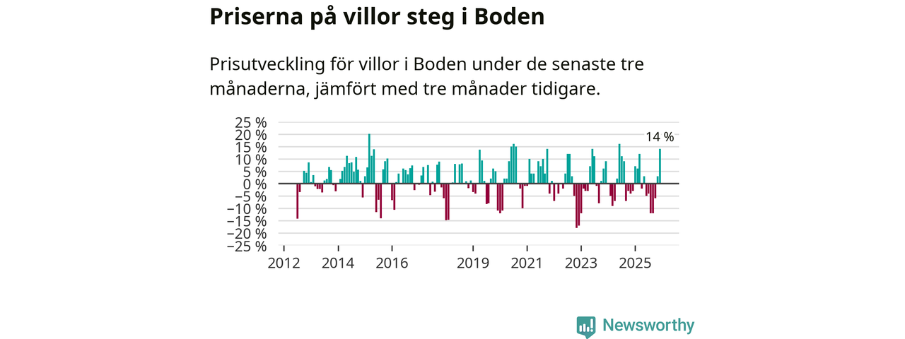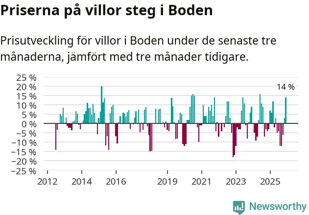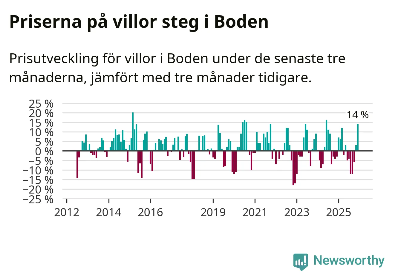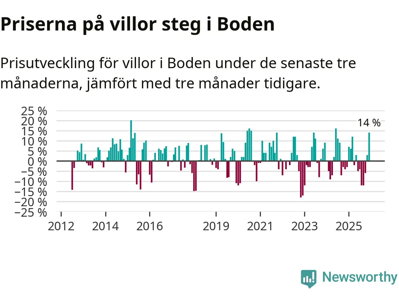Villapriserna steg mellan oktober och december med 14 procent i Bodens kommun. Det är en betydande uppgång jämfört med det gångna året då priserna i snitt stått stilla.