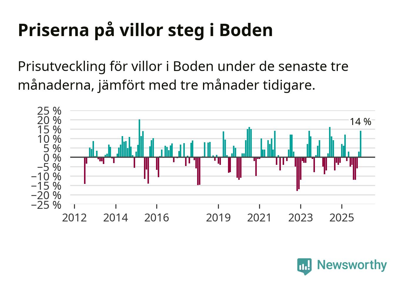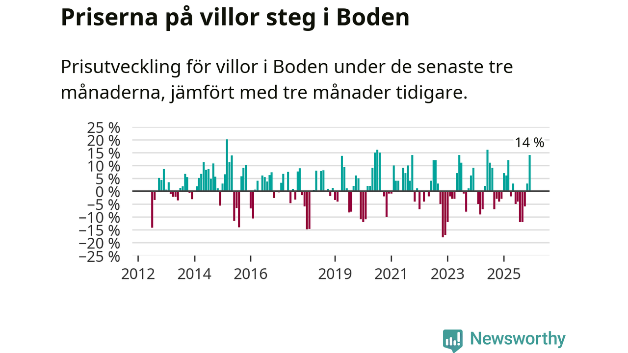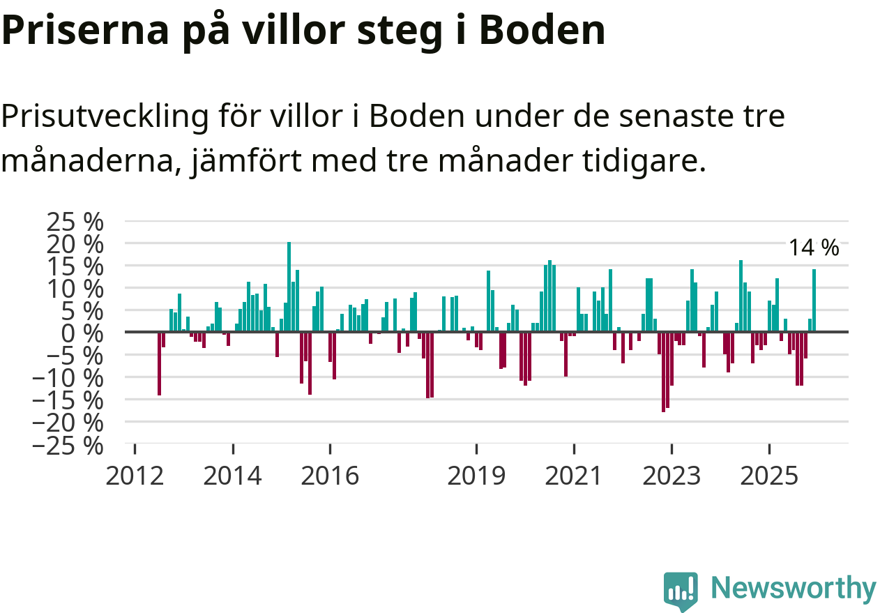 Villapriserna steg mellan oktober och december med 14 procent i Bodens kommun. Det är en betydande uppgång jämfört med det gångna året då priserna i snitt stått stilla.