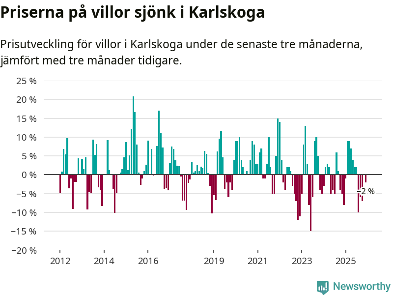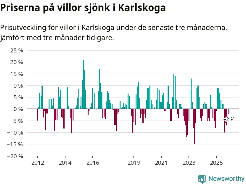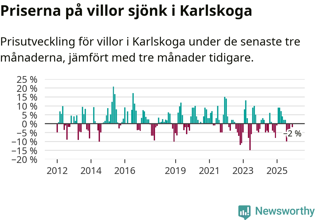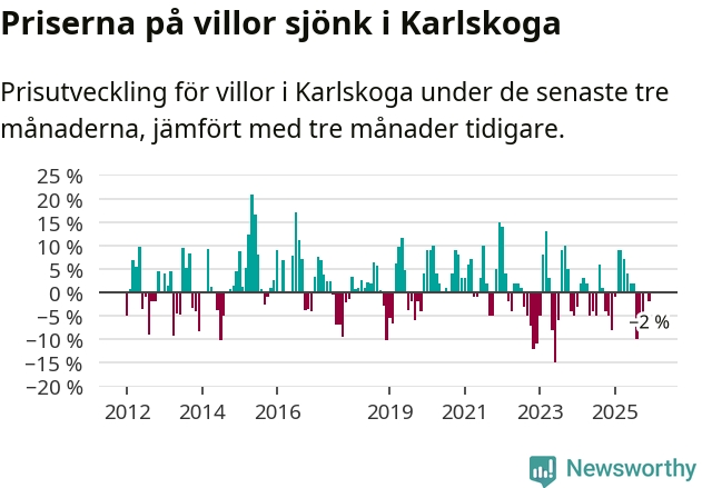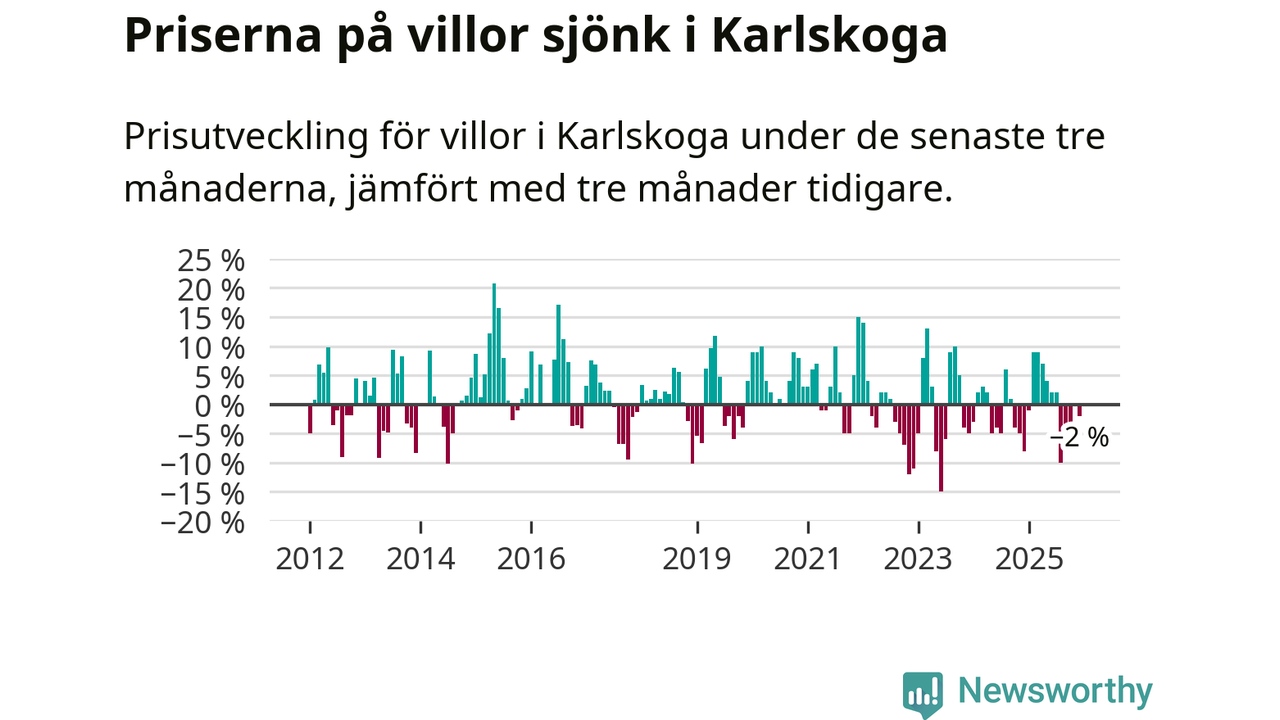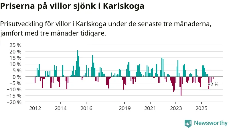 Villapriserna har gått ner i Karlskoga kommun. Medelpriset på försäljningarna under de senaste tre månaderna visar på en nedgång med 2 procent.
