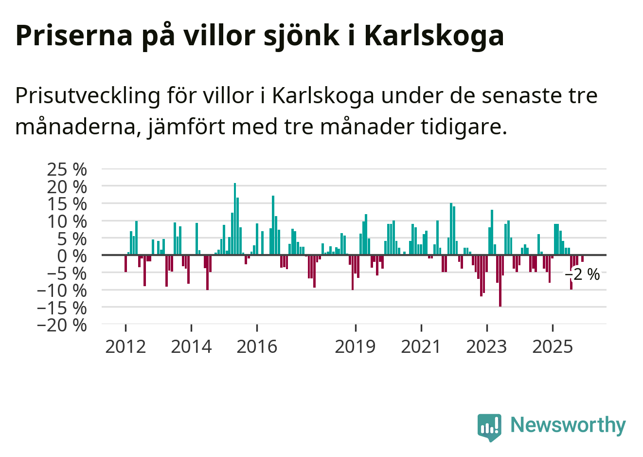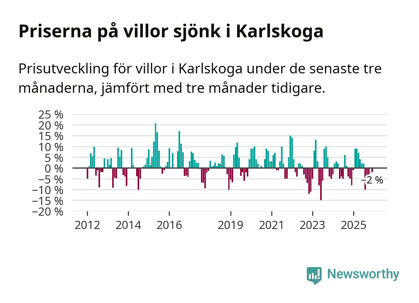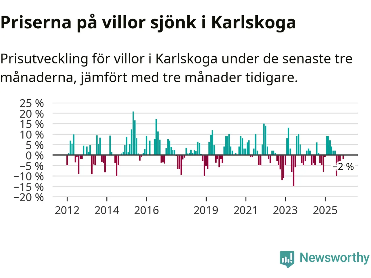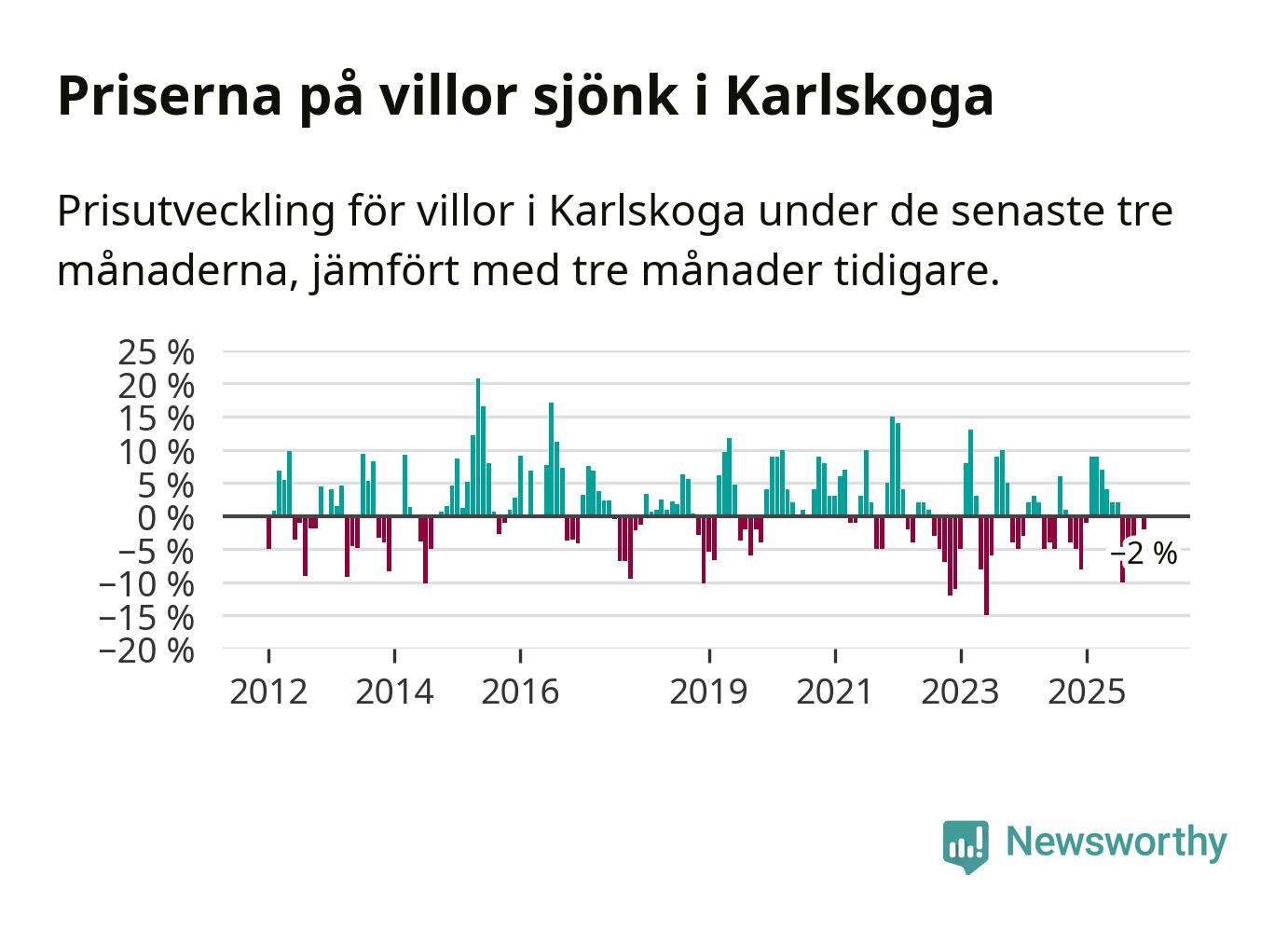 Villapriserna har gått ner i Karlskoga kommun. Medelpriset på försäljningarna under de senaste tre månaderna visar på en nedgång med 2 procent.