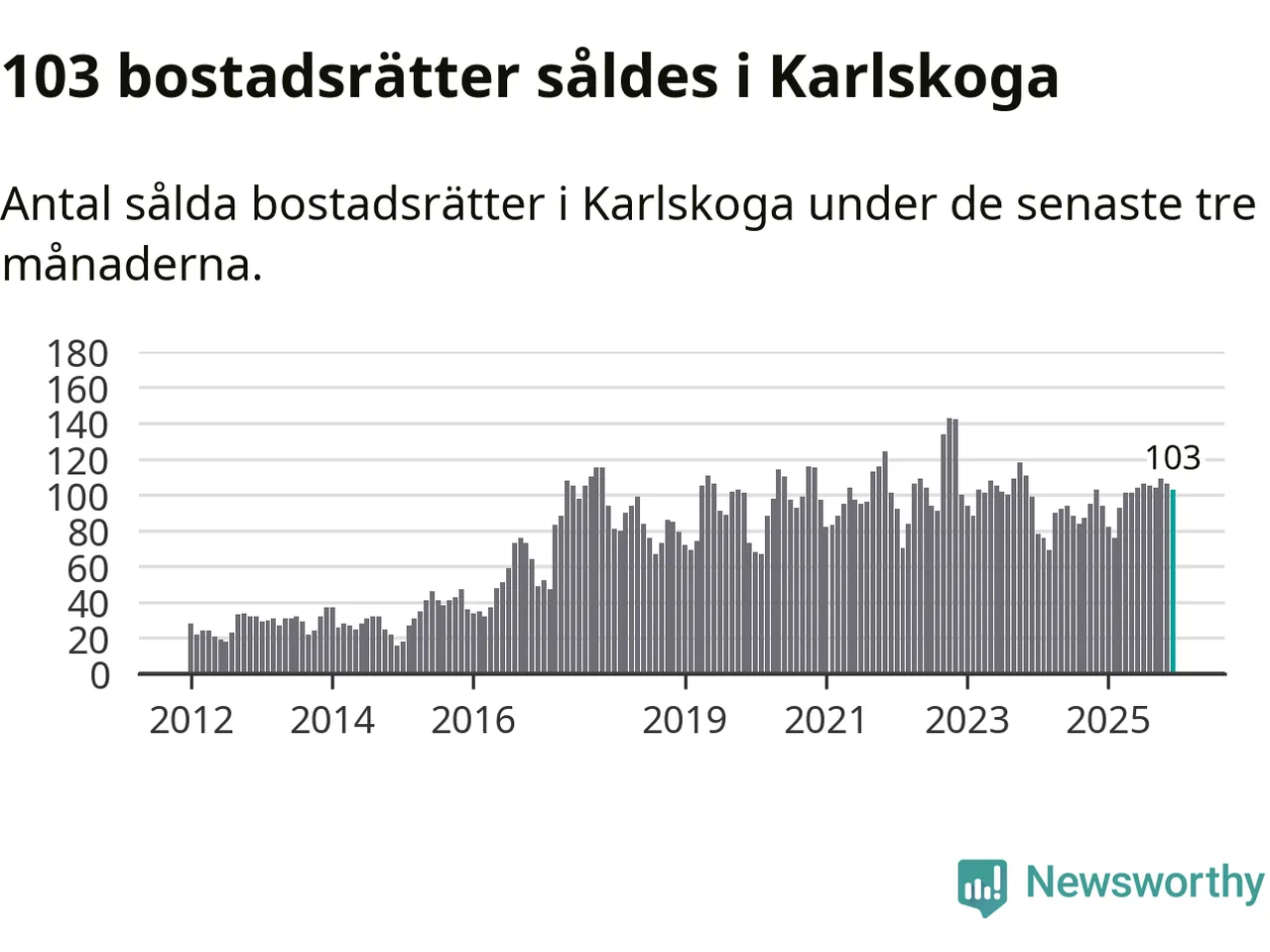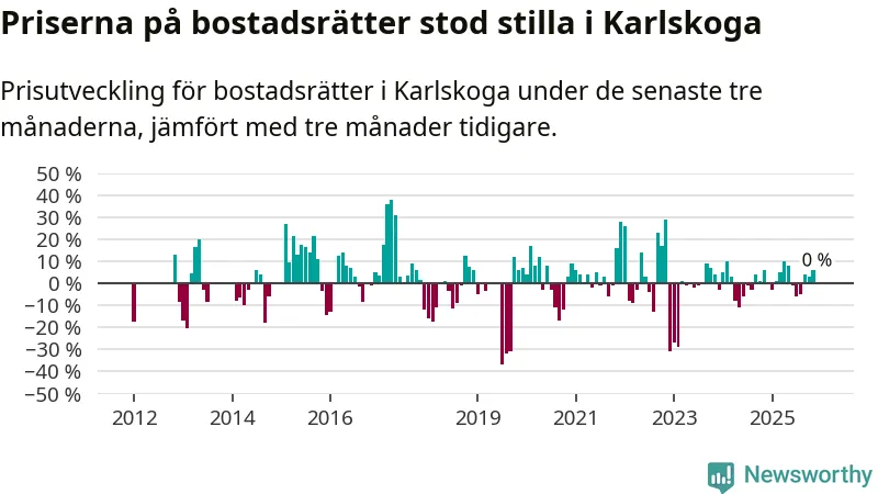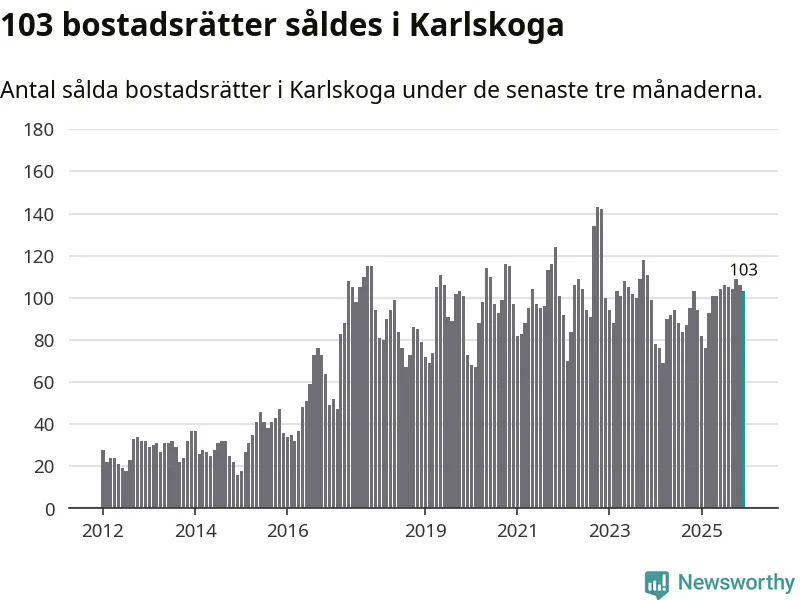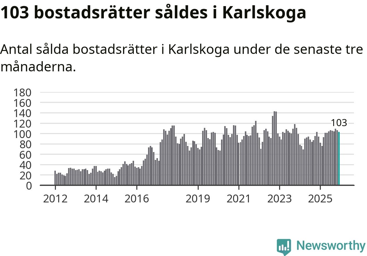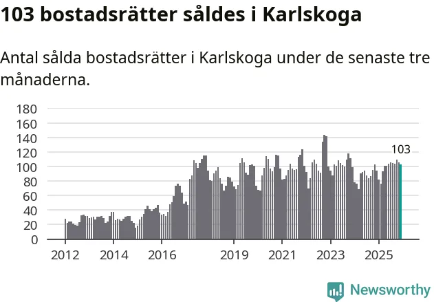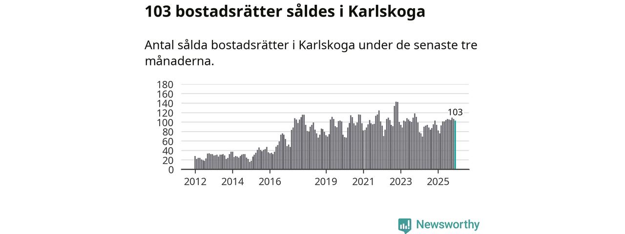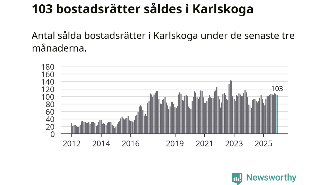 Sammanlagt såldes 103 bostadsrätter i Karlskoga kommun mellan oktober och december till ett genomsnittligt pris på 0,6 miljoner kronor. I fjol gjordes 94 affärer vid den här tiden på året.