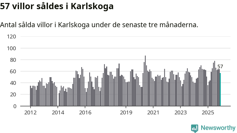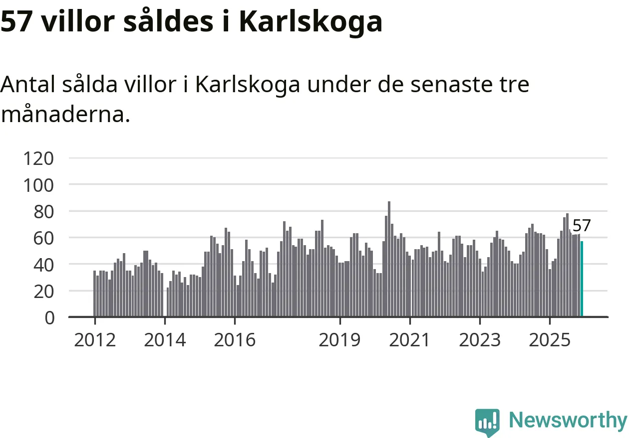 Sammanlagt såldes 57 villor i Karlskoga kommun mellan oktober och december till ett genomsnittligt pris på 2,0 miljoner kronor. I fjol gjordes 51 affärer vid den här tiden på året.