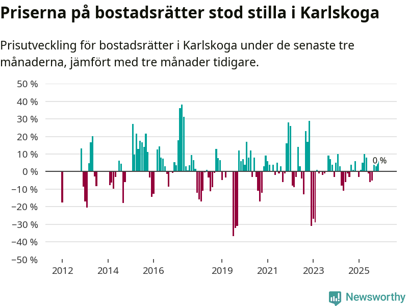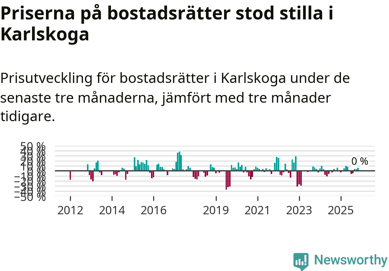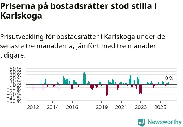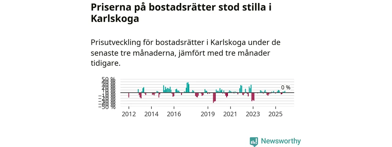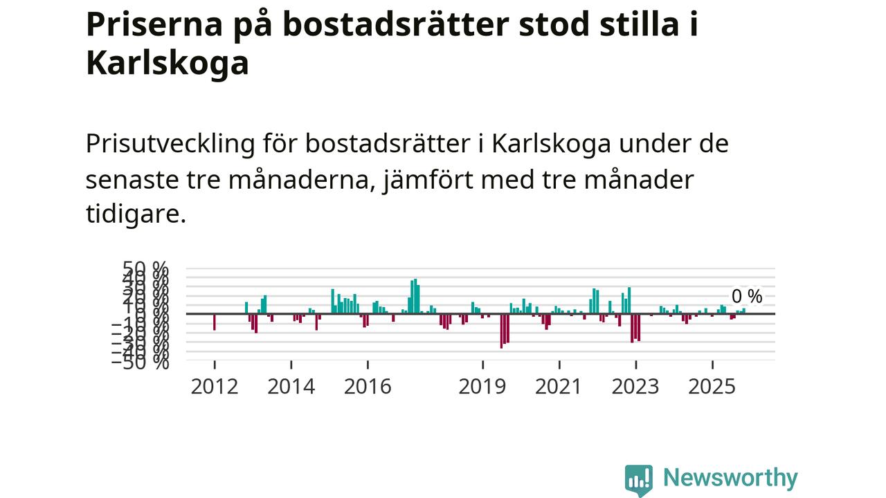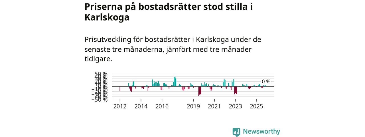 Priserna på bostadsrätter står i stort sett stilla i Karlskoga kommun. Medelpriset på de på försäljningarna under de senaste tre månaderna låg på samma nivå som för tre månader sedan.