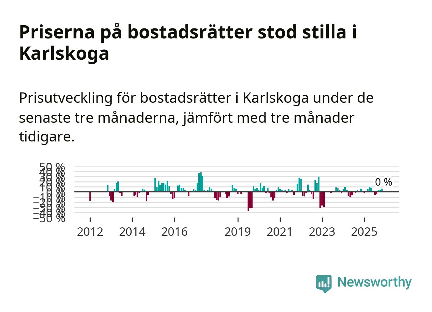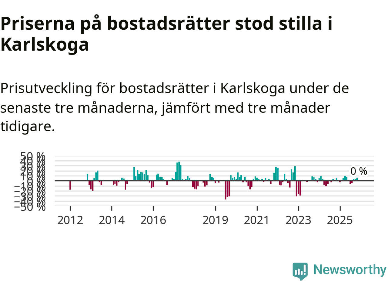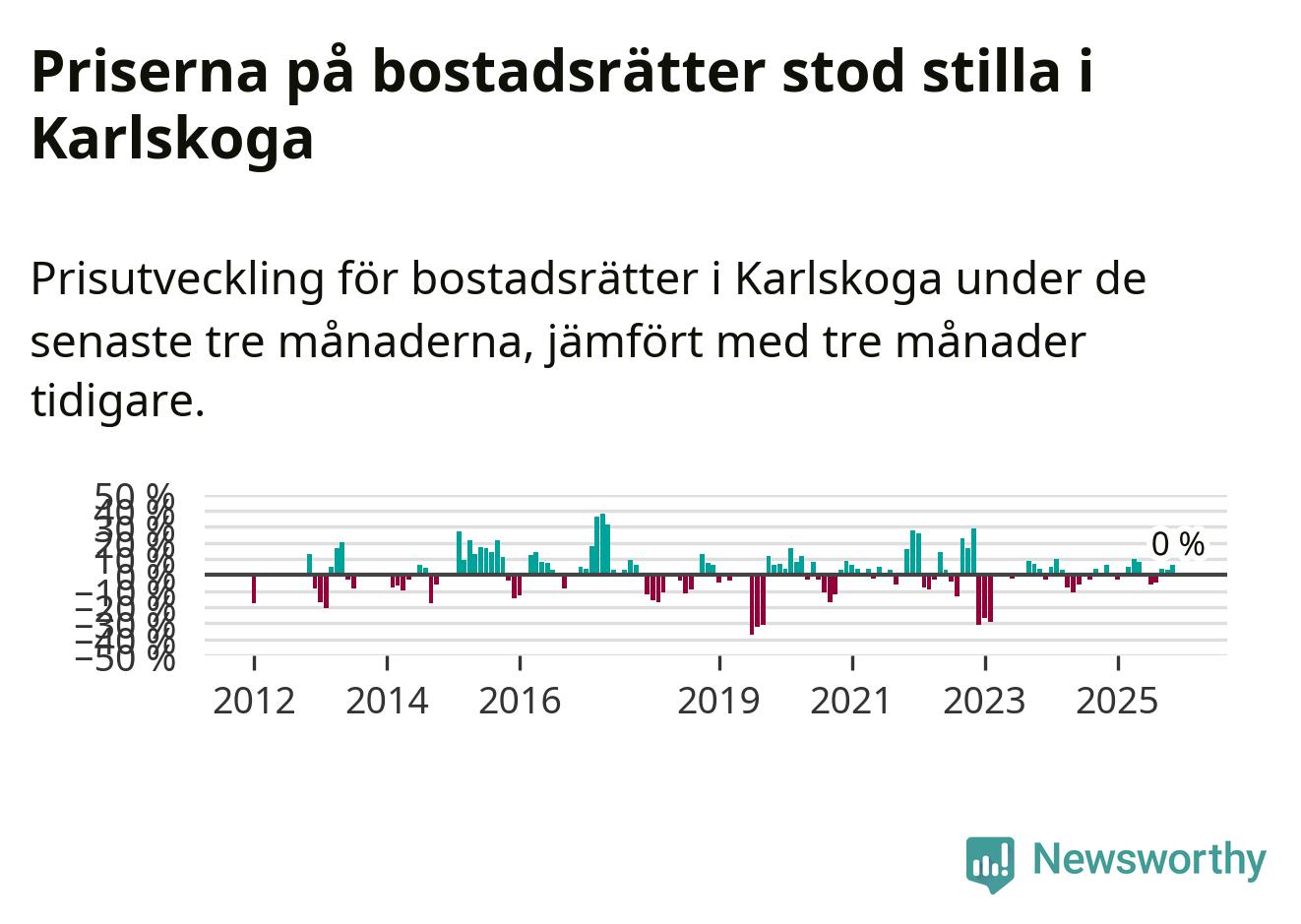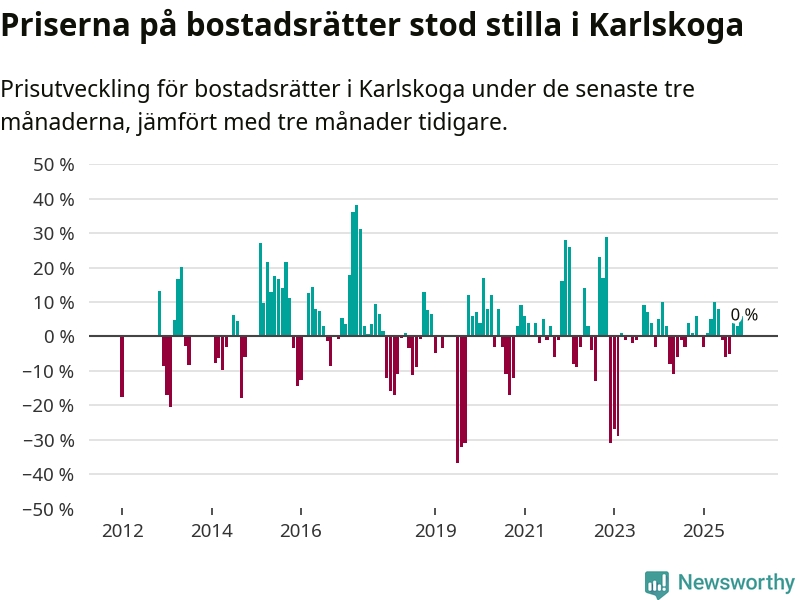 Priserna på bostadsrätter står i stort sett stilla i Karlskoga kommun. Medelpriset på de på försäljningarna under de senaste tre månaderna låg på samma nivå som för tre månader sedan.