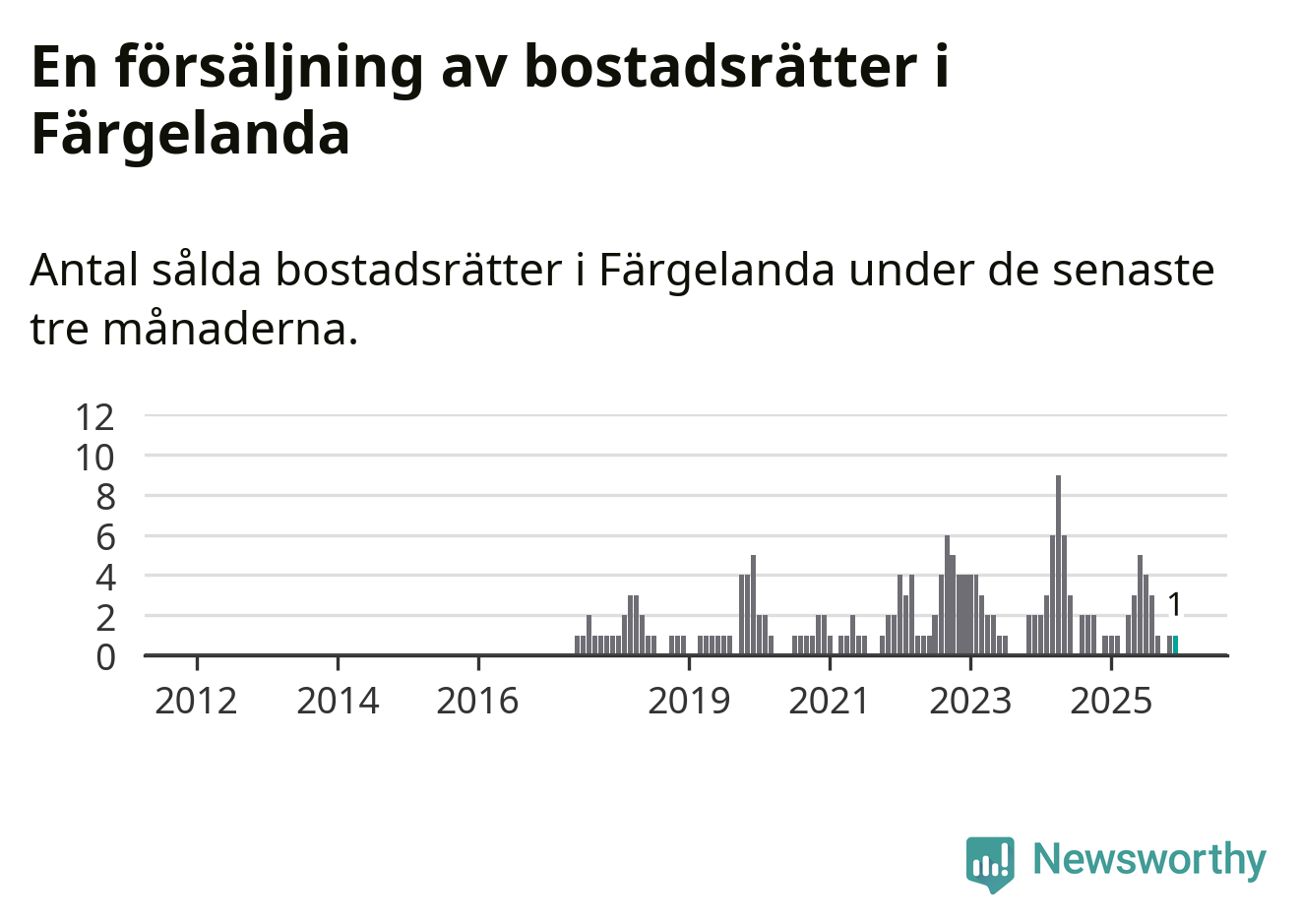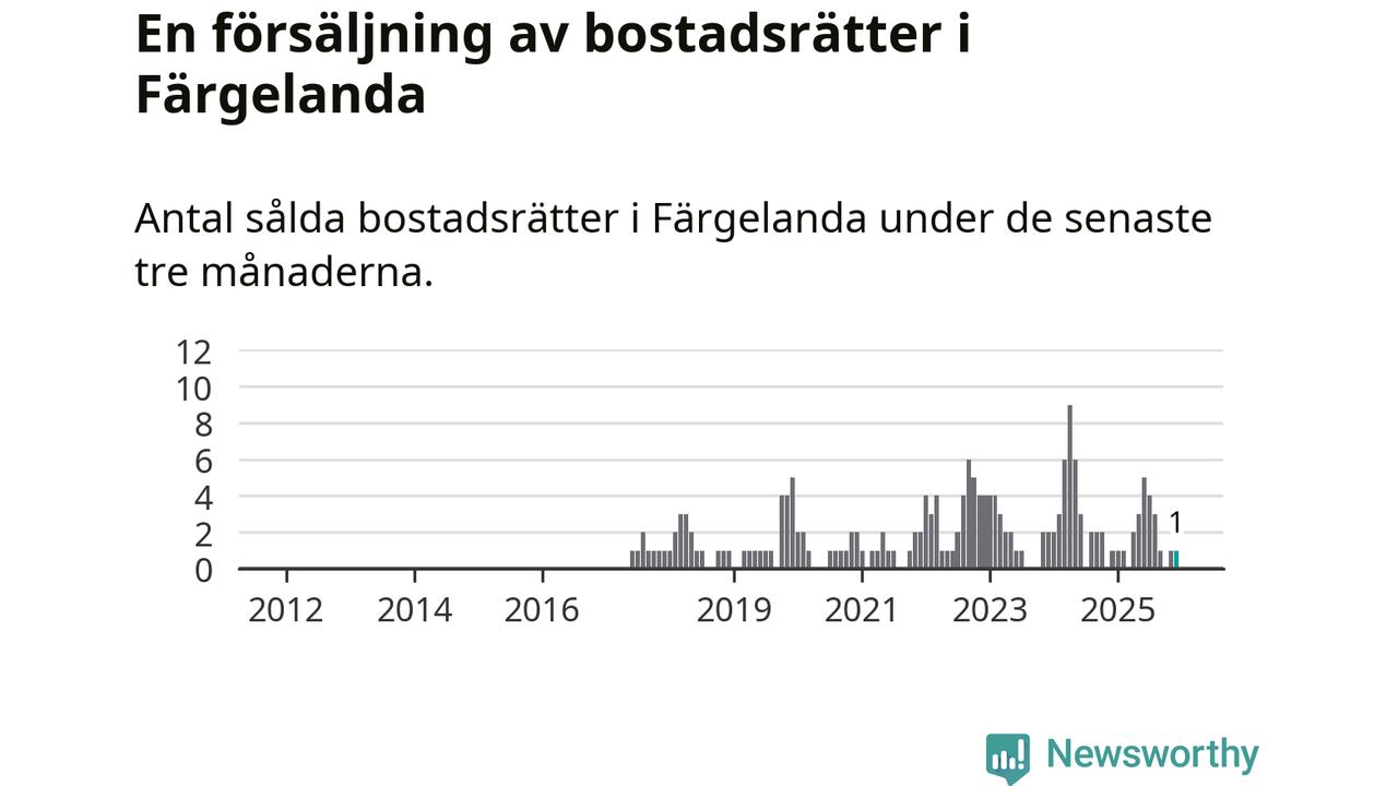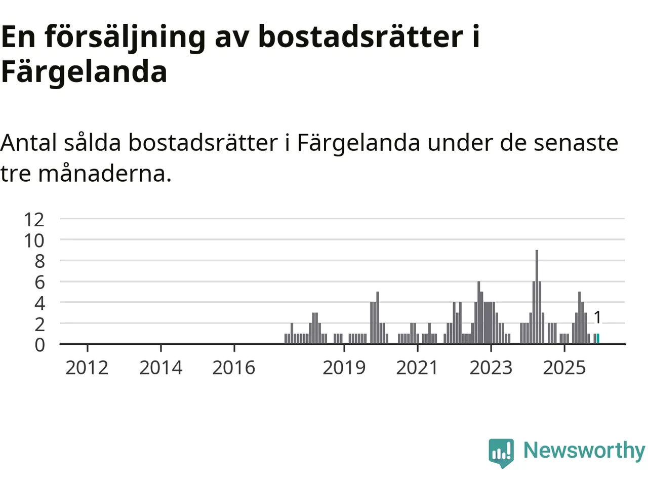 Mellan oktober och december gjordes sammanlagt en affär med bostadsrätter i Färgelanda kommun. Det är lika många affärer som vid motsvarande tid i fjol.