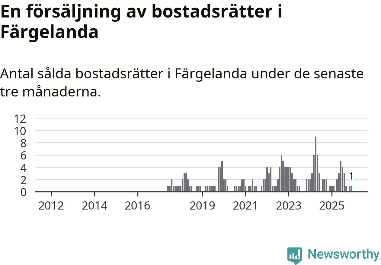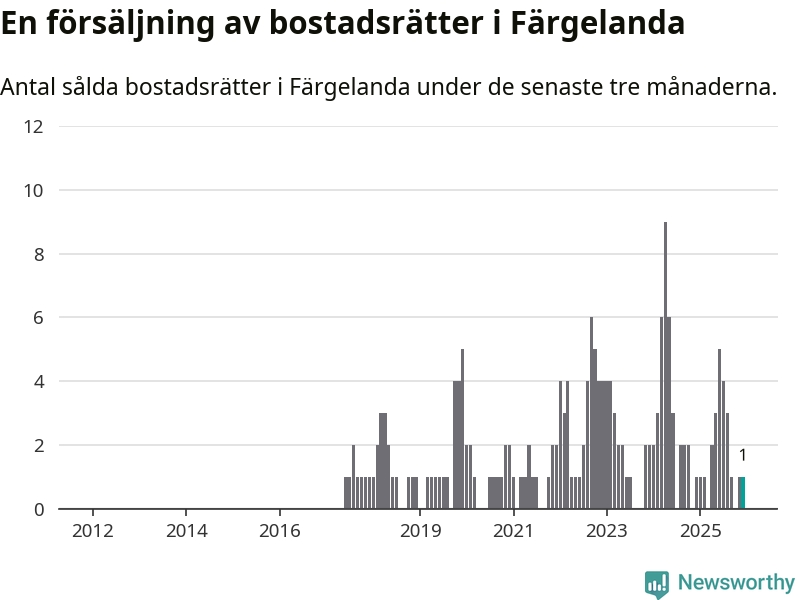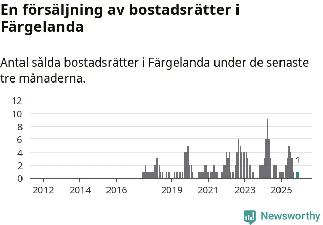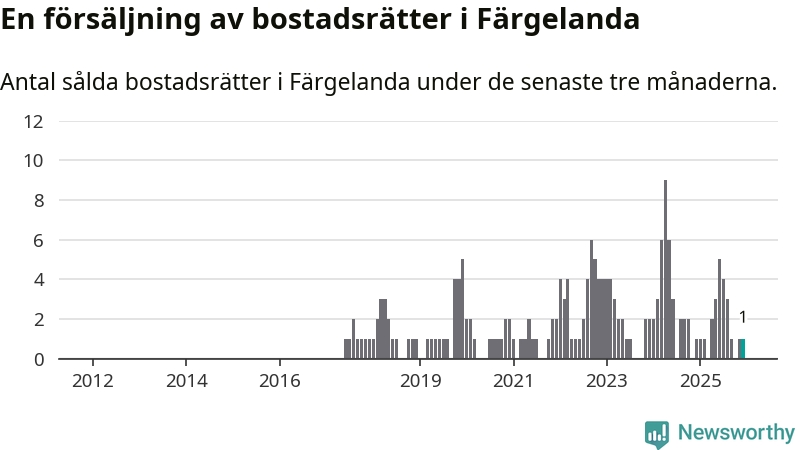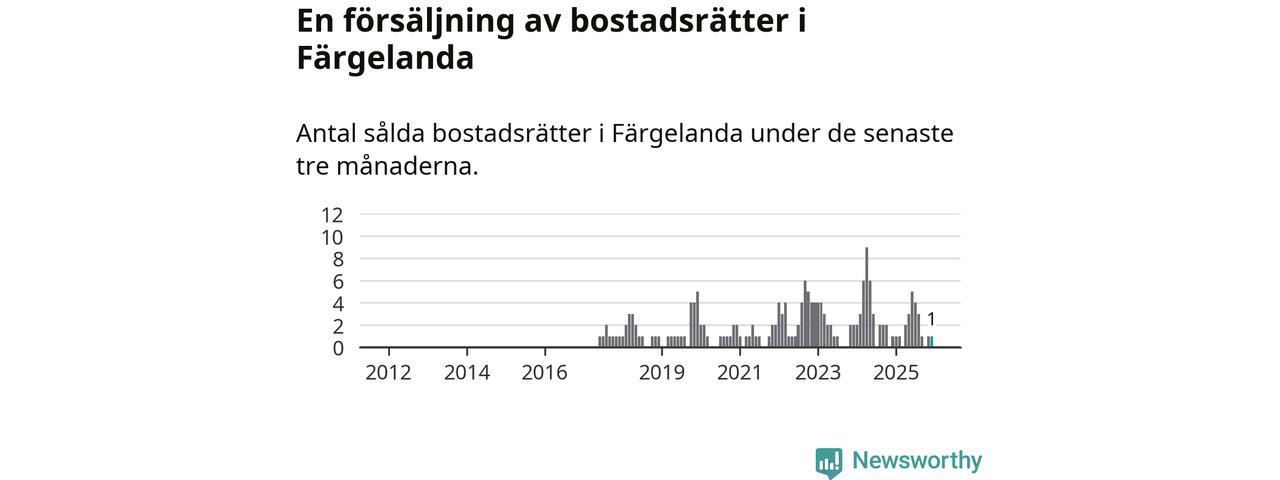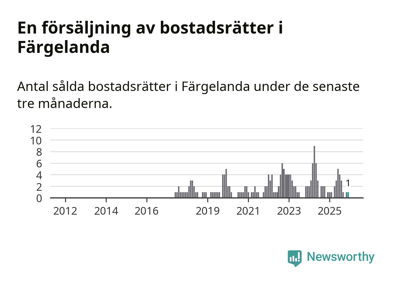 Mellan oktober och december gjordes sammanlagt en affär med bostadsrätter i Färgelanda kommun. Det är lika många affärer som vid motsvarande tid i fjol.
