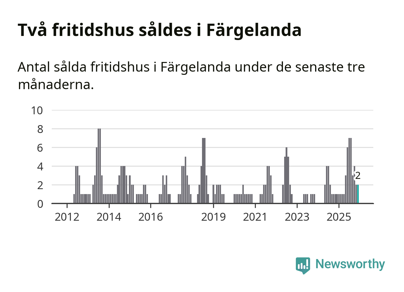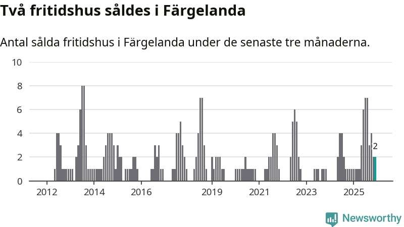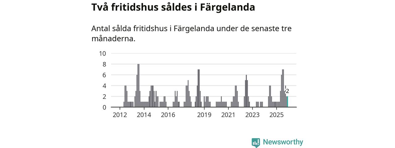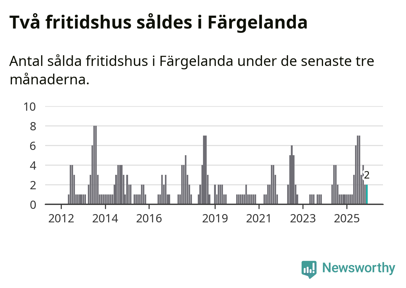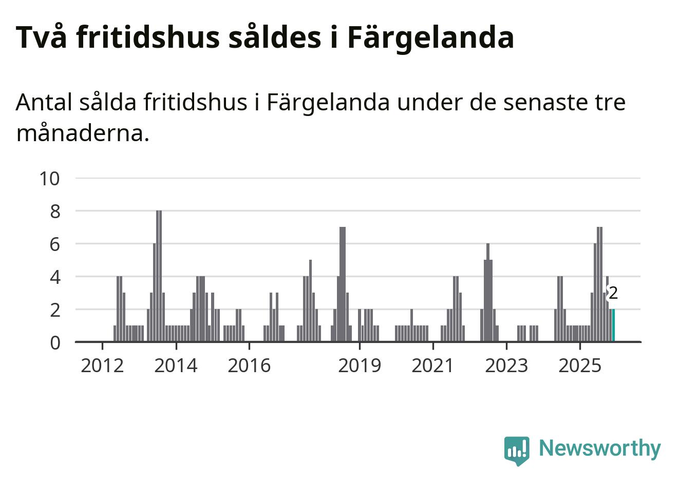Mellan oktober och december gjordes sammanlagt två affärer med fritidshus i Färgelanda kommun. Det kan jämföras med ett vid motsvarande tid i fjol.
