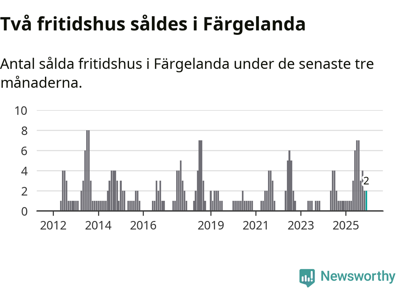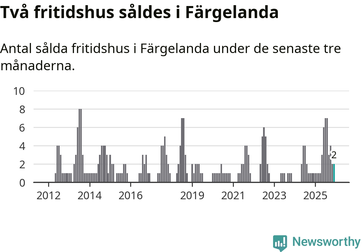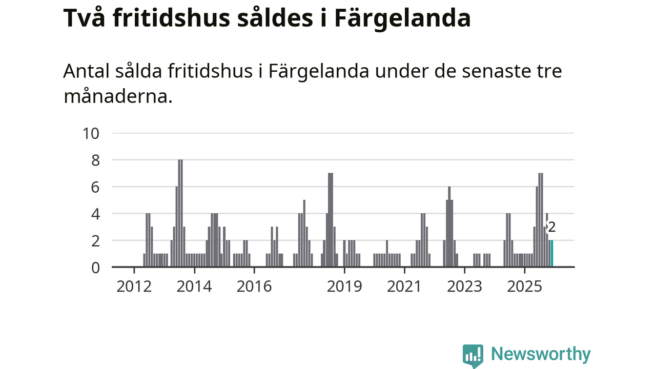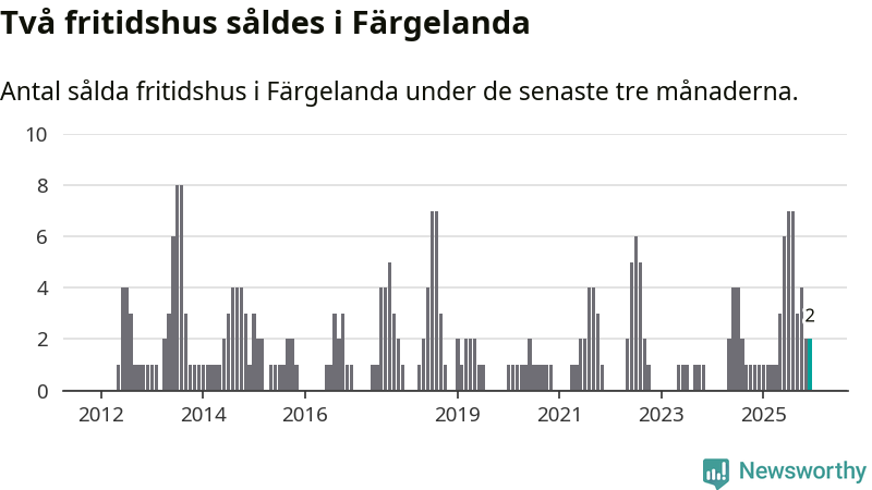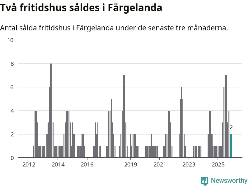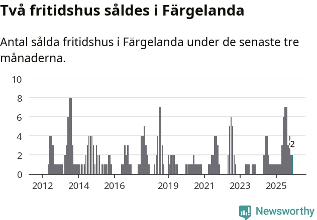 Mellan oktober och december gjordes sammanlagt två affärer med fritidshus i Färgelanda kommun. Det kan jämföras med ett vid motsvarande tid i fjol.