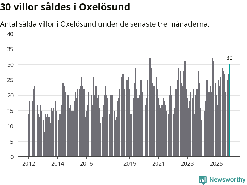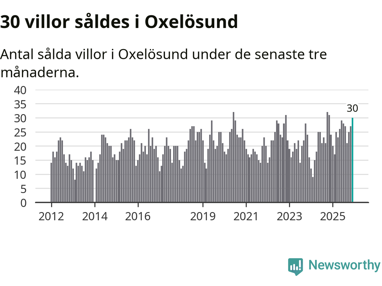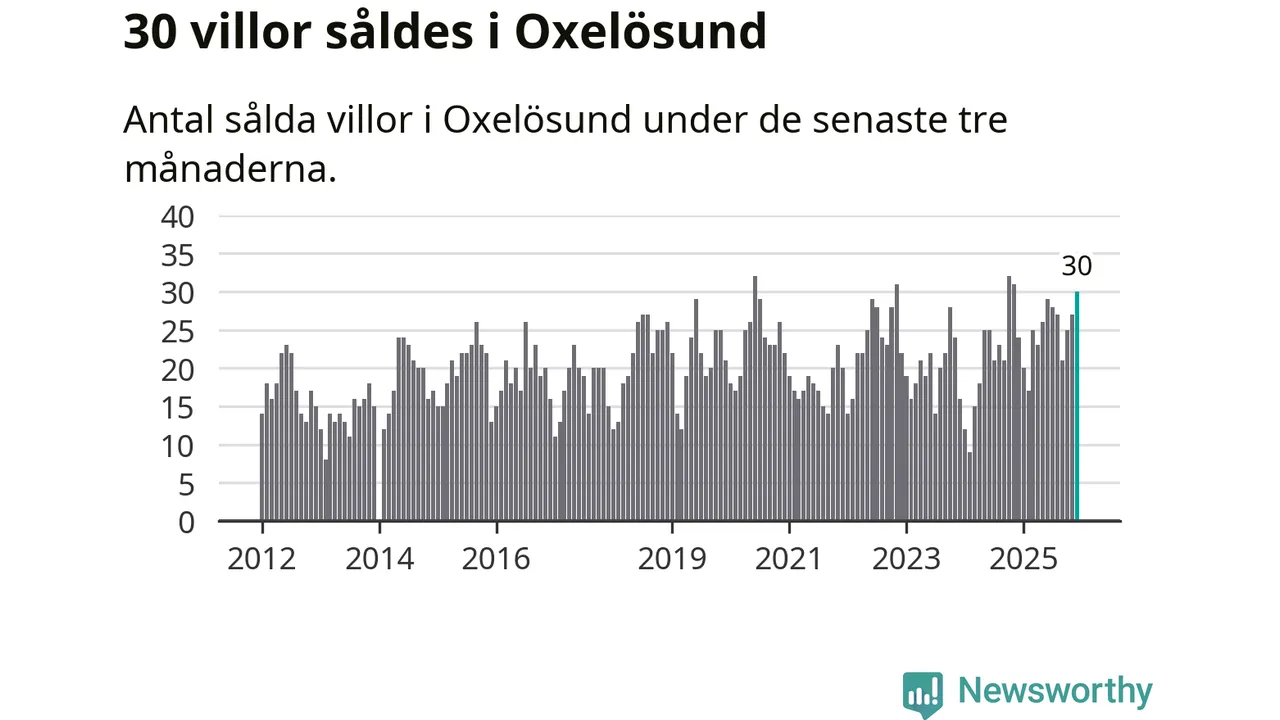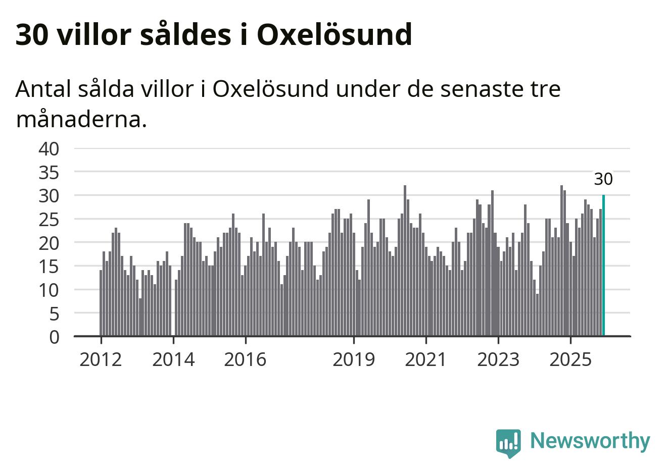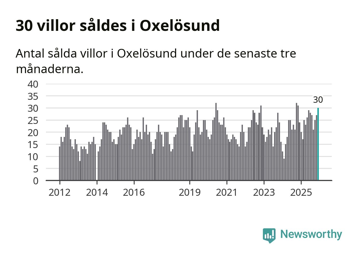 Mellan oktober och december såldes 30 villor i Oxelösunds kommun. Det är relativt många sett till aktiviteten på bostadsmarknaden i kommunen under de senaste tolv månaderna, samt det historiska snittet för den här tiden på året.