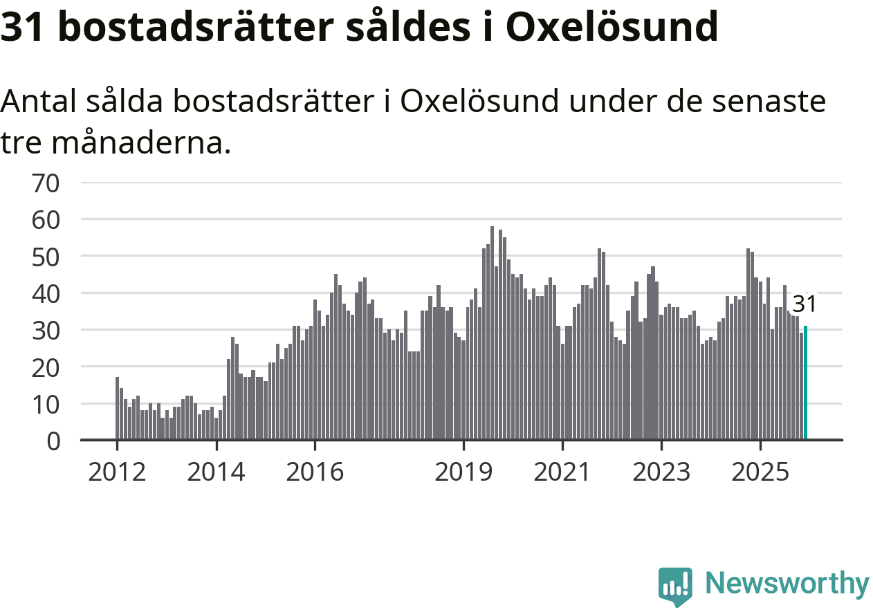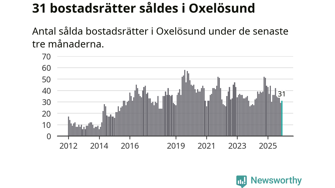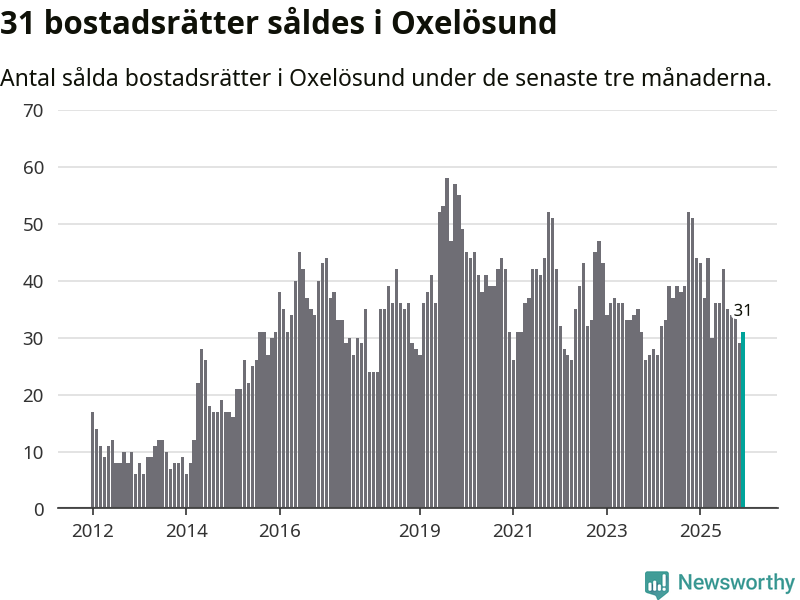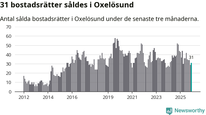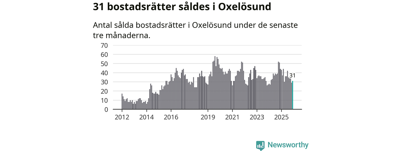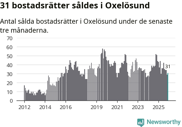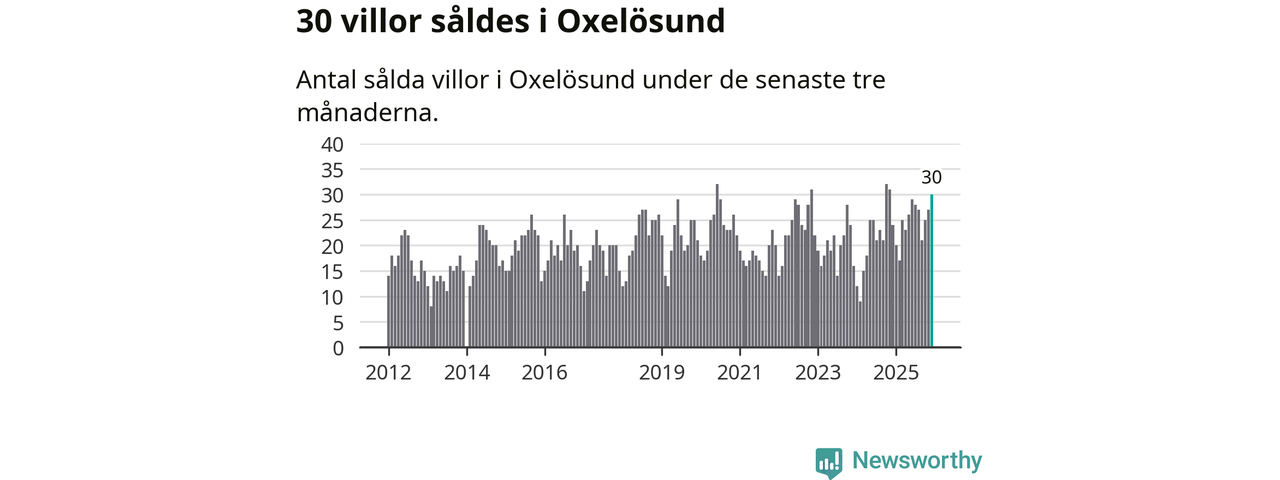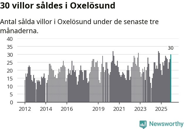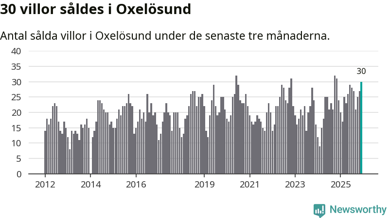 Mellan oktober och december såldes 30 villor i Oxelösunds kommun. Det är relativt många sett till aktiviteten på bostadsmarknaden i kommunen under de senaste tolv månaderna, samt det historiska snittet för den här tiden på året.