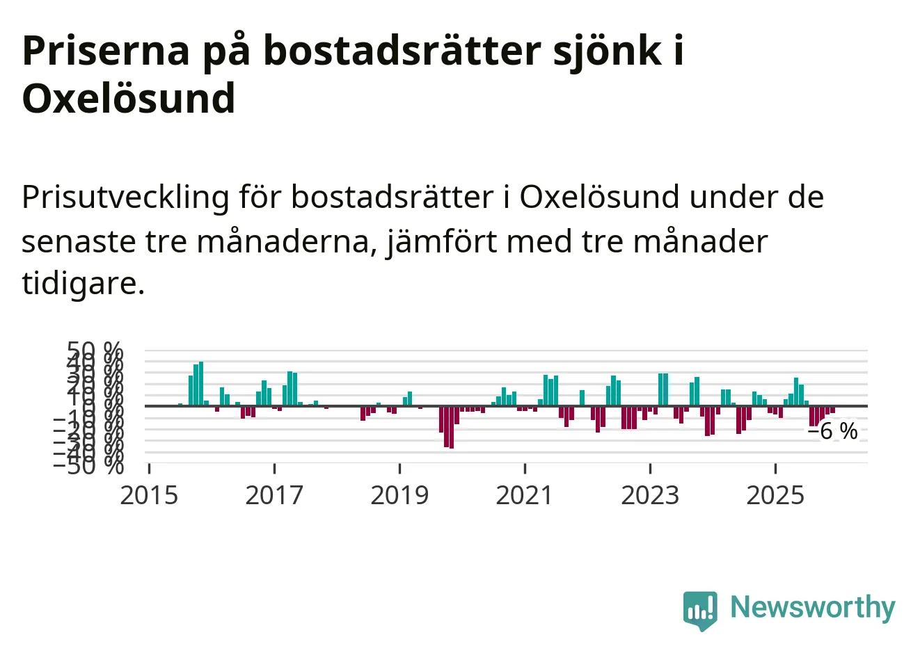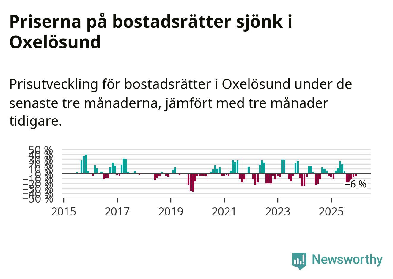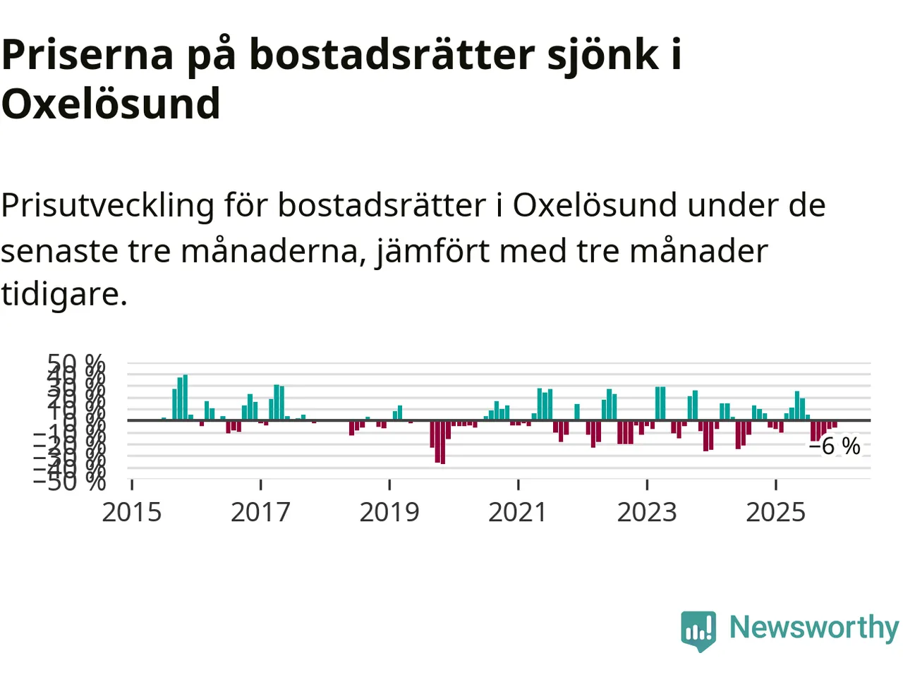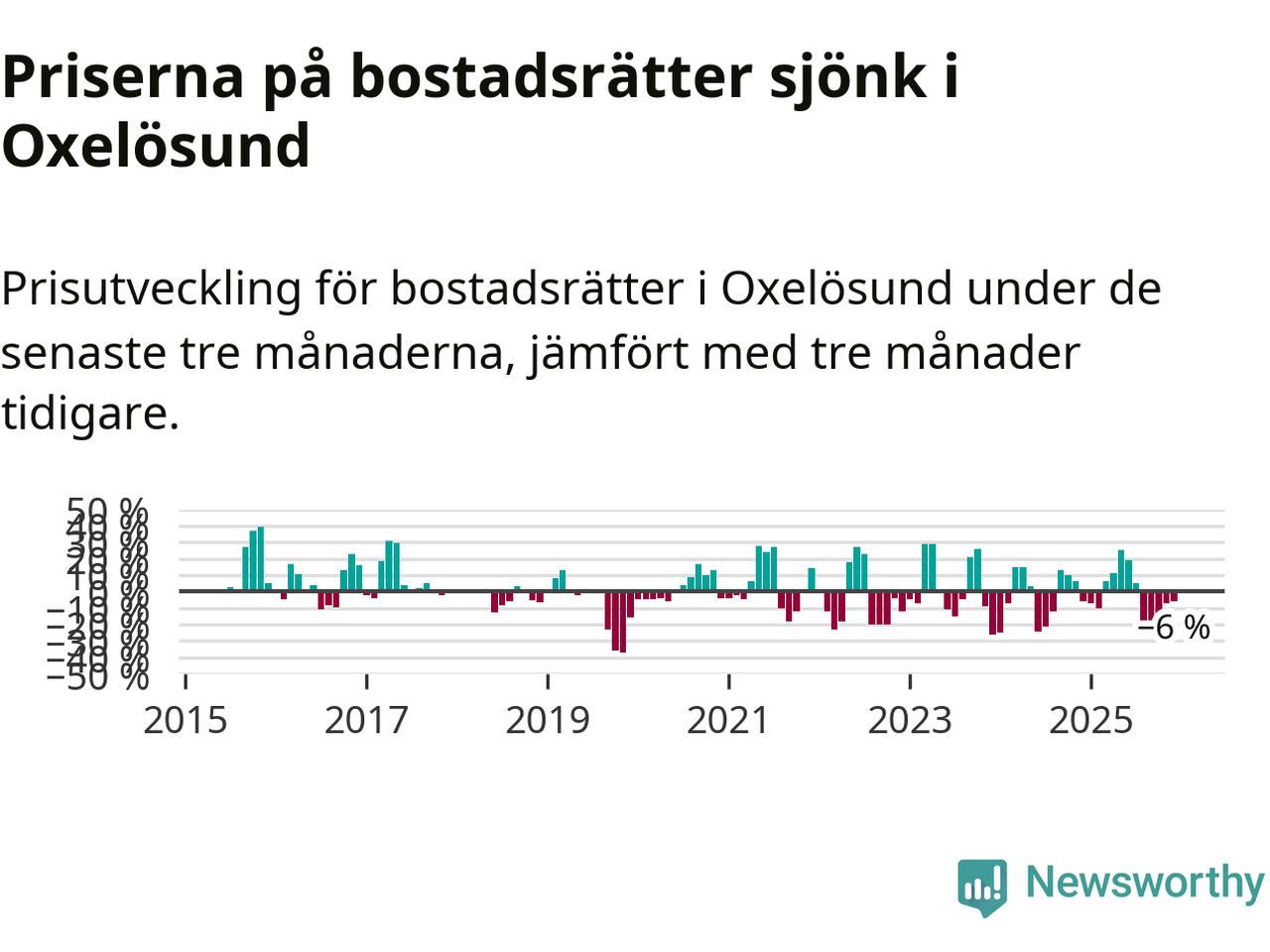 Priserna på bostadsrätter har gått ner i Oxelösunds kommun. Medelpriset på försäljningarna under de senaste tre månaderna visar på en nedgång med 6 procent.