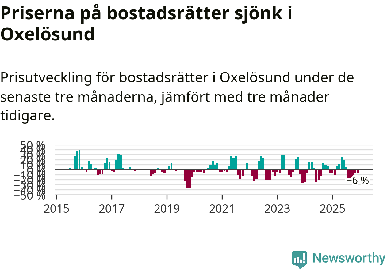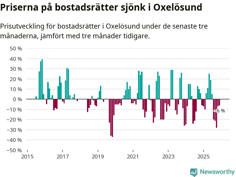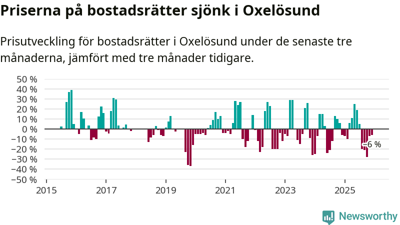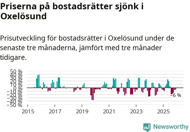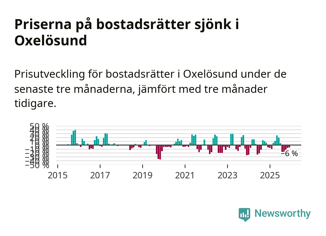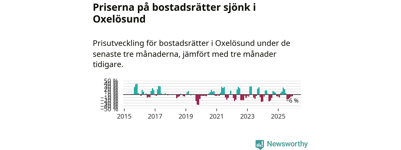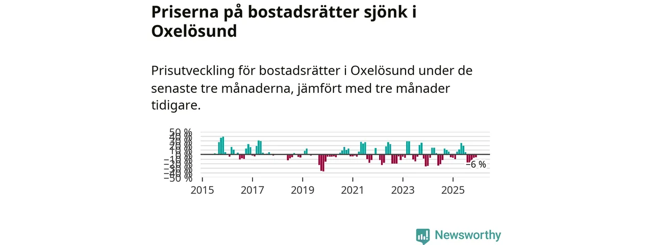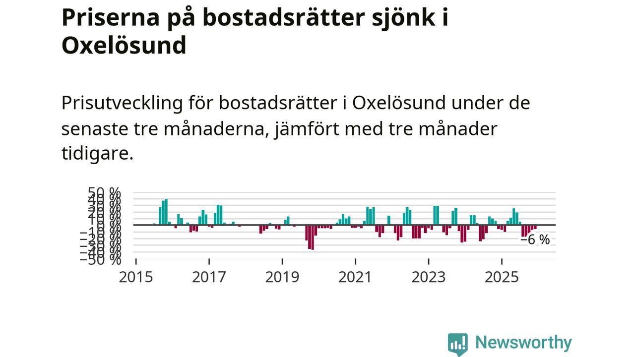 Priserna på bostadsrätter har gått ner i Oxelösunds kommun. Medelpriset på försäljningarna under de senaste tre månaderna visar på en nedgång med 6 procent.
