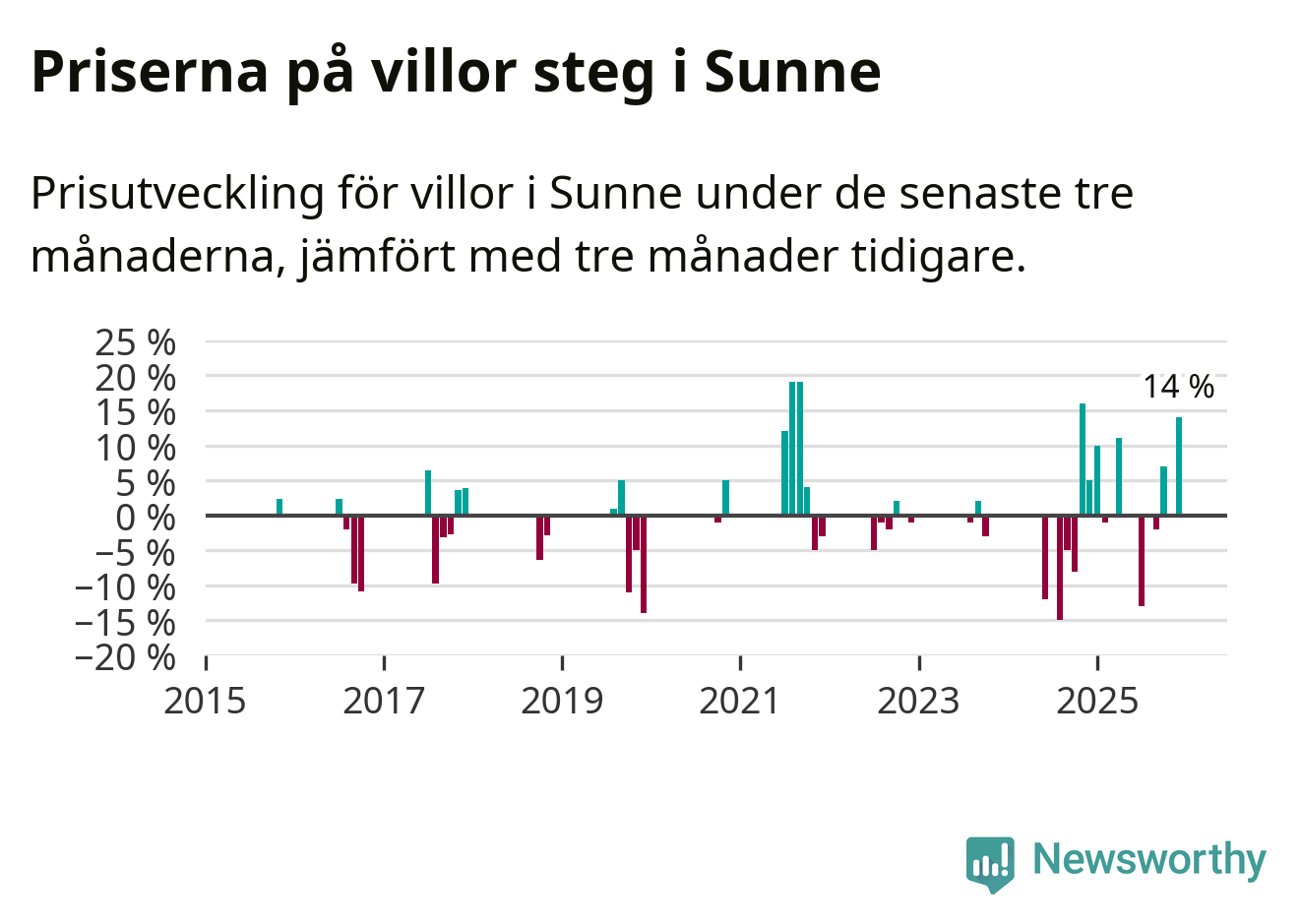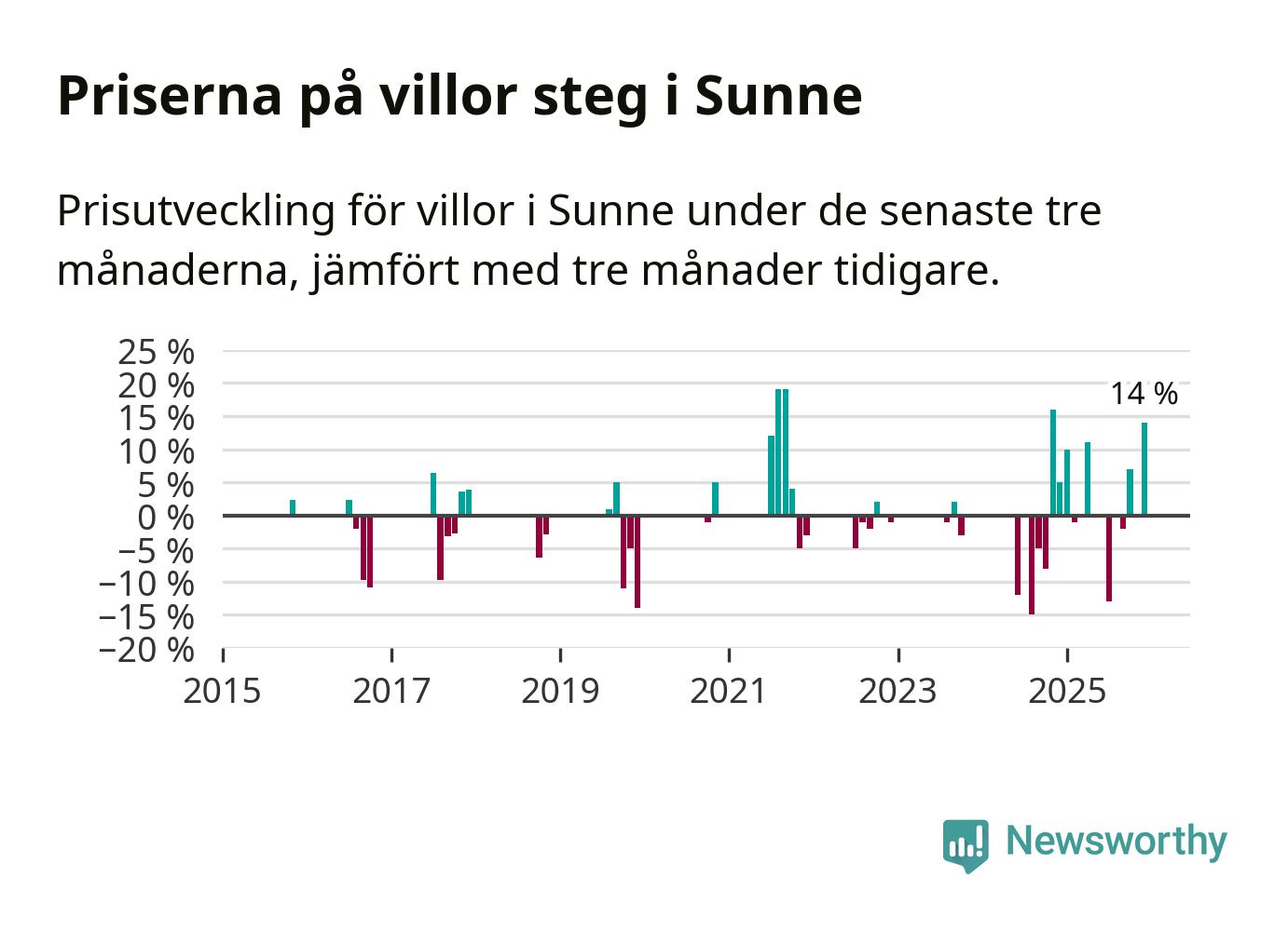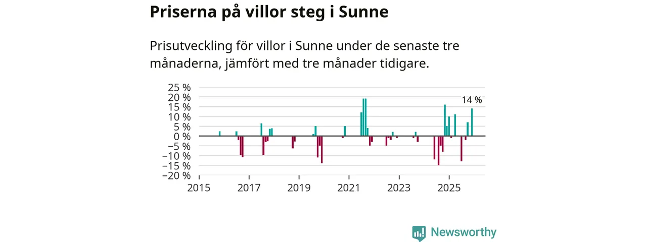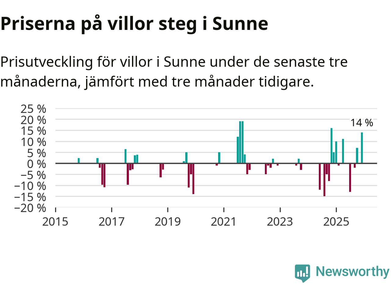 Statistiken visar även på en stor prisuppgång i Sunne kommun. Medelpriset på försäljningarna av villor i kommunen var 14 procent högre än för tre månader sedan. I hela Värmland däremot sjunker villapriserna. I hela länet noterades en prisnedgång på 3 procent.