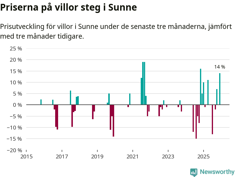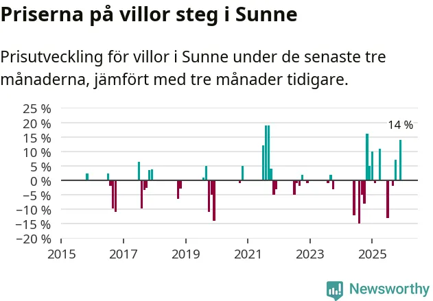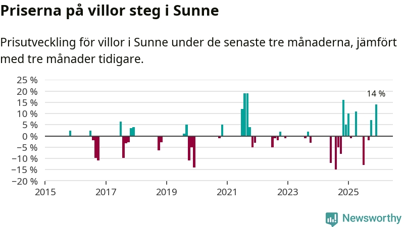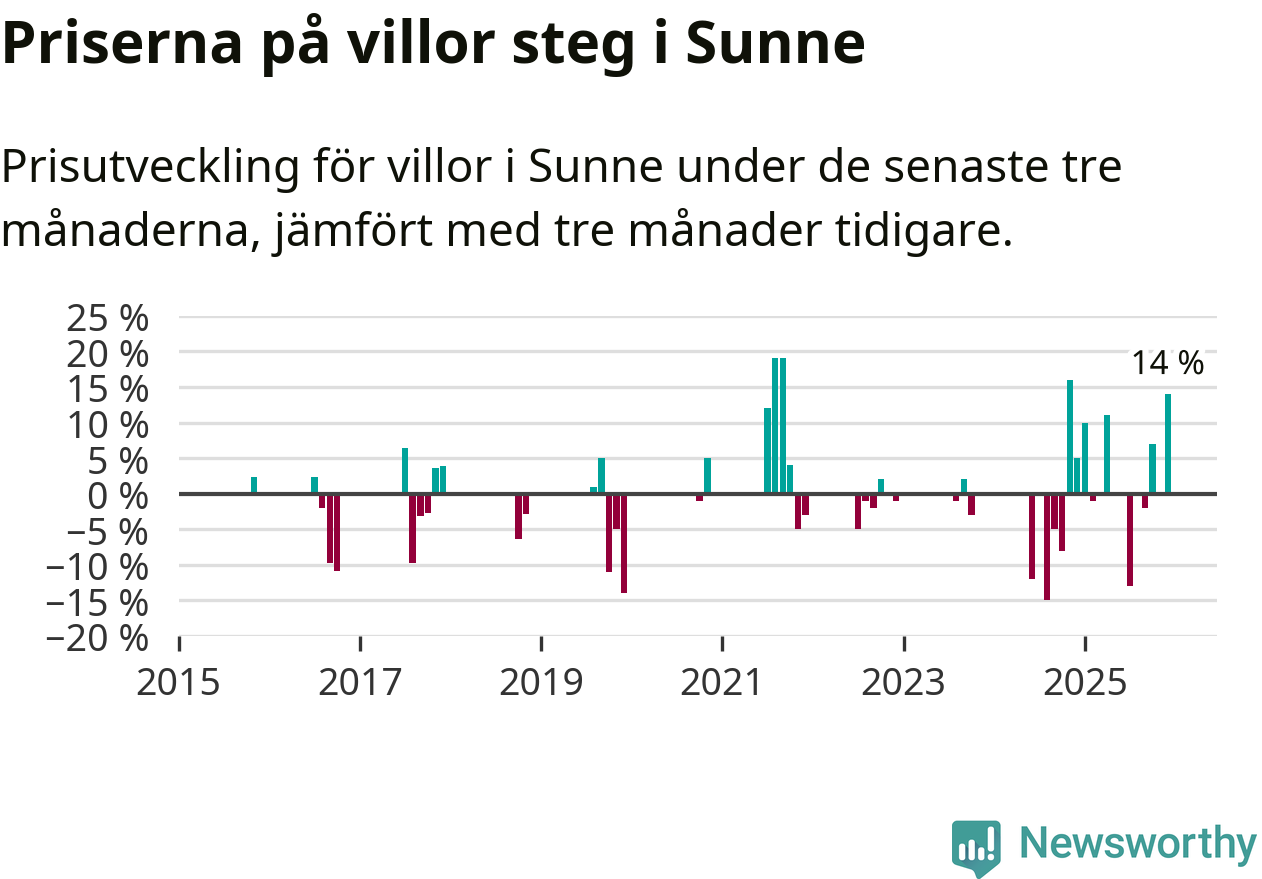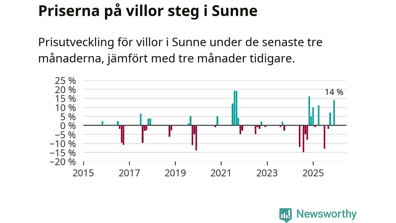Statistiken visar även på en stor prisuppgång i Sunne kommun. Medelpriset på försäljningarna av villor i kommunen var 14 procent högre än för tre månader sedan. I hela Värmland däremot sjunker villapriserna. I hela länet noterades en prisnedgång på 3 procent.