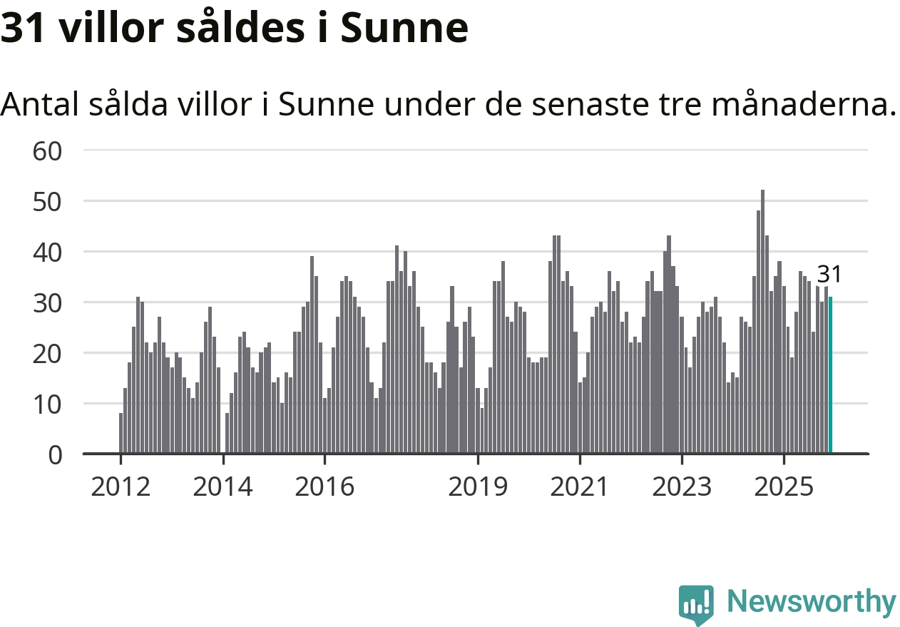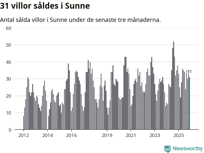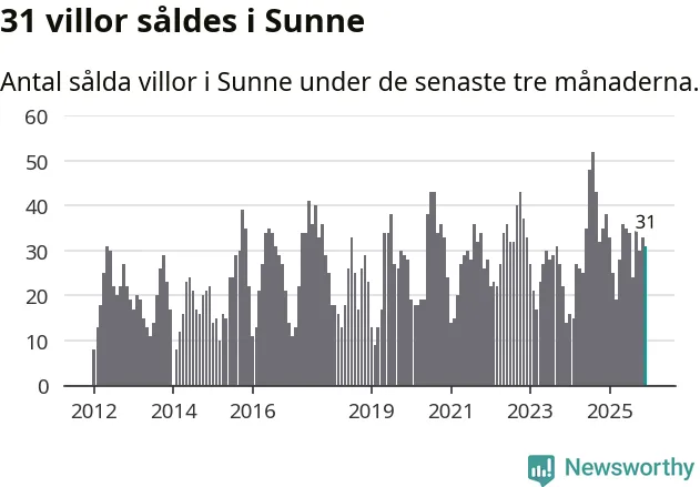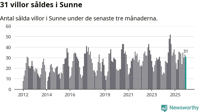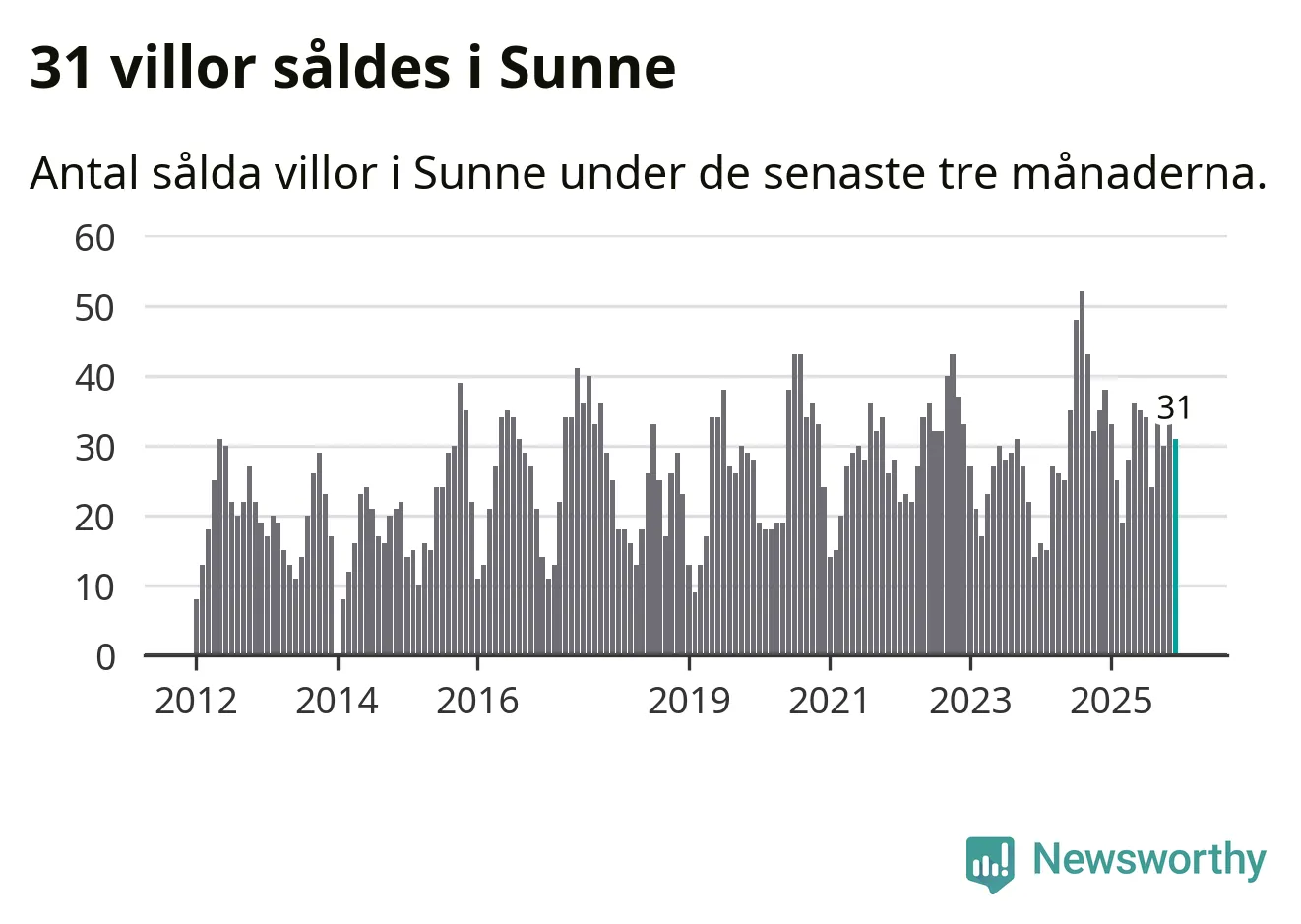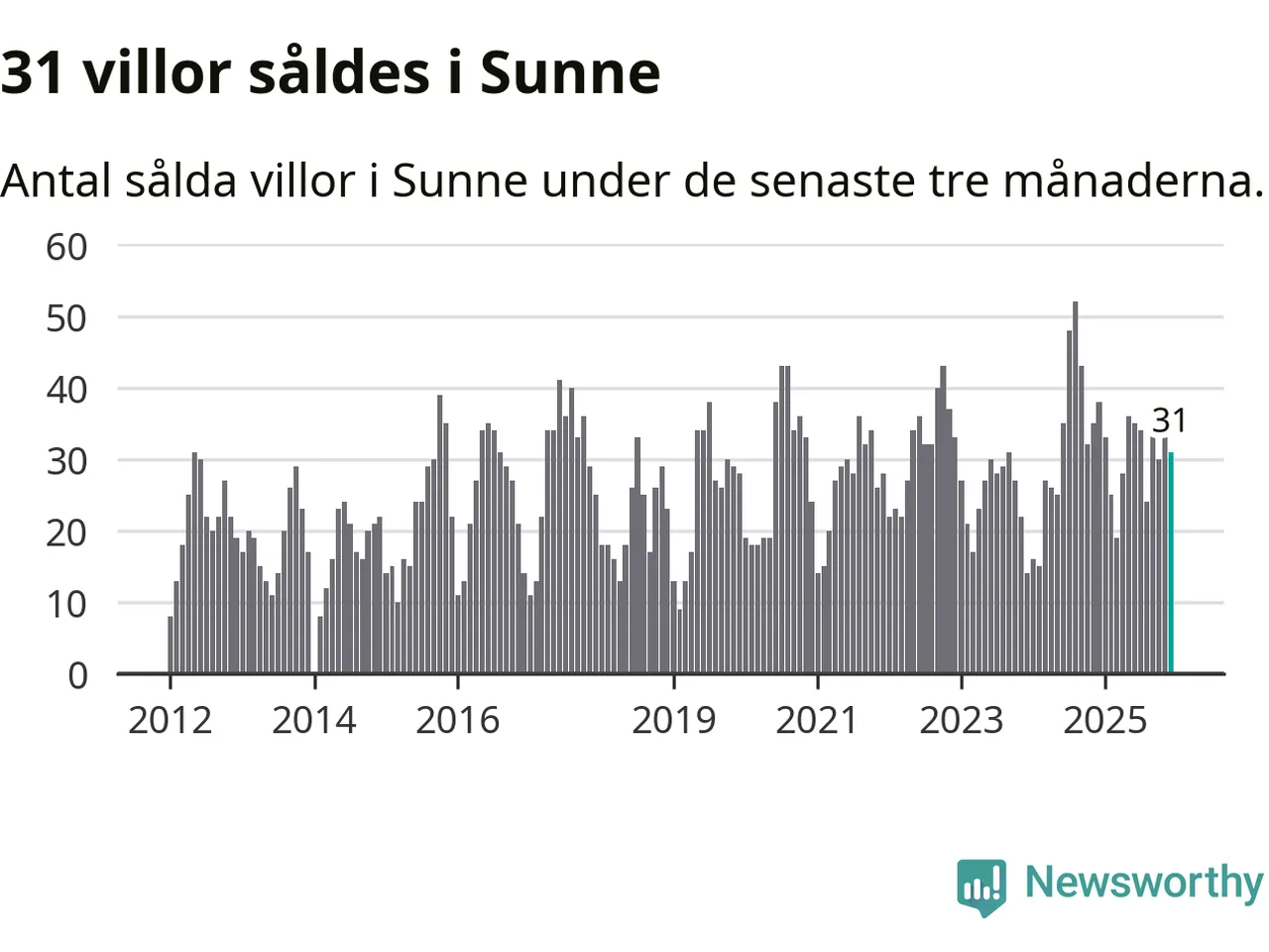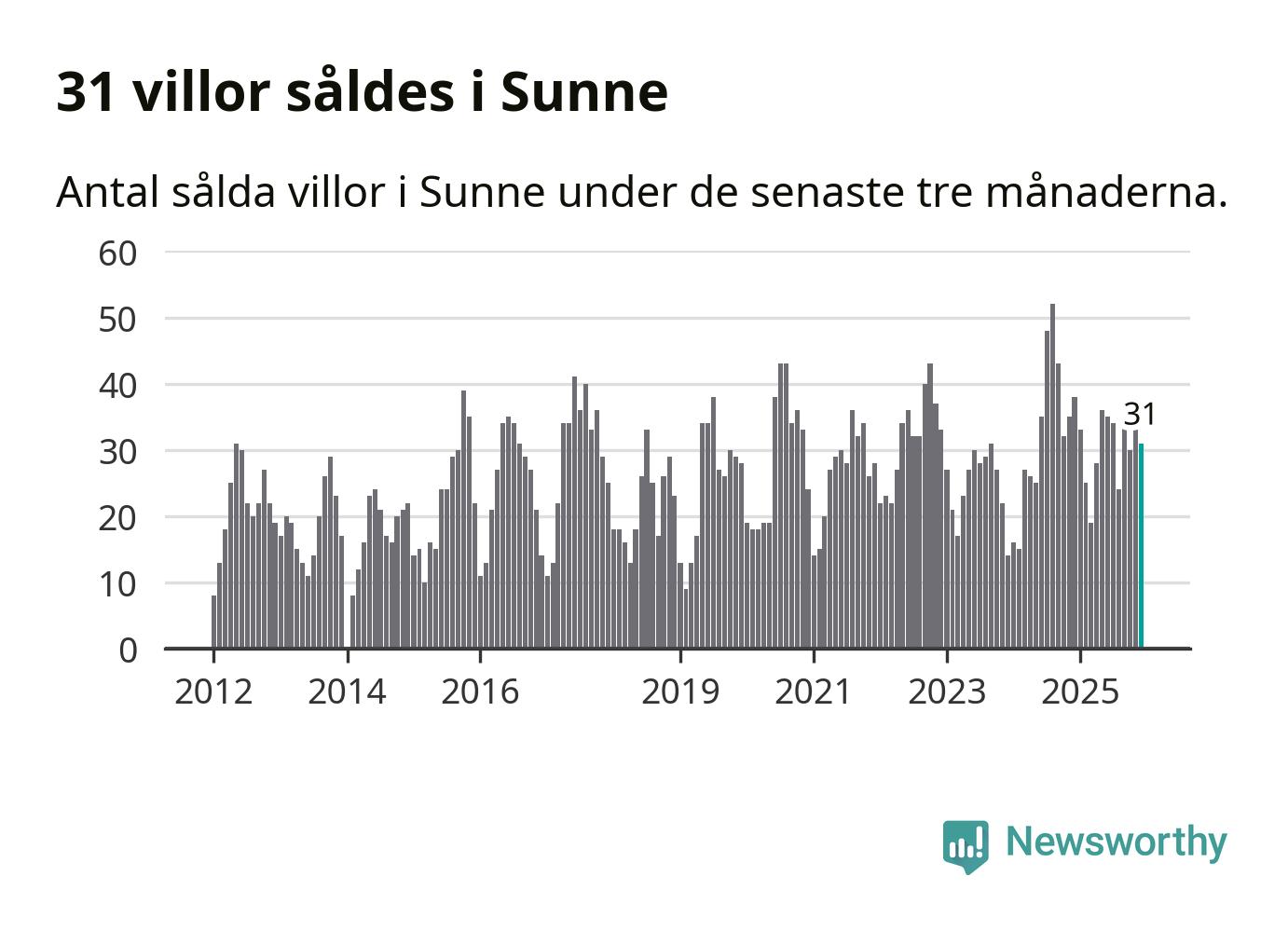 Mellan oktober och december gjordes sammanlagt 31 affärer med villor i Sunne kommun. Det kan jämföras med 38 vid motsvarande tid i fjol.