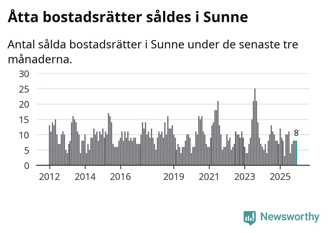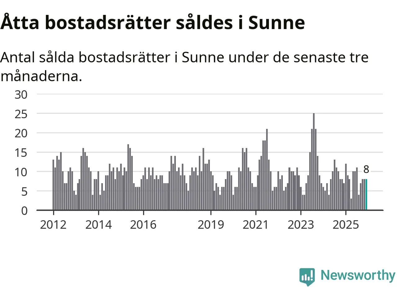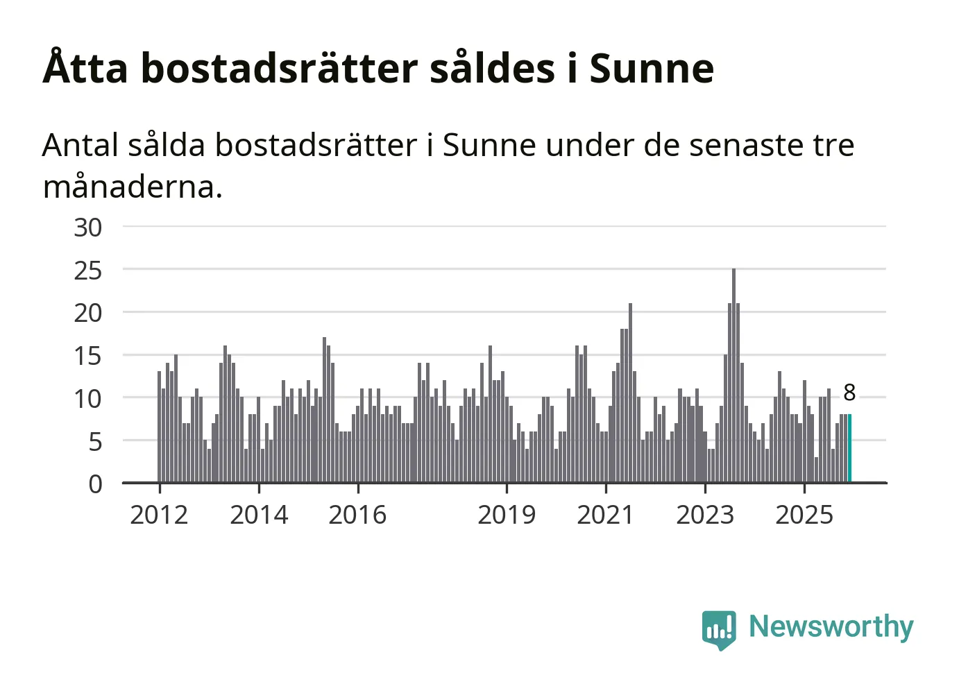 Mellan oktober och december gjordes sammanlagt åtta affärer med bostadsrätter i Sunne kommun. Det kan jämföras med sju vid motsvarande tid i fjol.