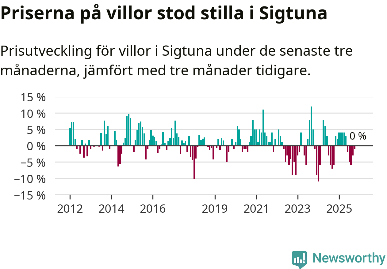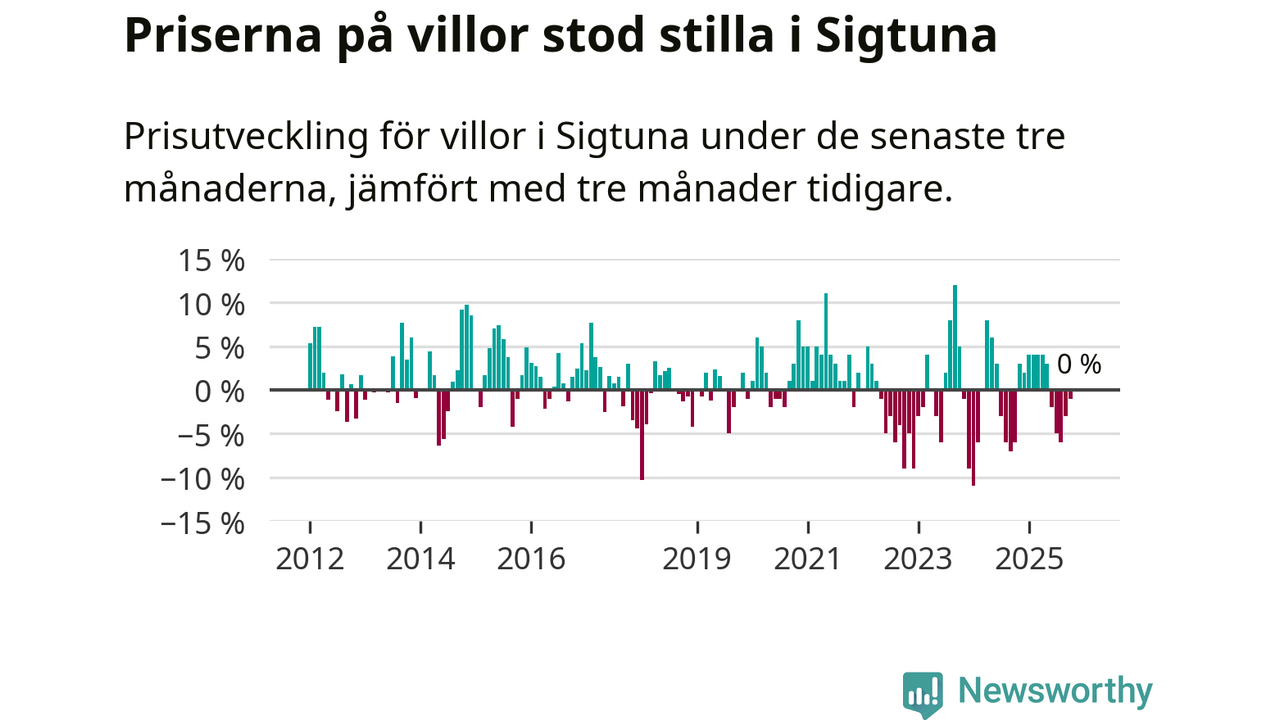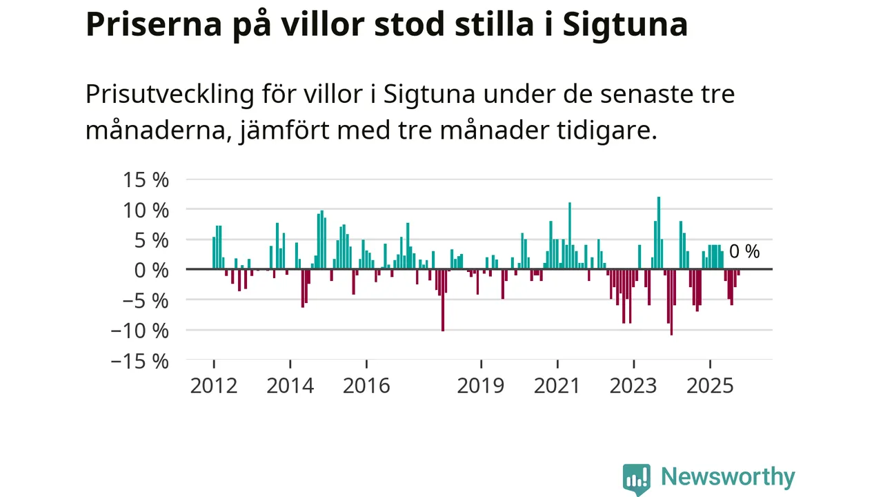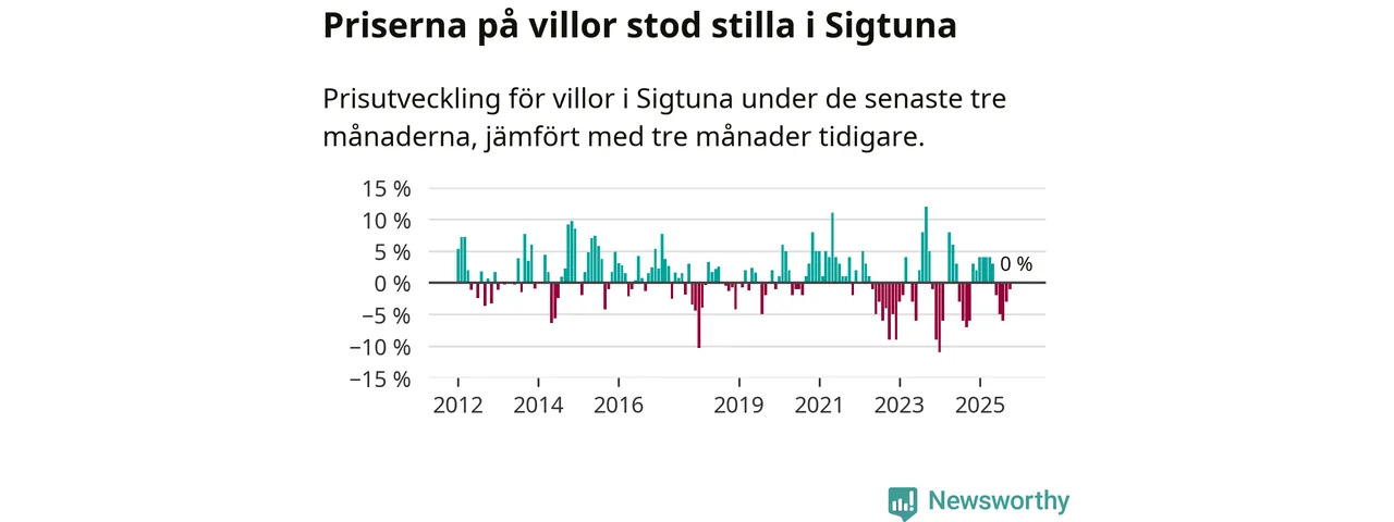Villapriserna står i stort sett stilla i Sigtuna kommun. Medelpriset på de på försäljningarna under de senaste tre månaderna låg på samma nivå som för tre månader sedan.