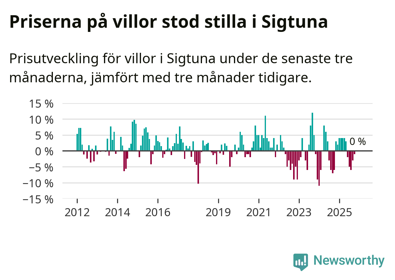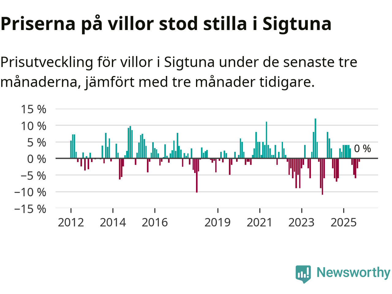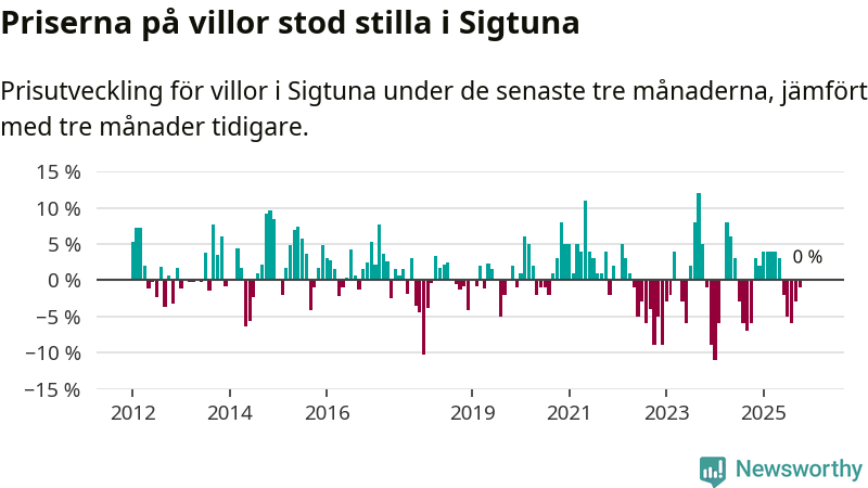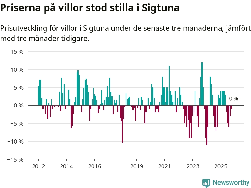 Villapriserna står i stort sett stilla i Sigtuna kommun. Medelpriset på de på försäljningarna under de senaste tre månaderna låg på samma nivå som för tre månader sedan.