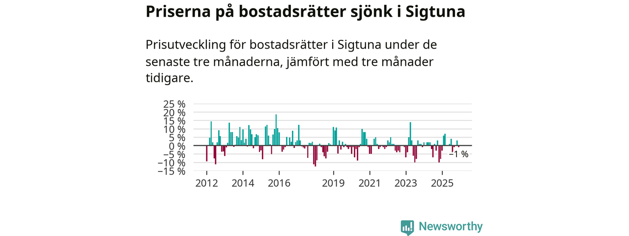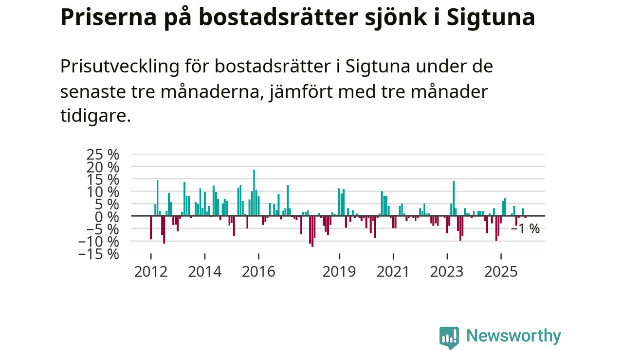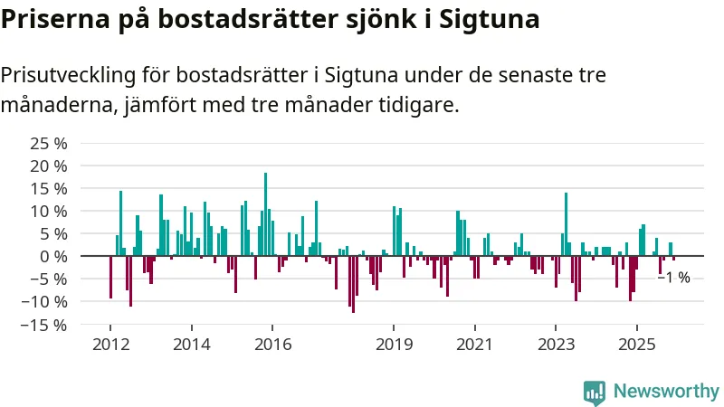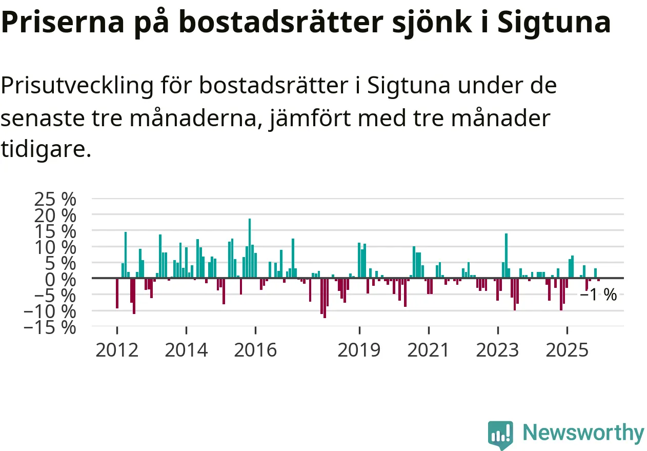 Priserna på bostadsrätter har gått ner i Sigtuna kommun. Medelpriset på försäljningarna under de senaste tre månaderna visar på en nedgång med 1 procent.