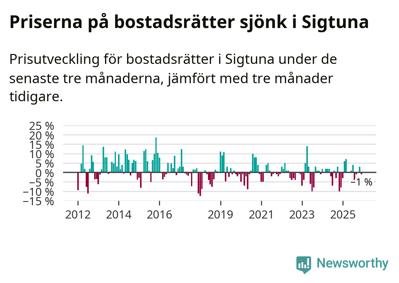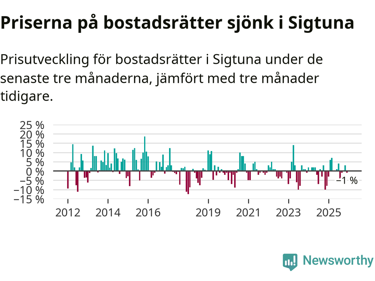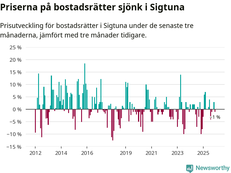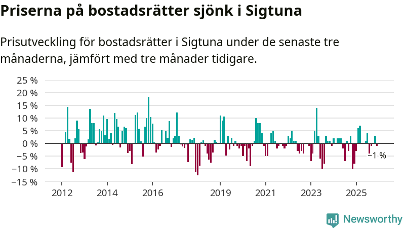 Priserna på bostadsrätter har gått ner i Sigtuna kommun. Medelpriset på försäljningarna under de senaste tre månaderna visar på en nedgång med 1 procent.