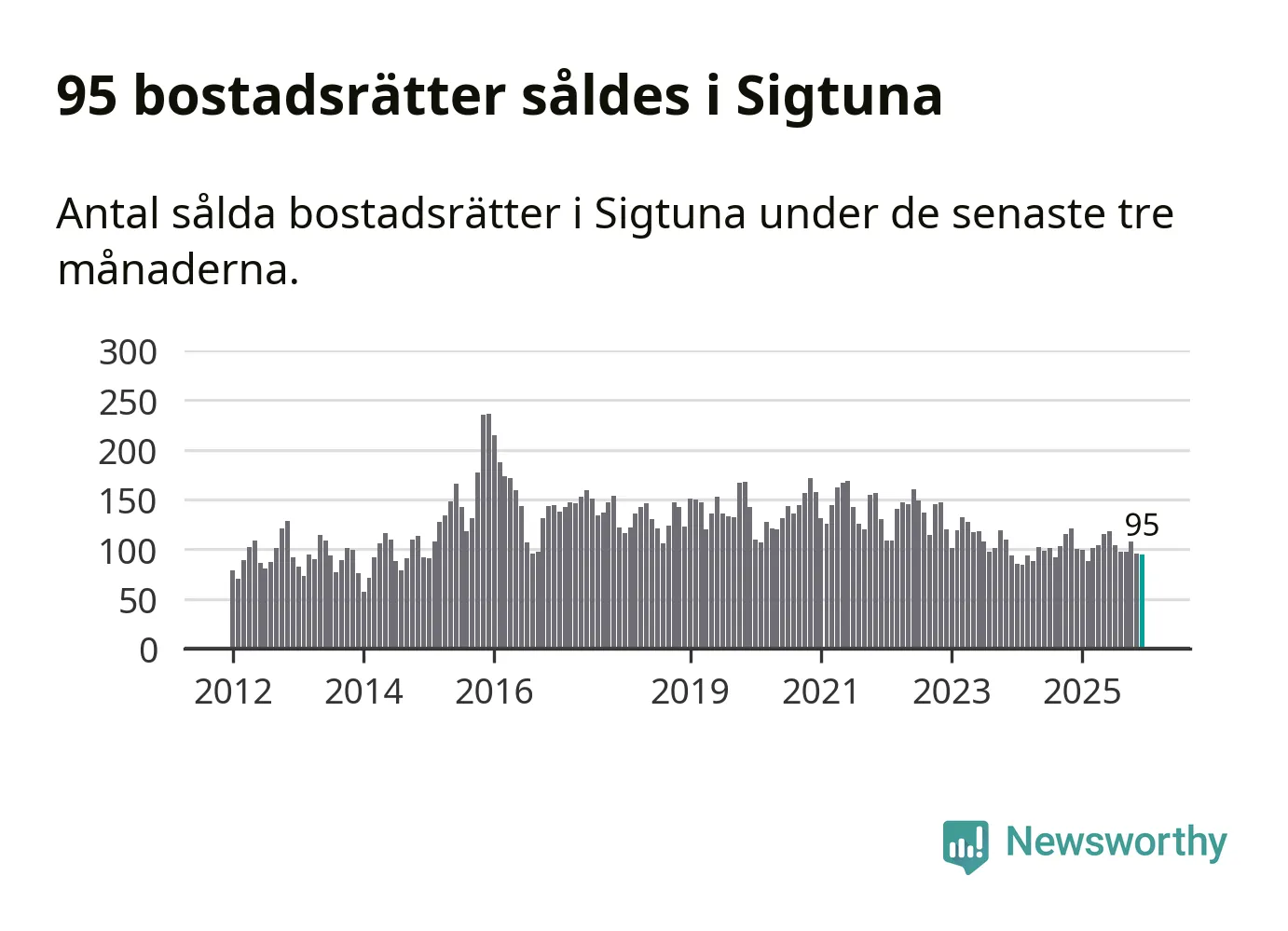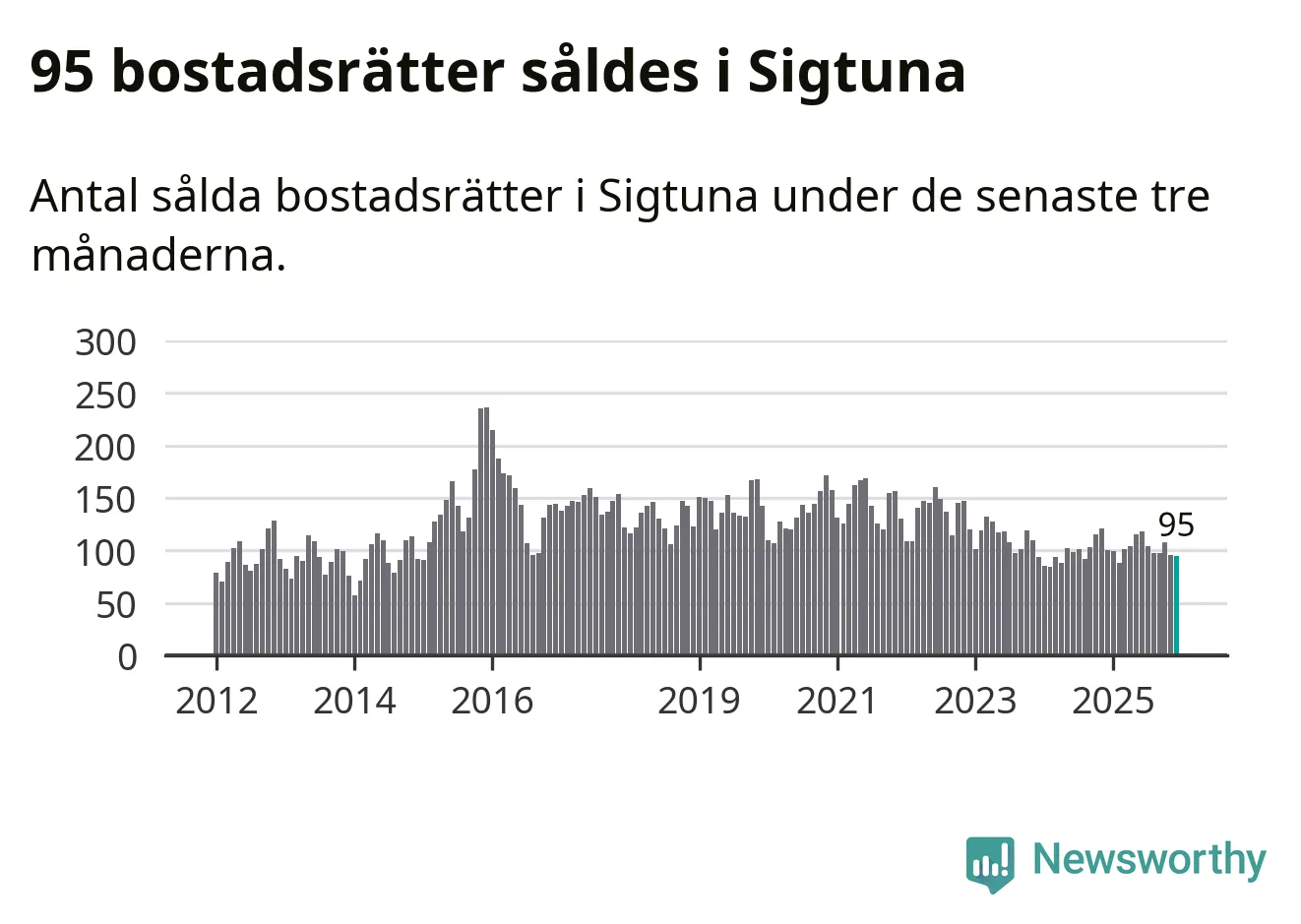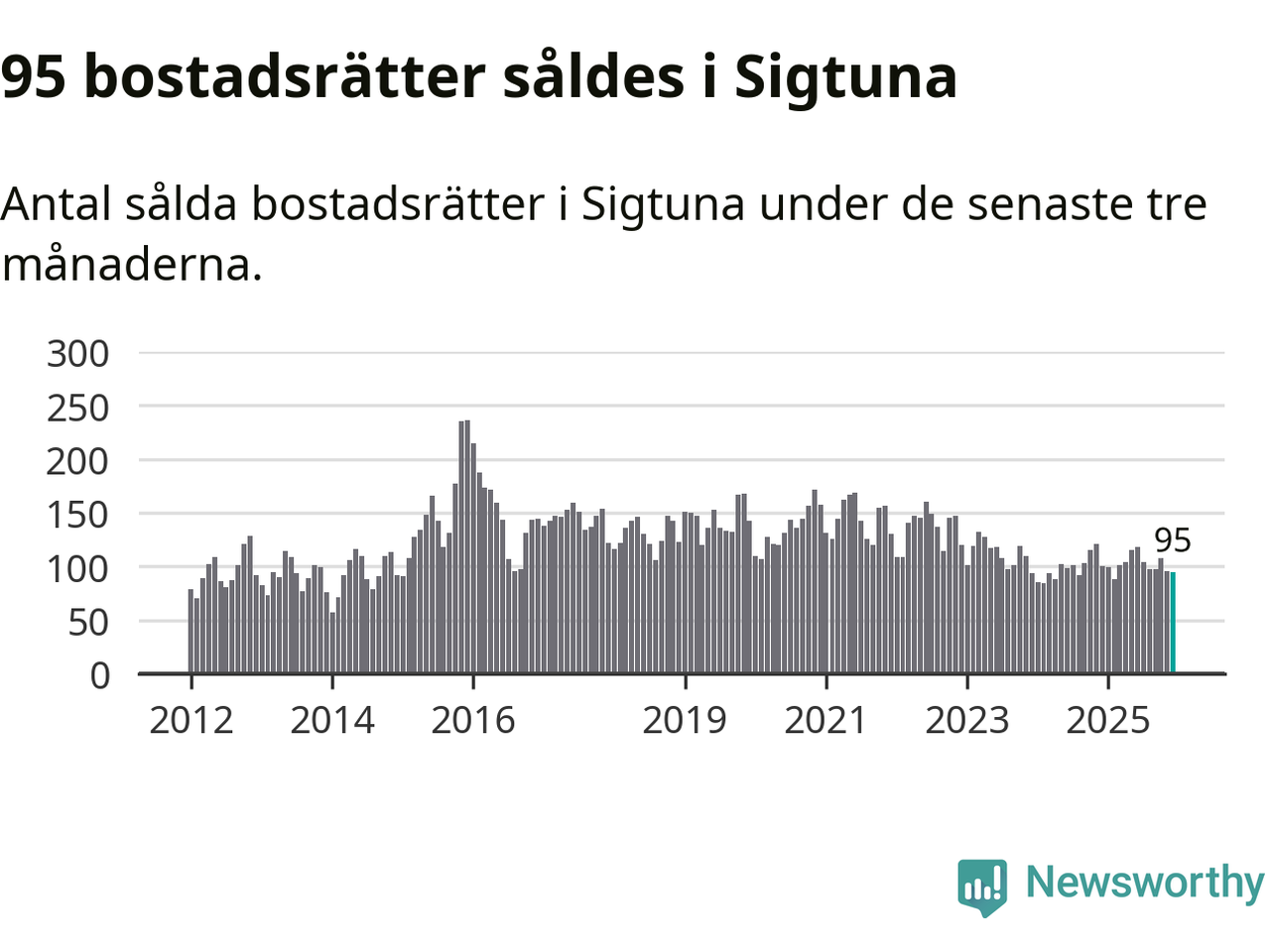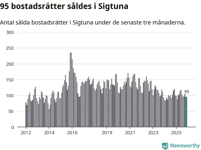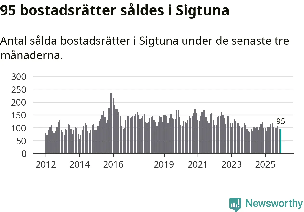Sammanlagt såldes 95 bostadsrätter i Sigtuna kommun mellan oktober och december till ett genomsnittligt pris på 2,0 miljoner kronor. I fjol gjordes 100 affärer vid den här tiden på året.