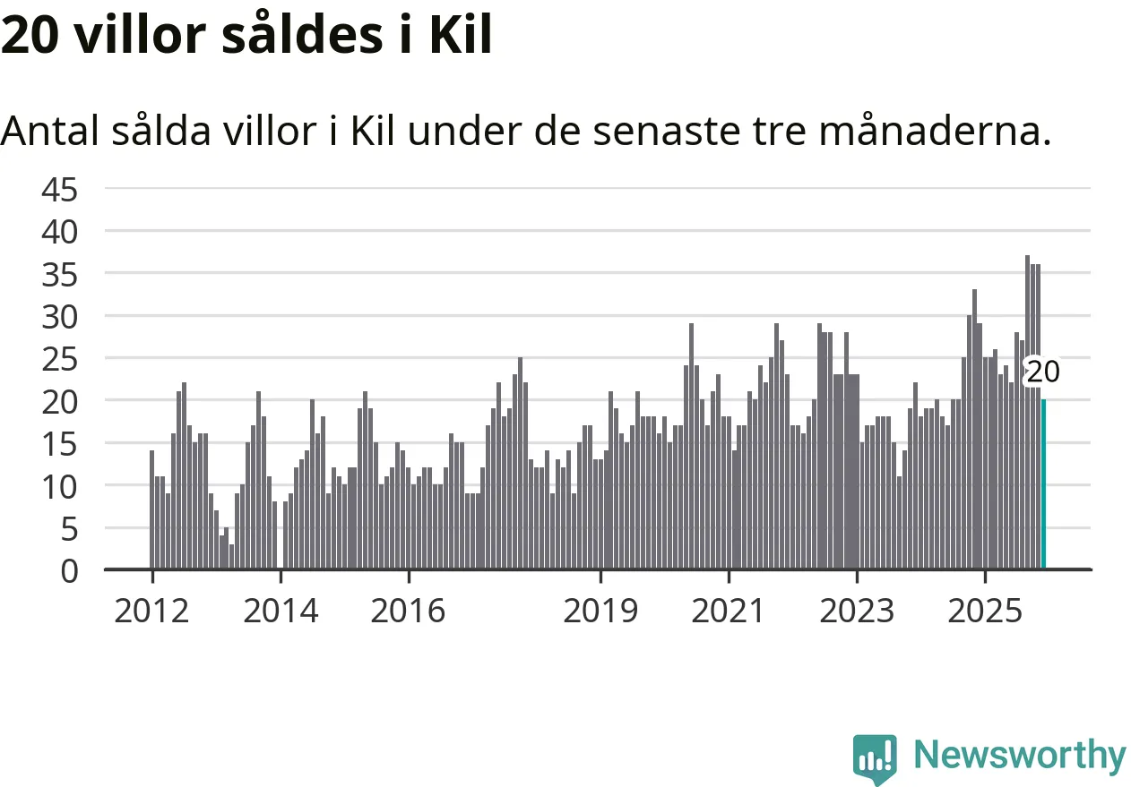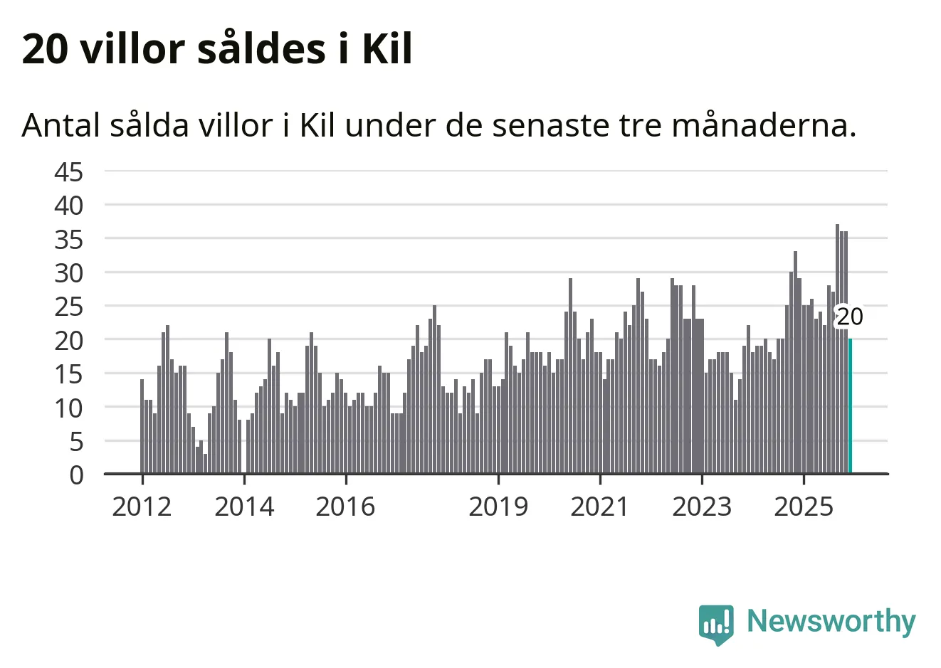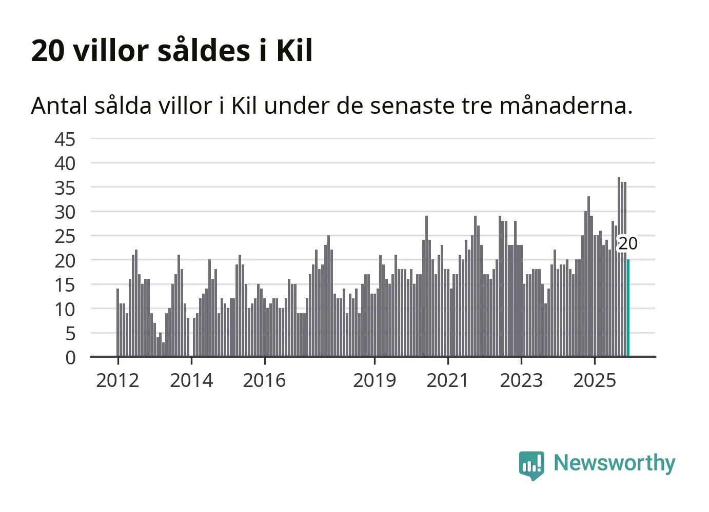 Mellan oktober och december såldes 20 villor i Kils kommun. Det är relativt få sett till aktiviteten på bostadsmarknaden i kommunen under de senaste tolv månaderna, samt det historiska snittet för den här tiden på året.