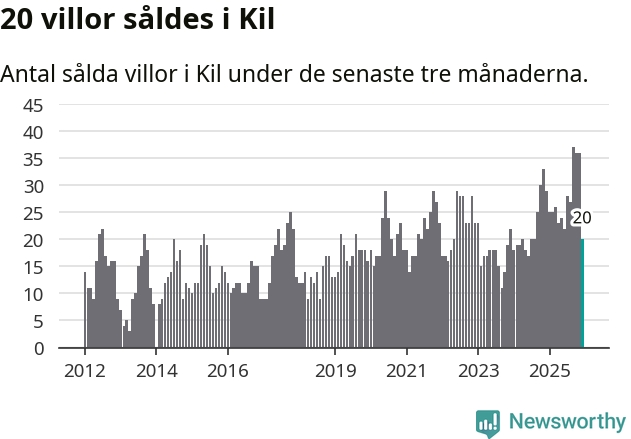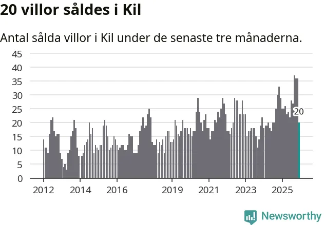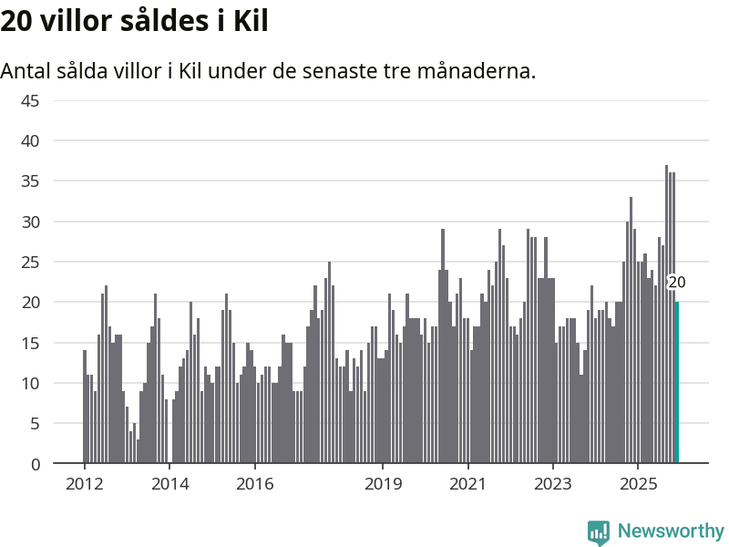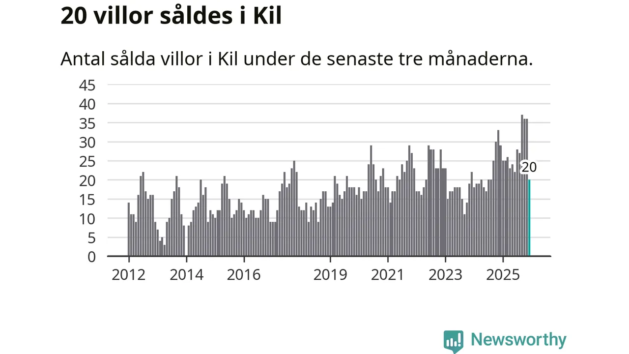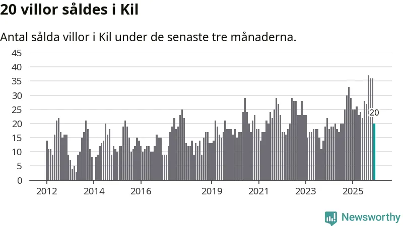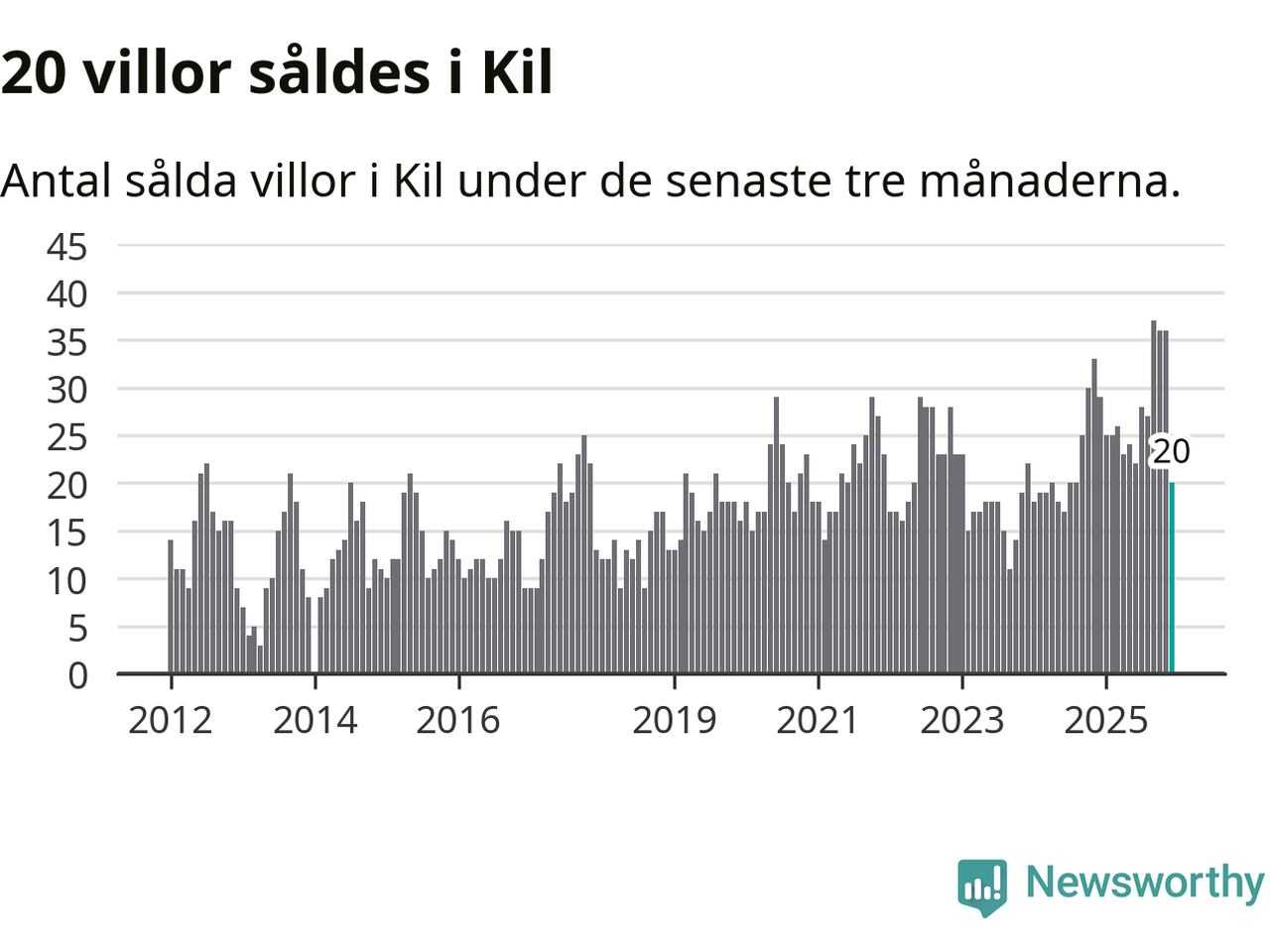Mellan oktober och december såldes 20 villor i Kils kommun. Det är relativt få sett till aktiviteten på bostadsmarknaden i kommunen under de senaste tolv månaderna, samt det historiska snittet för den här tiden på året.