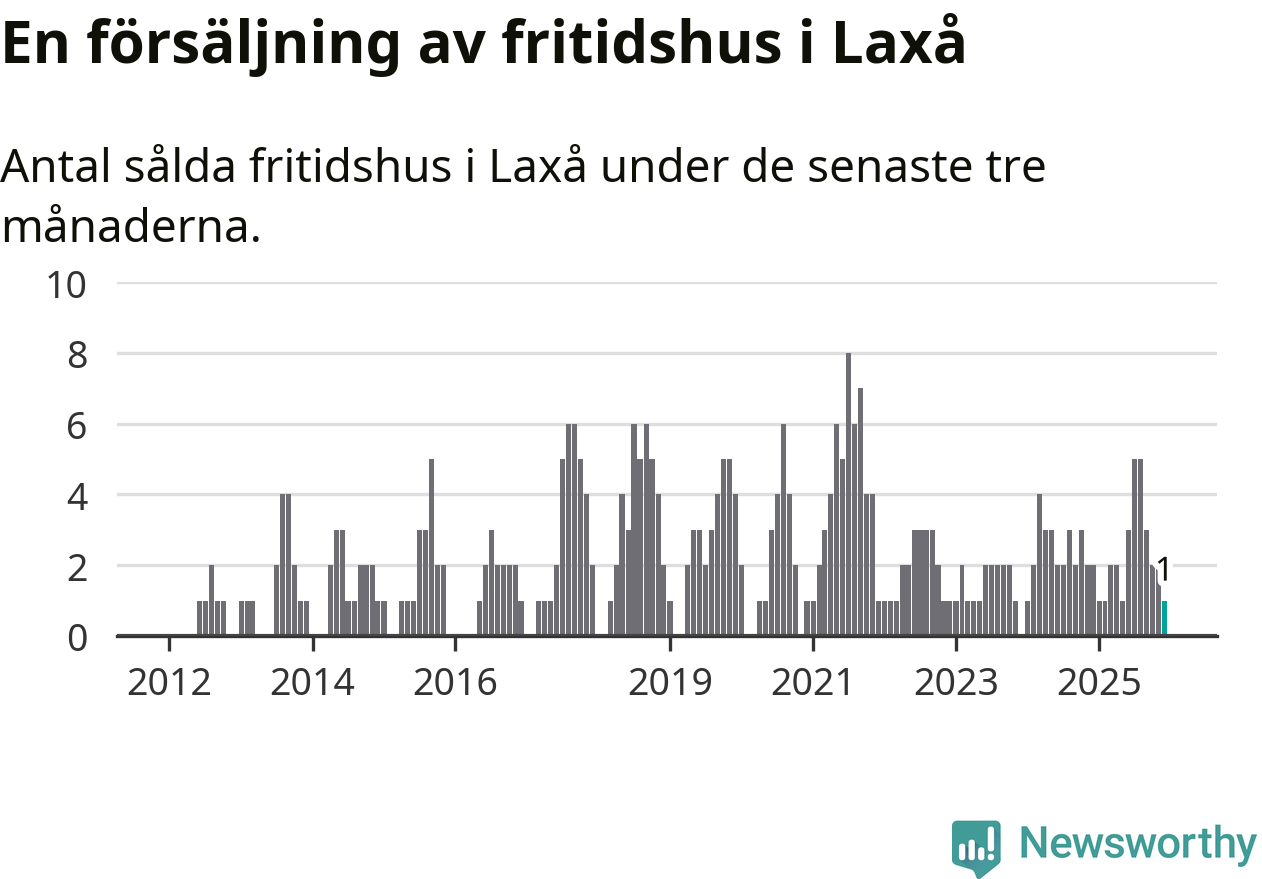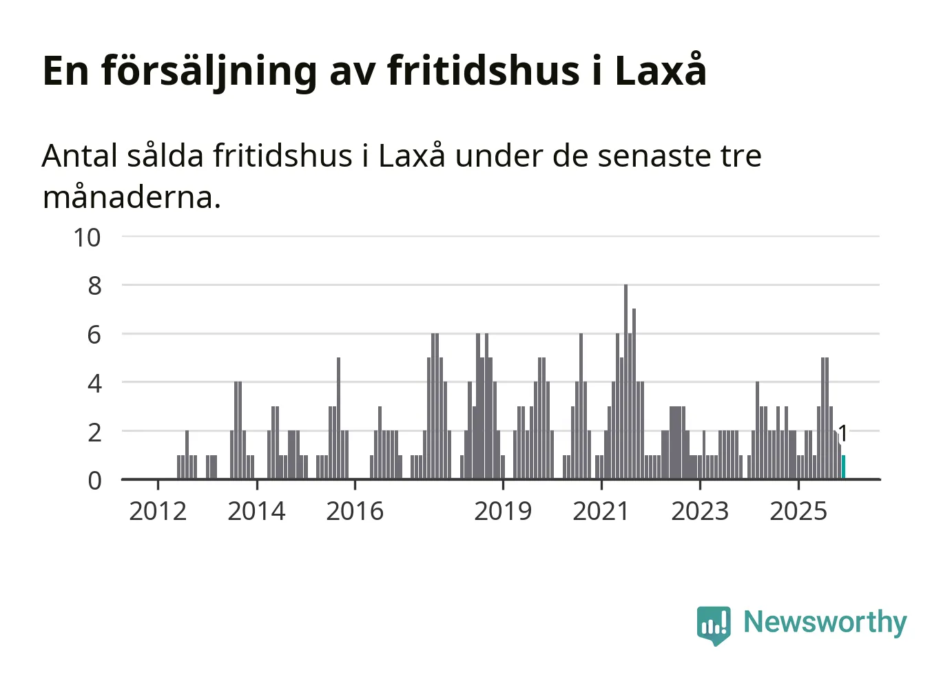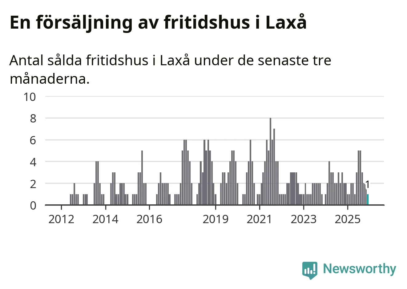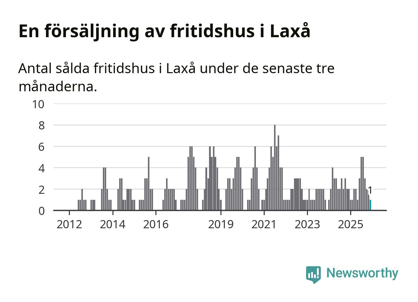 Mellan oktober och december gjordes sammanlagt en affär med fritidshus i Laxå kommun. Det kan jämföras med två vid motsvarande tid i fjol.