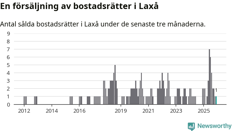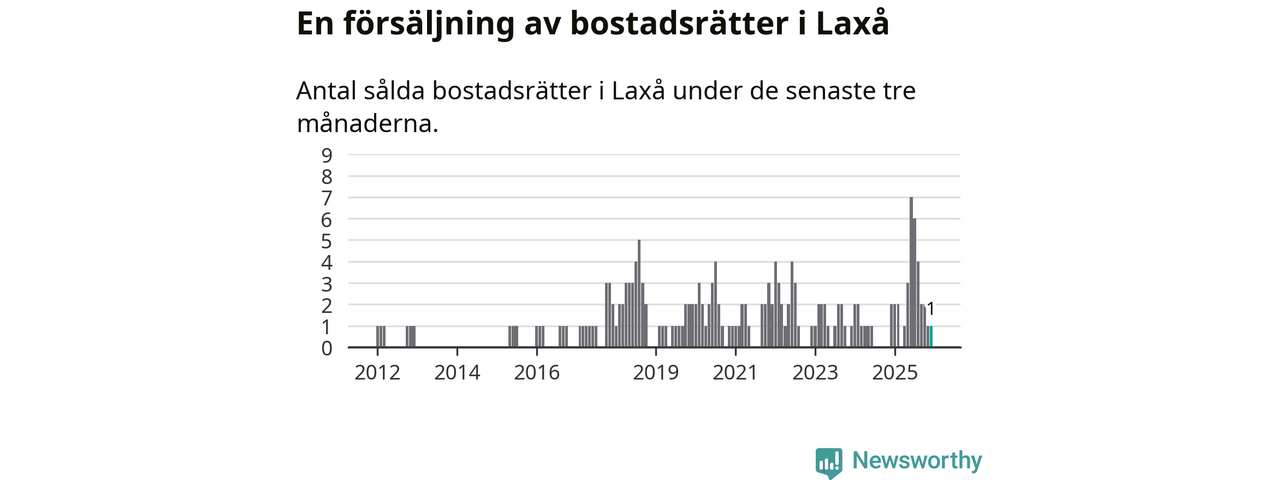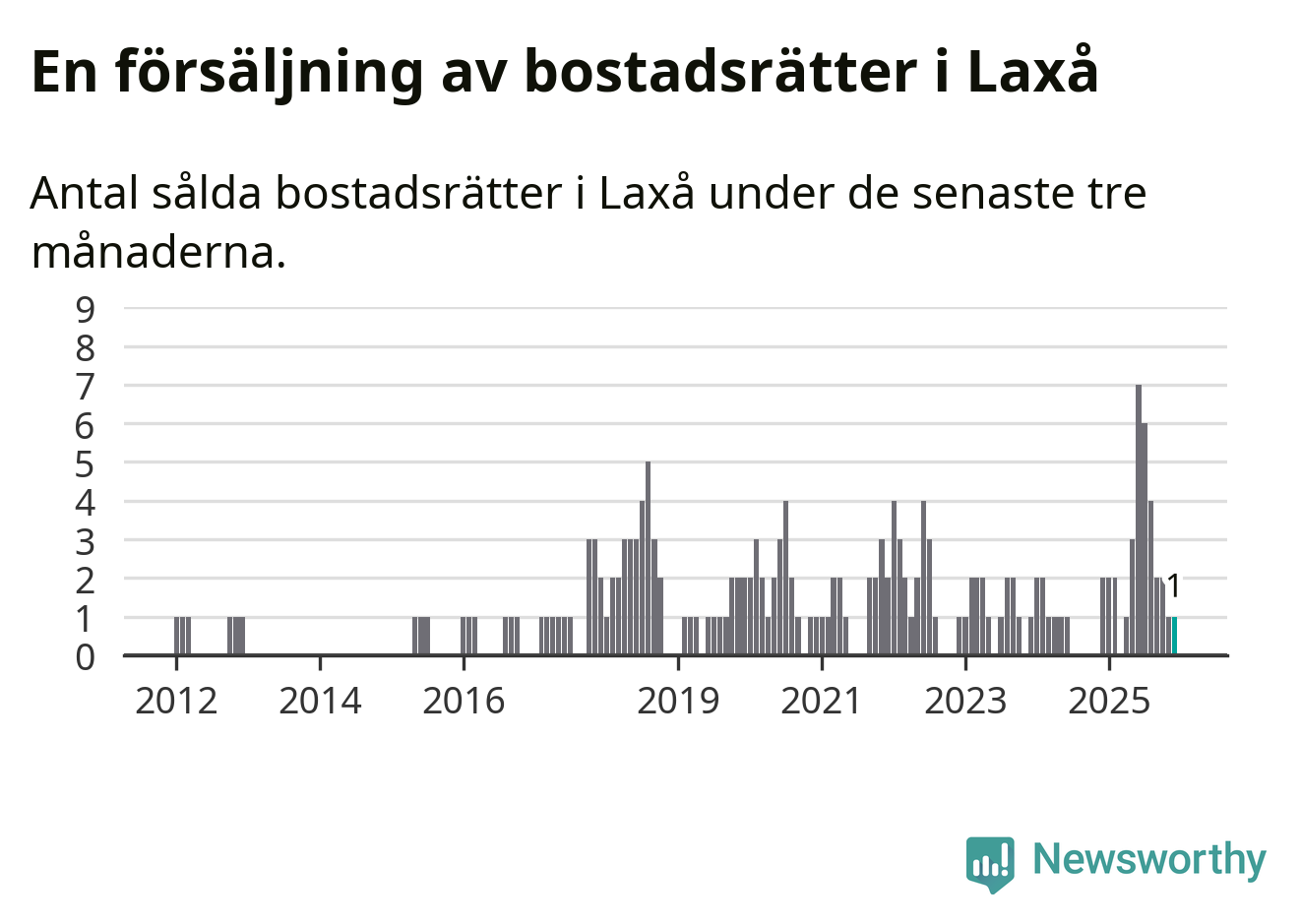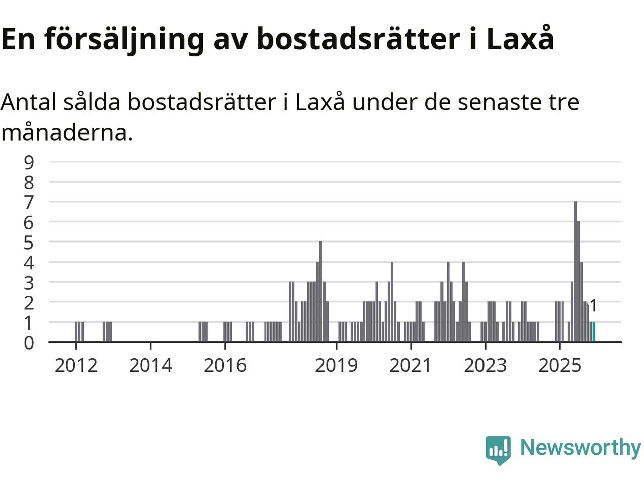 Mellan oktober och december gjordes sammanlagt en affär med bostadsrätter i Laxå kommun. Det kan jämföras med två vid motsvarande tid i fjol.