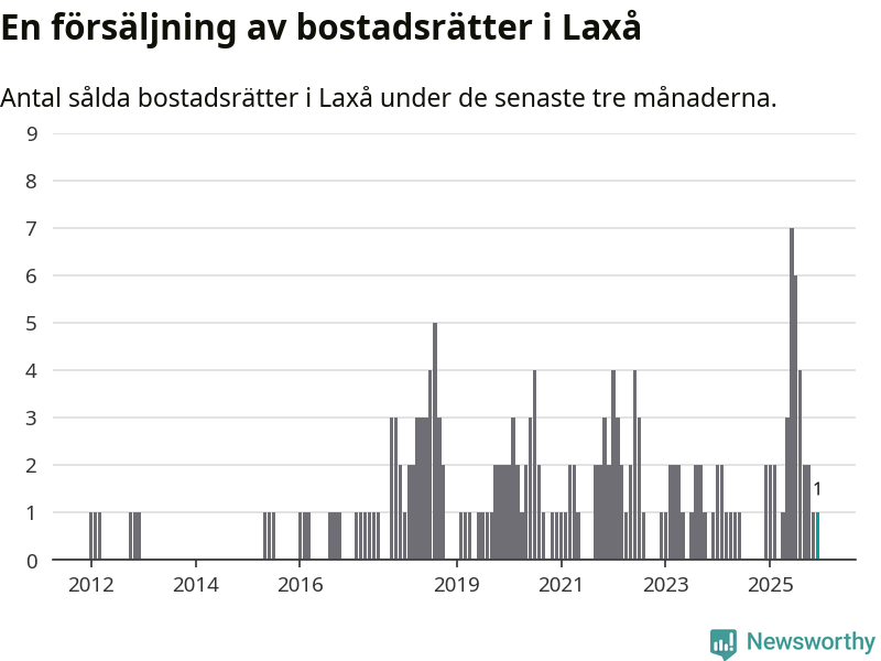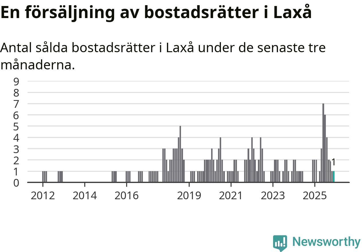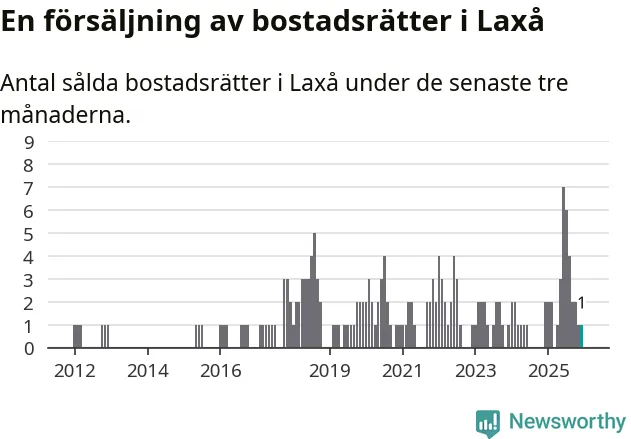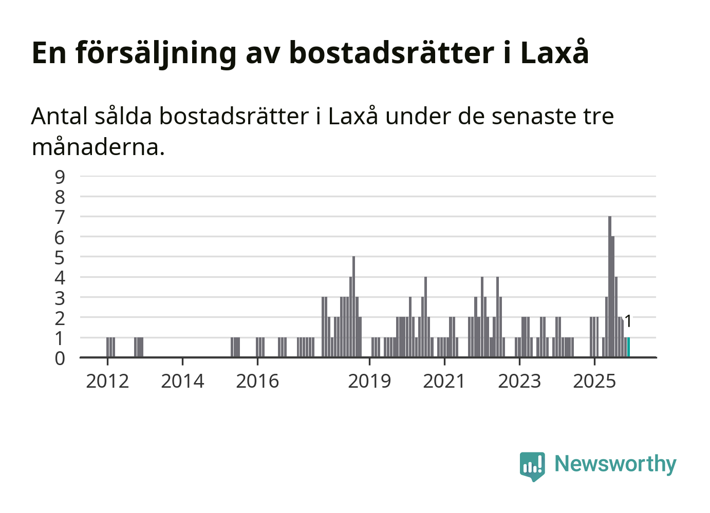 Mellan oktober och december gjordes sammanlagt en affär med bostadsrätter i Laxå kommun. Det kan jämföras med två vid motsvarande tid i fjol.