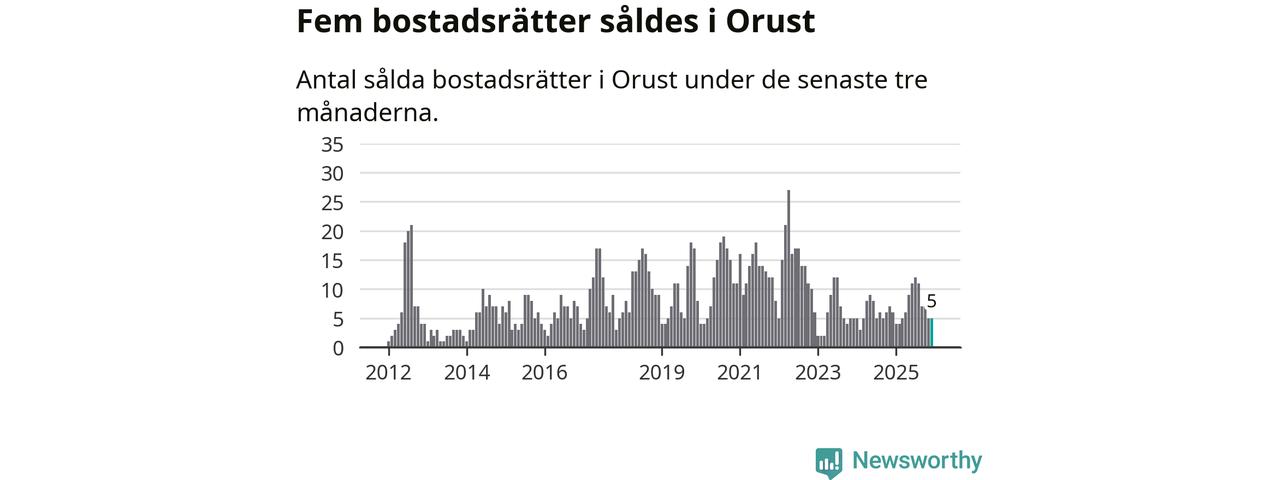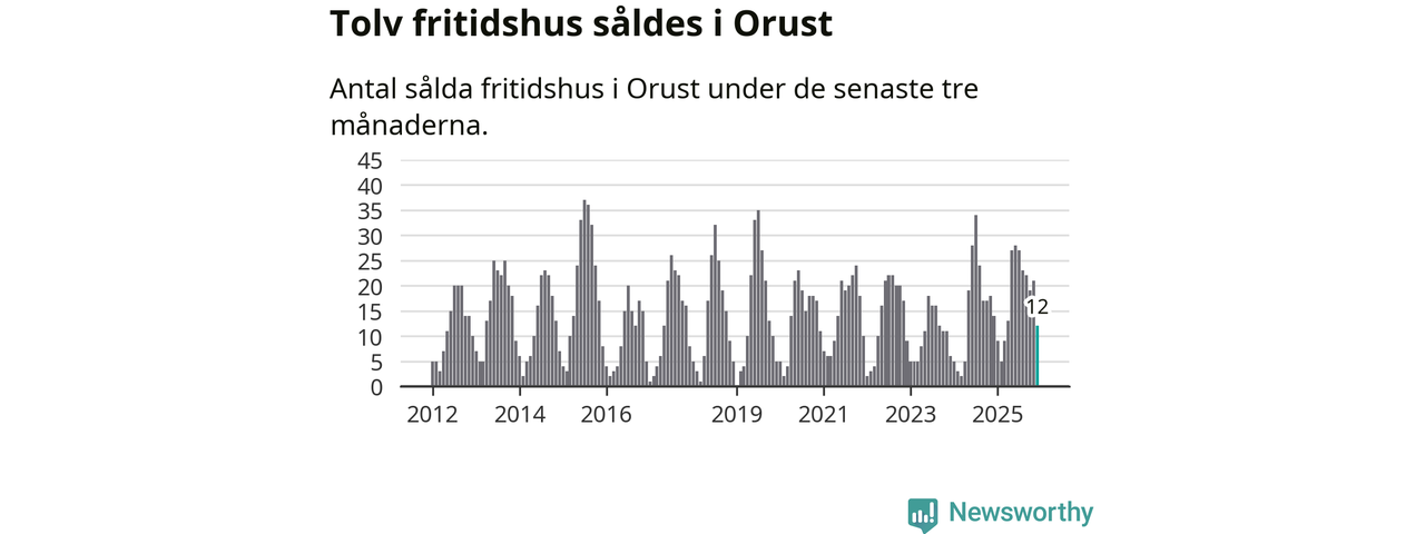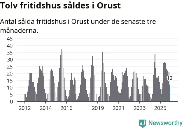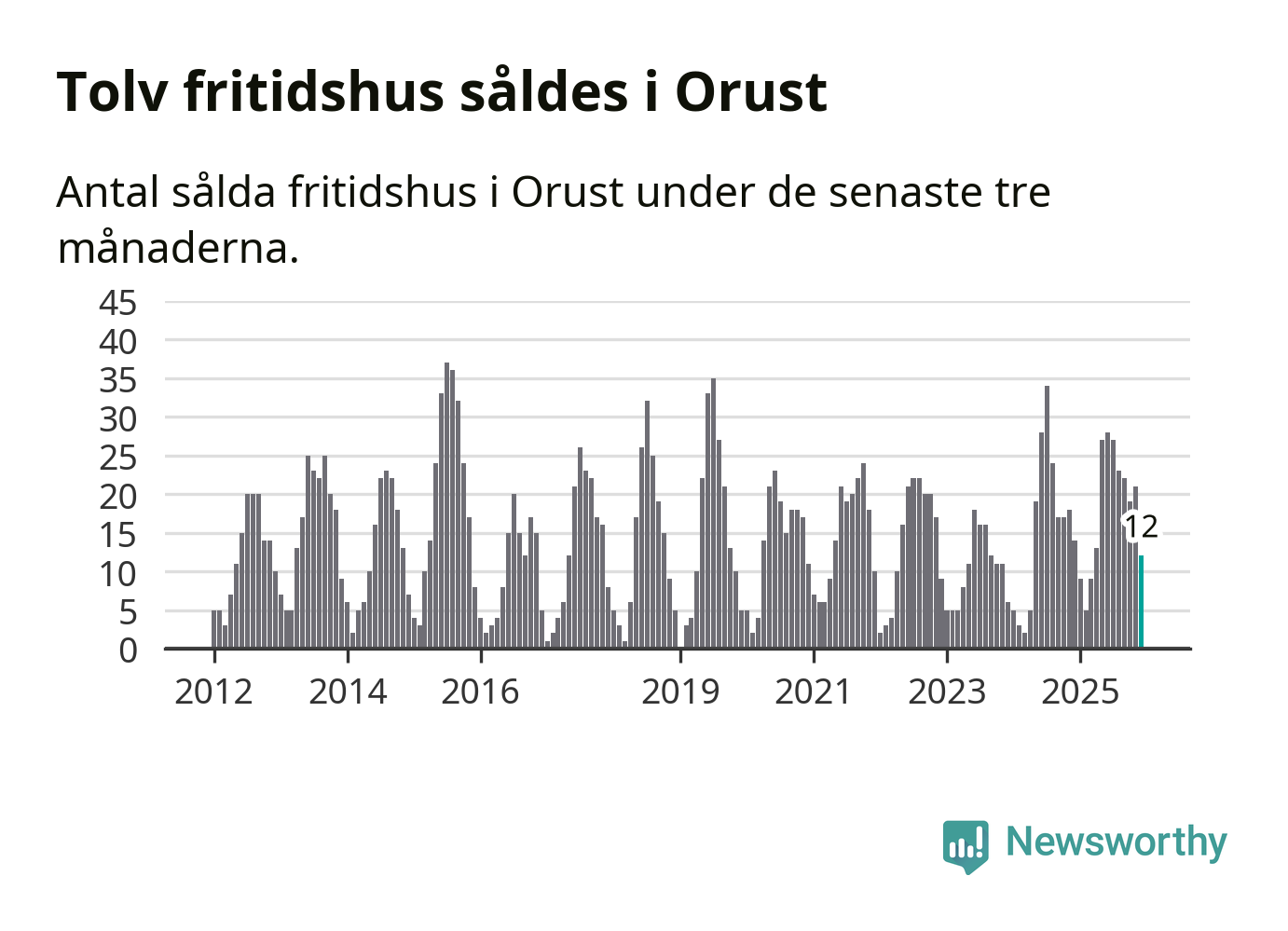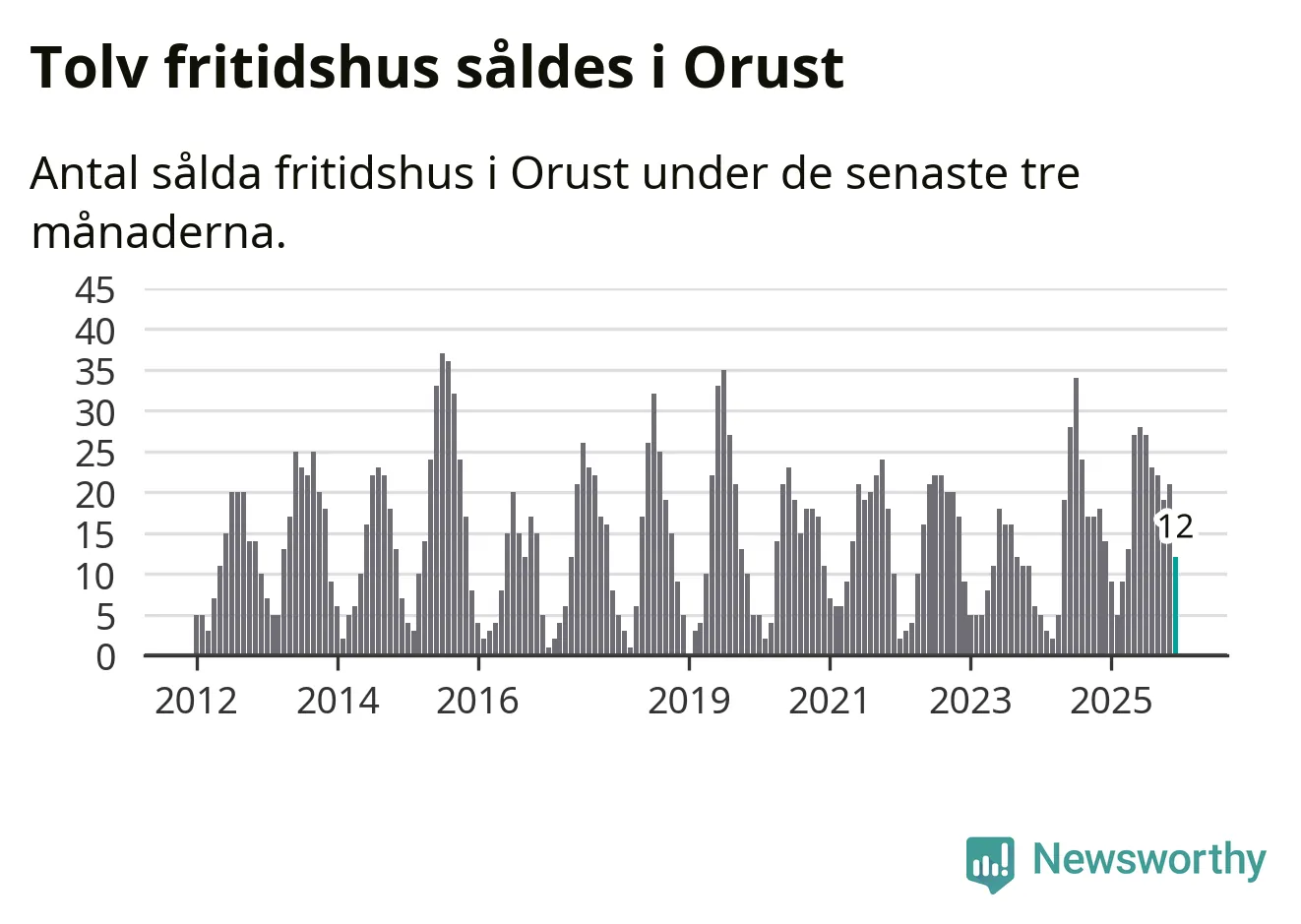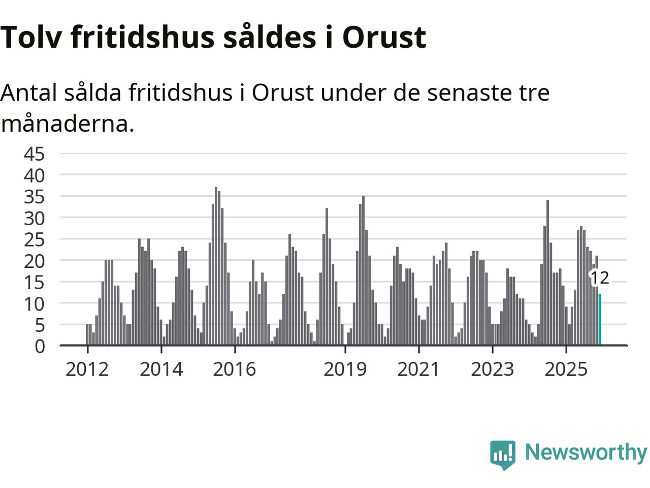 Sammanlagt såldes tolv fritidshus i Orusts kommun mellan oktober 2025 och december 2025 till ett genomsnittligt pris på 5,1 miljoner kronor. I fjol gjordes 14 affärer vid den här tiden på året.