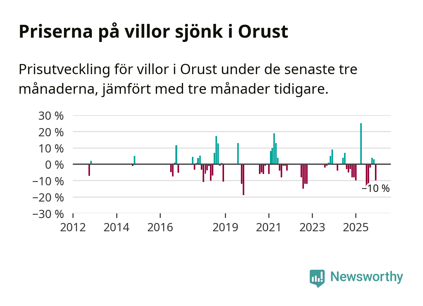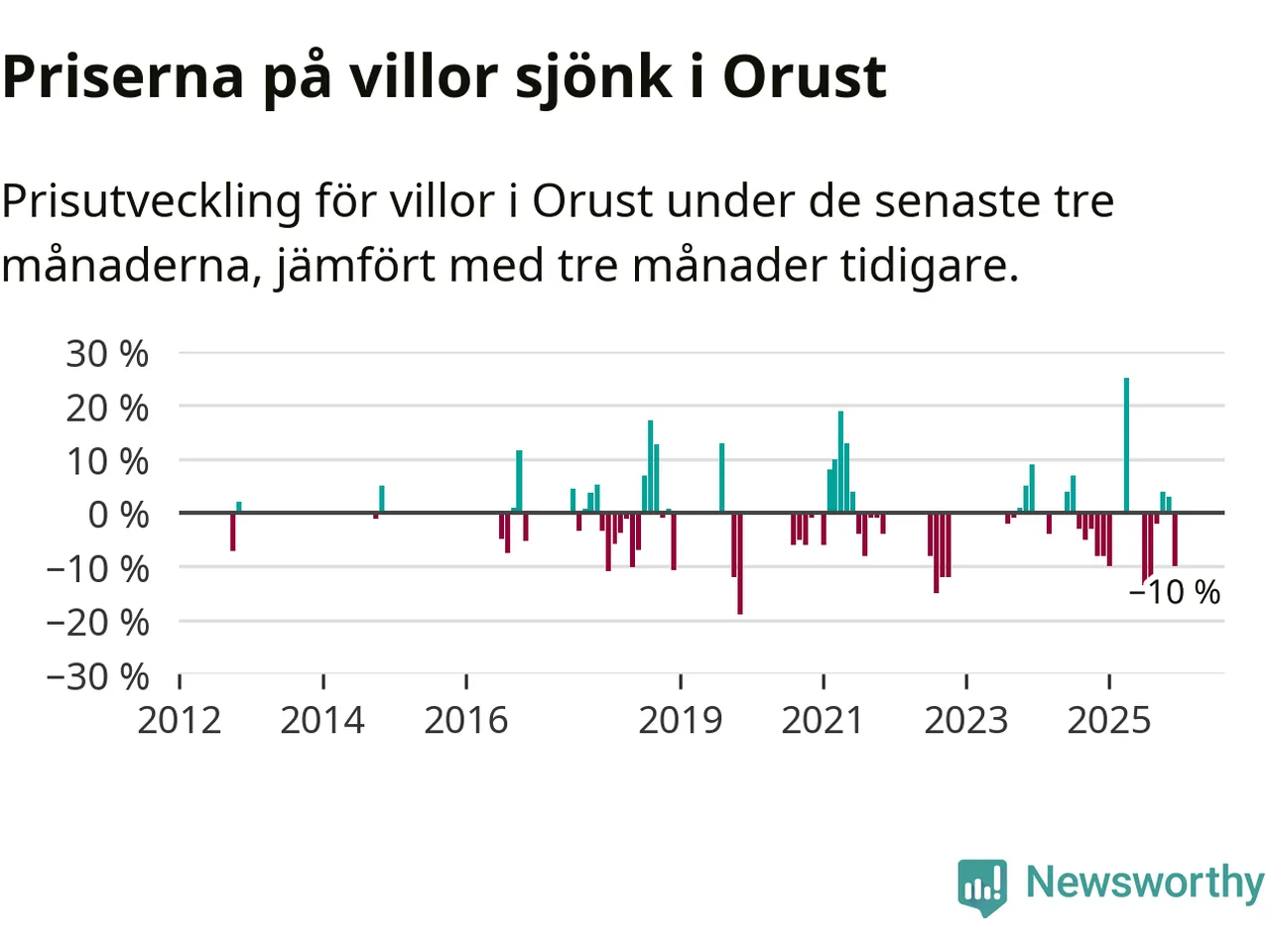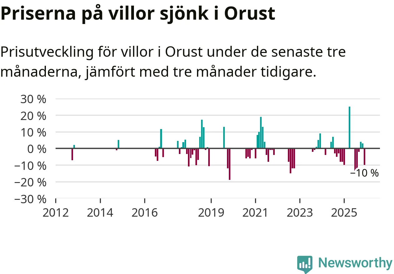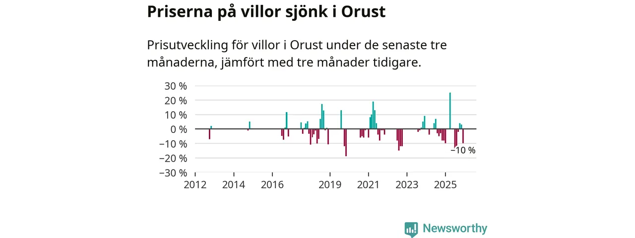 Statistiken visar även på en stor prisnedgång i Orusts kommun. Medelpriset på försäljningarna av villor i kommunen var 10 procent lägre än för tre månader sedan. Även i hela Västra Götaland sjunker villapriserna. I hela länet noterades en prisnedgång på 3 procent.