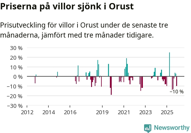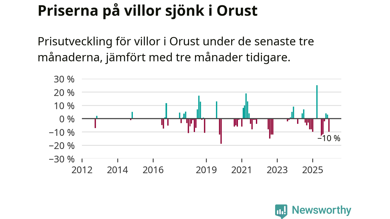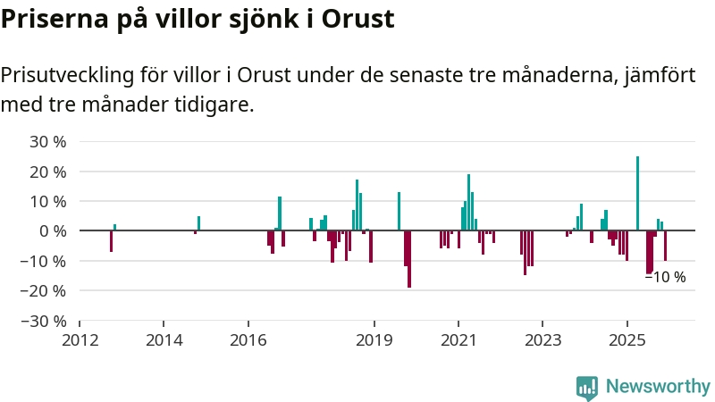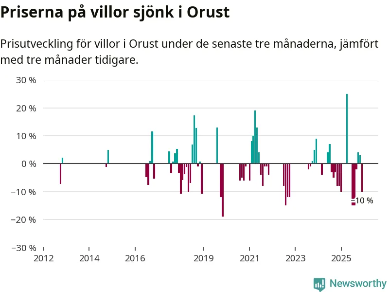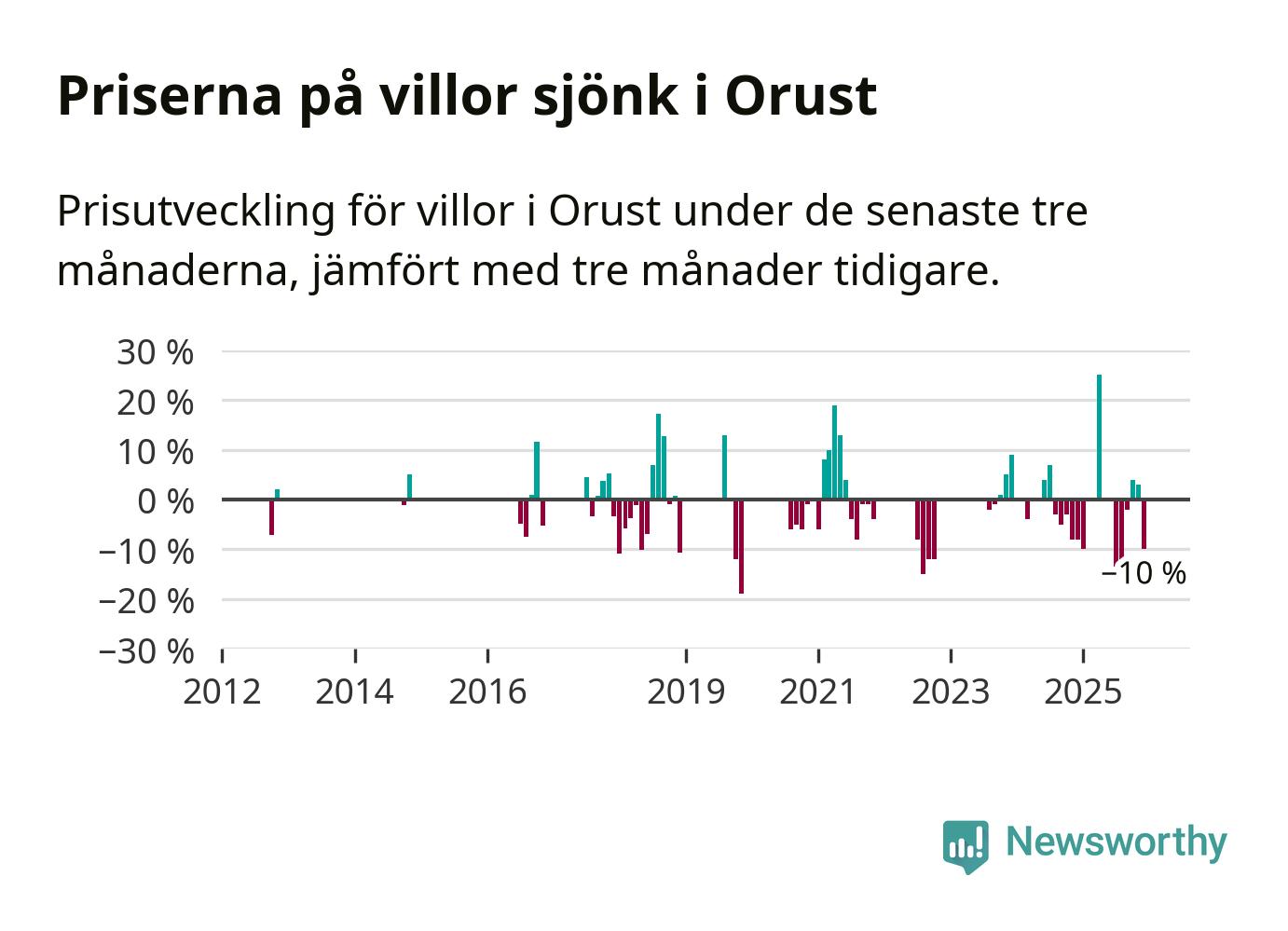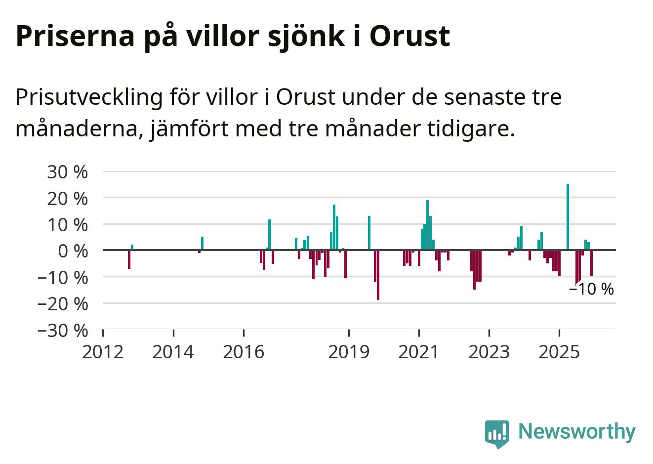 Statistiken visar även på en stor prisnedgång i Orusts kommun. Medelpriset på försäljningarna av villor i kommunen var 10 procent lägre än för tre månader sedan. Även i hela Västra Götaland sjunker villapriserna. I hela länet noterades en prisnedgång på 3 procent.