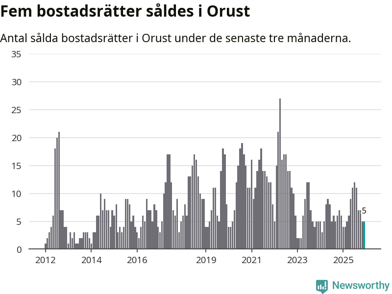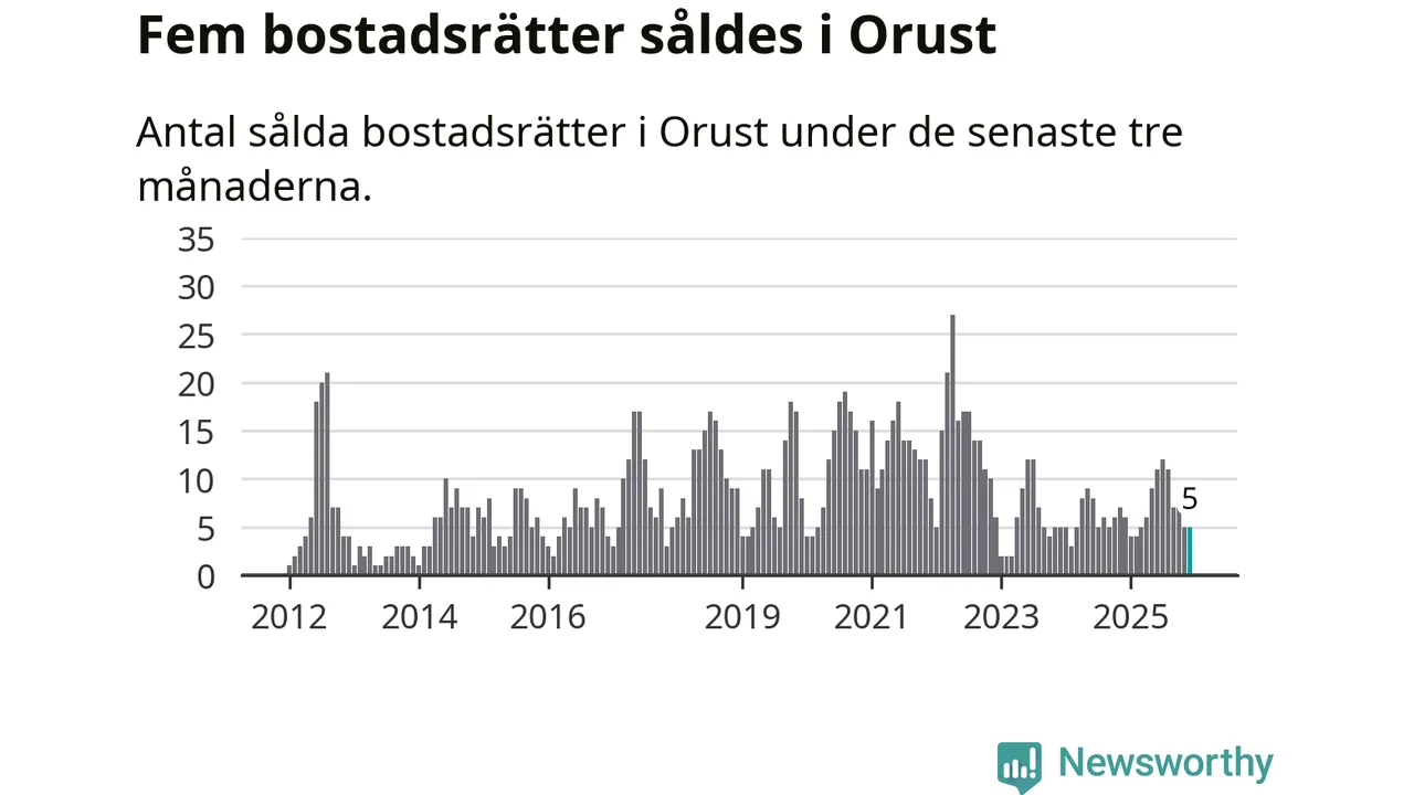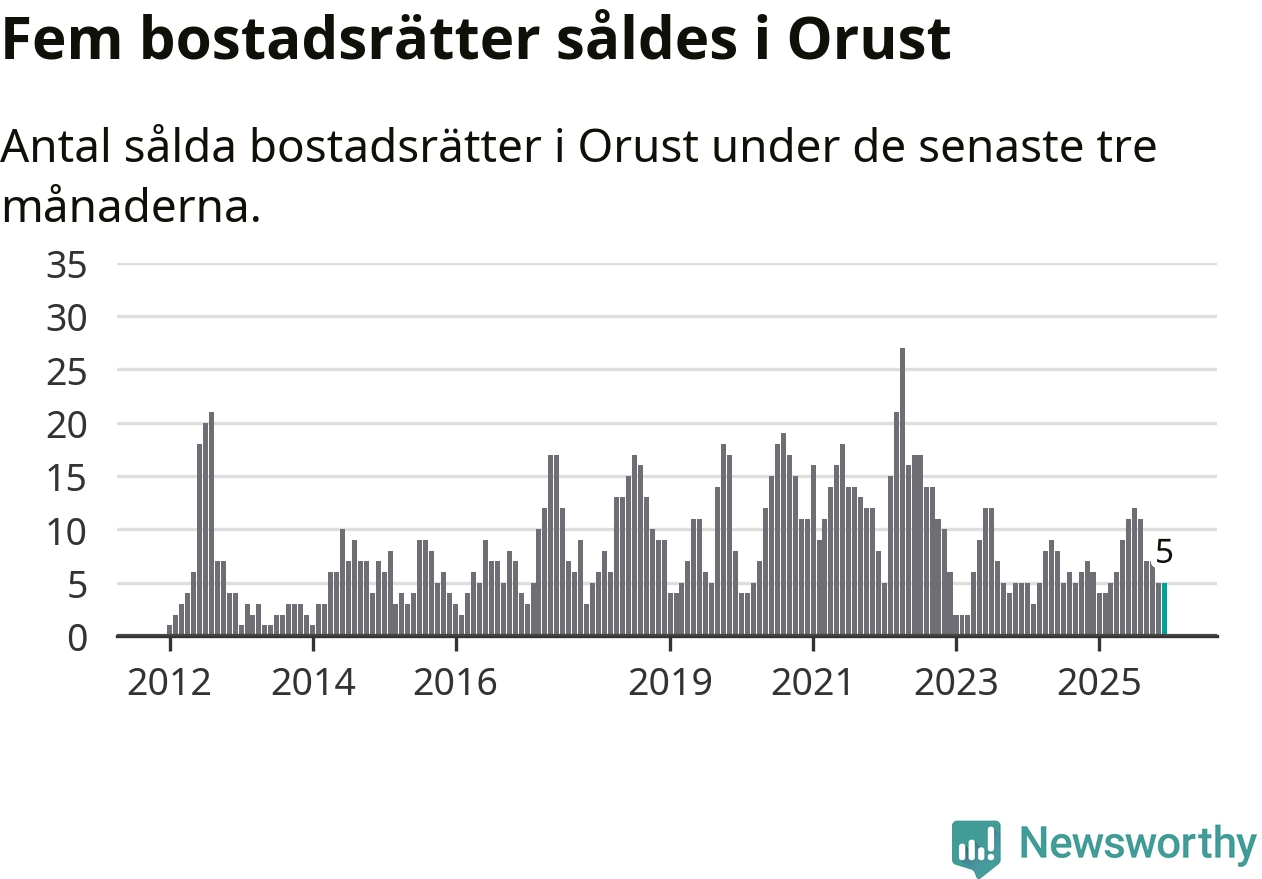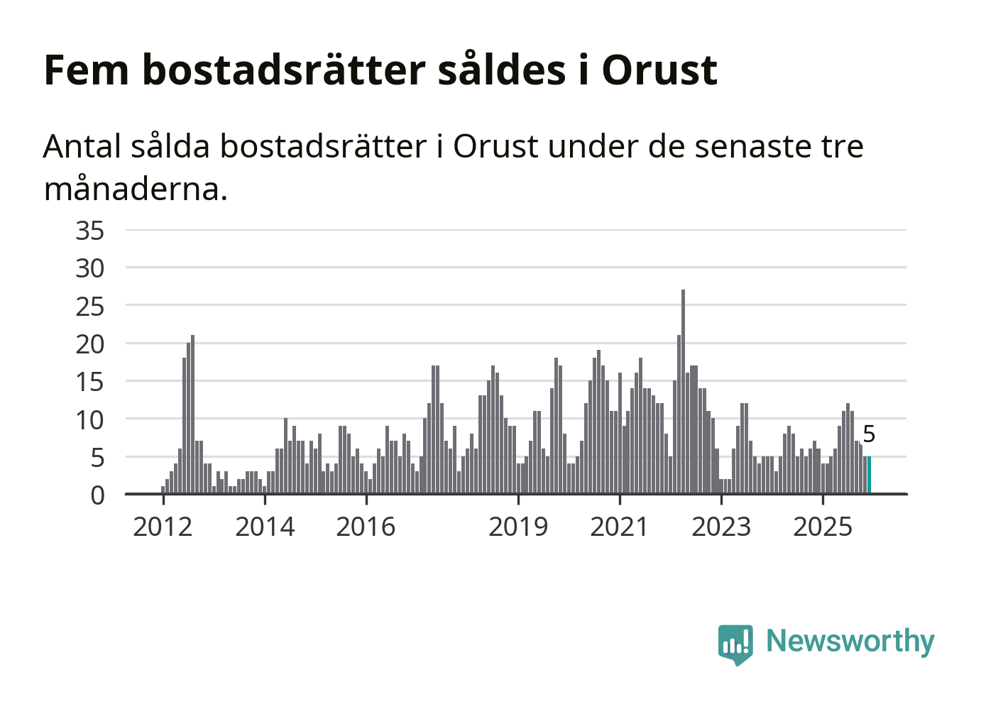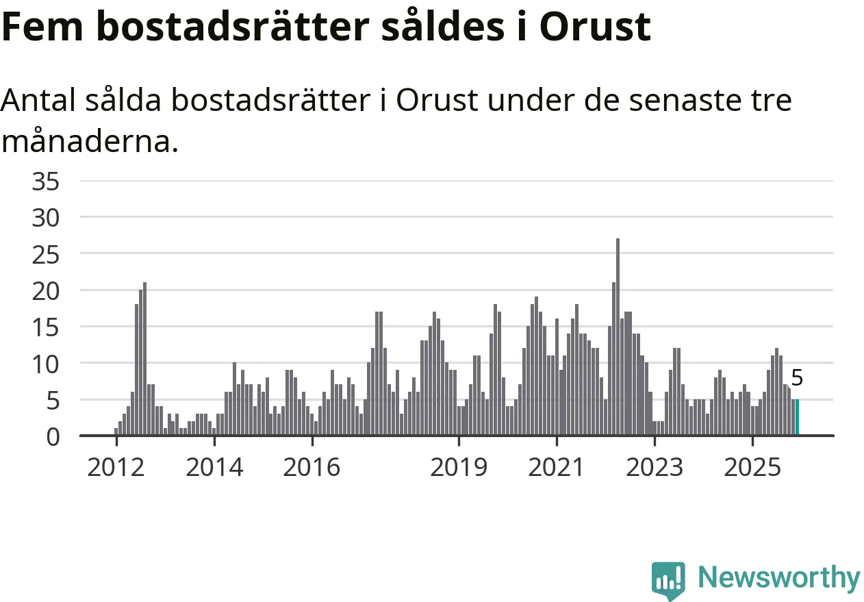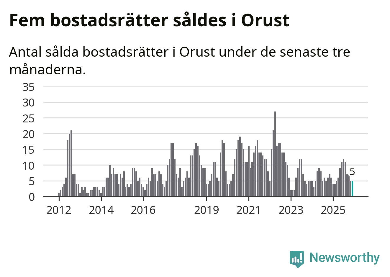 Mellan oktober och december gjordes sammanlagt fem affärer med bostadsrätter i Orusts kommun. Det kan jämföras med sex vid motsvarande tid i fjol.