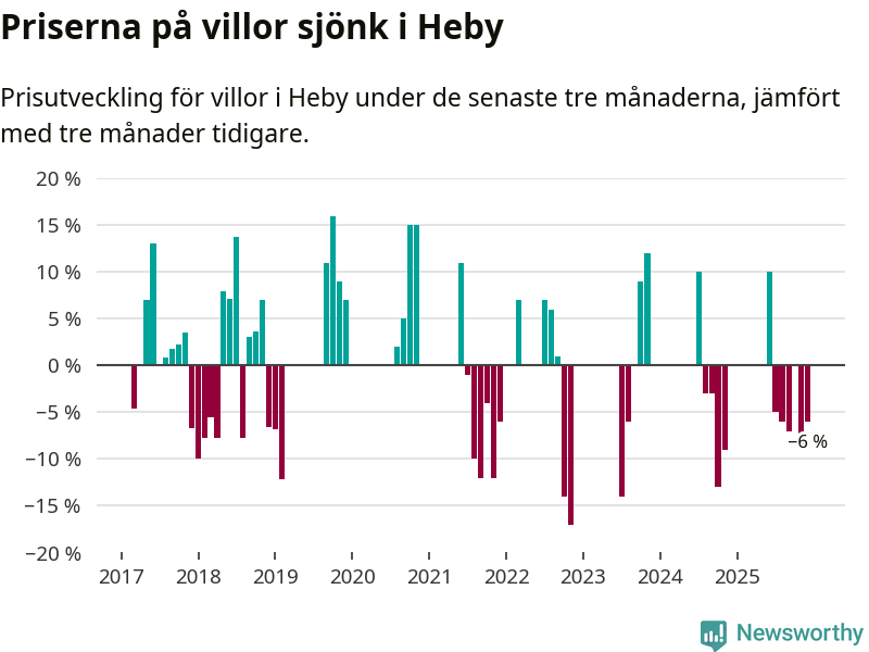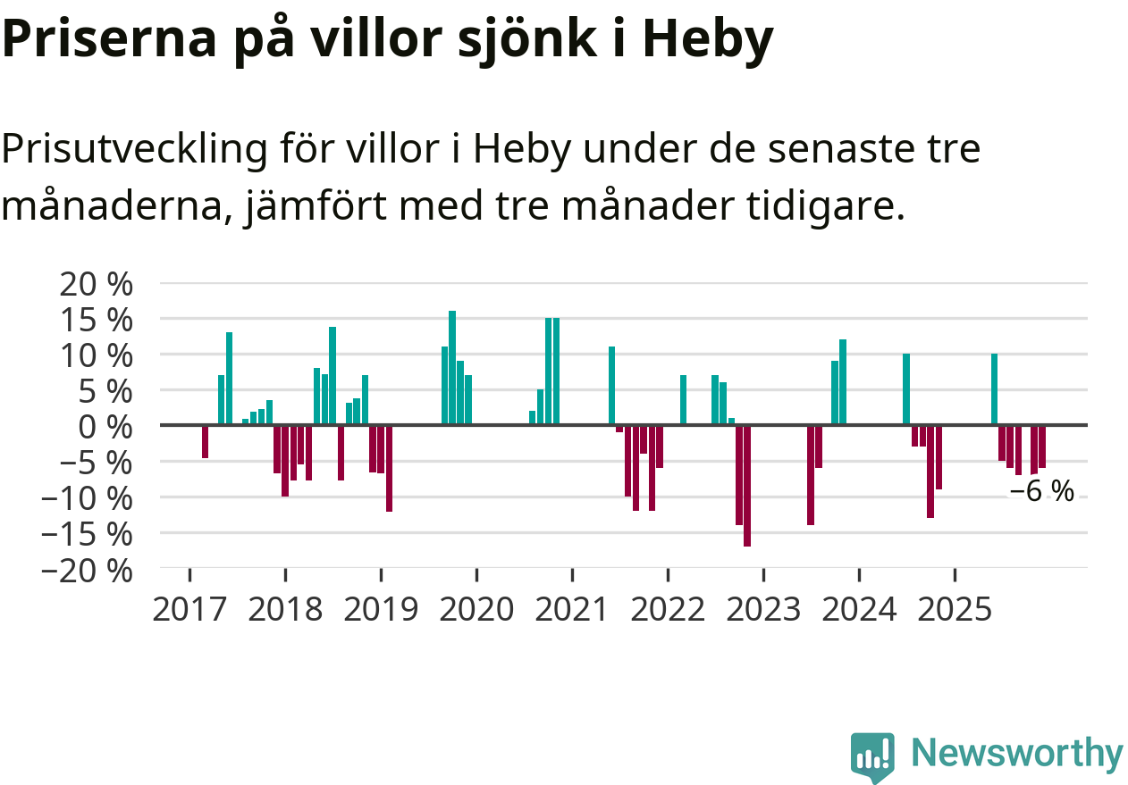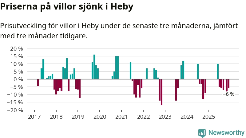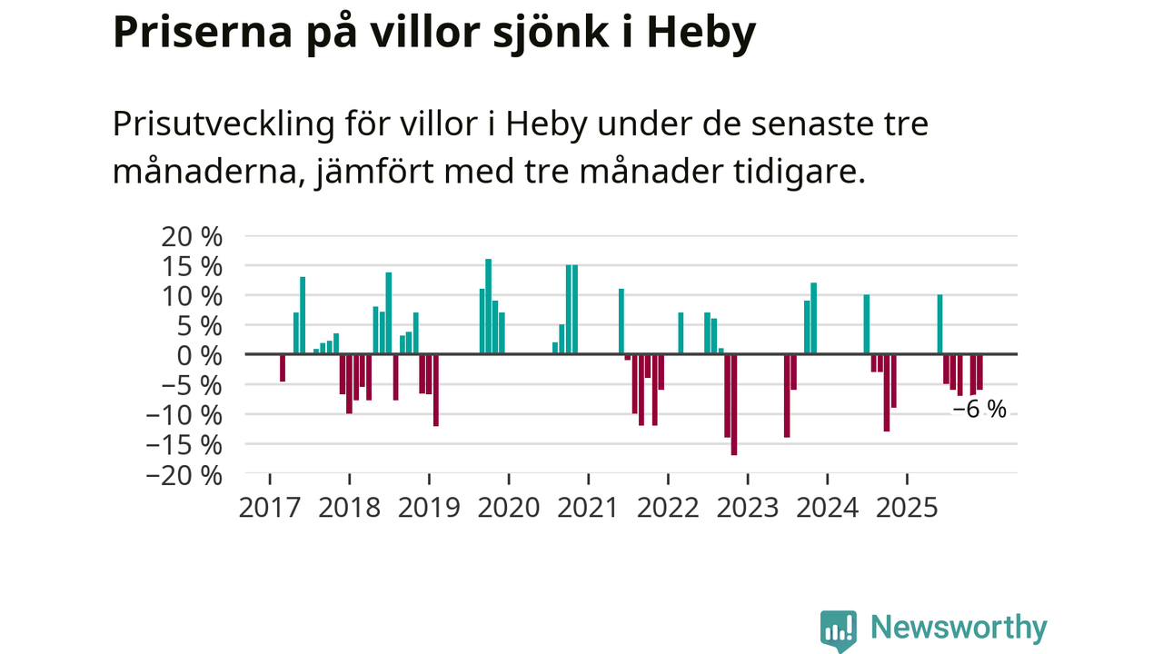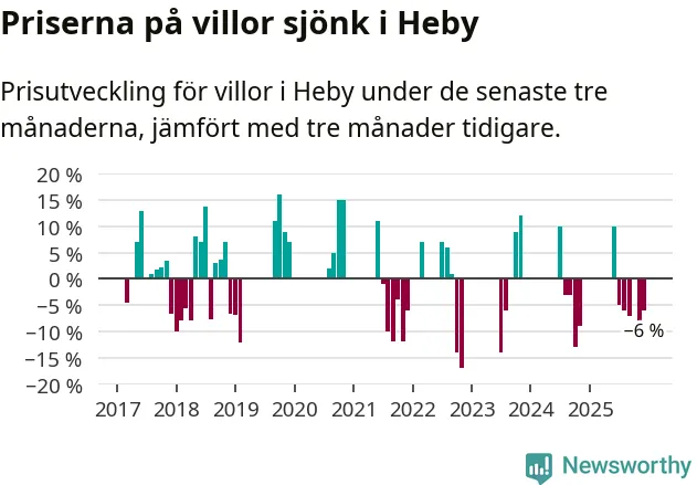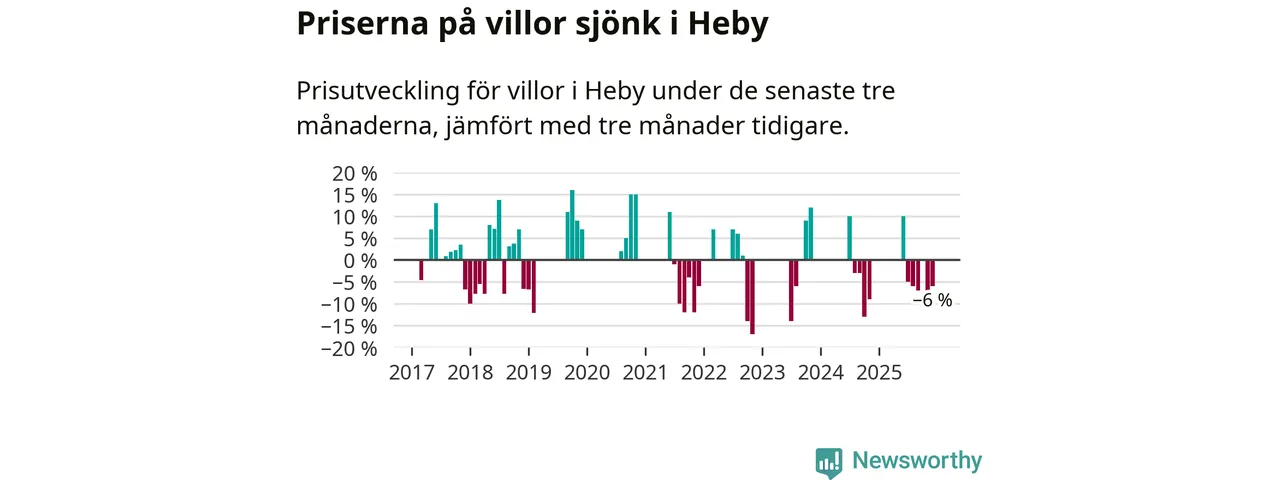 Statistiken visar även på en kännbar prisnedgång i Heby kommun. Medelpriset på försäljningarna av villor i kommunen var 6 procent lägre än för tre månader sedan. Även i hela Uppsala sjunker villapriserna. I hela länet noterades en prisnedgång på 3 procent.