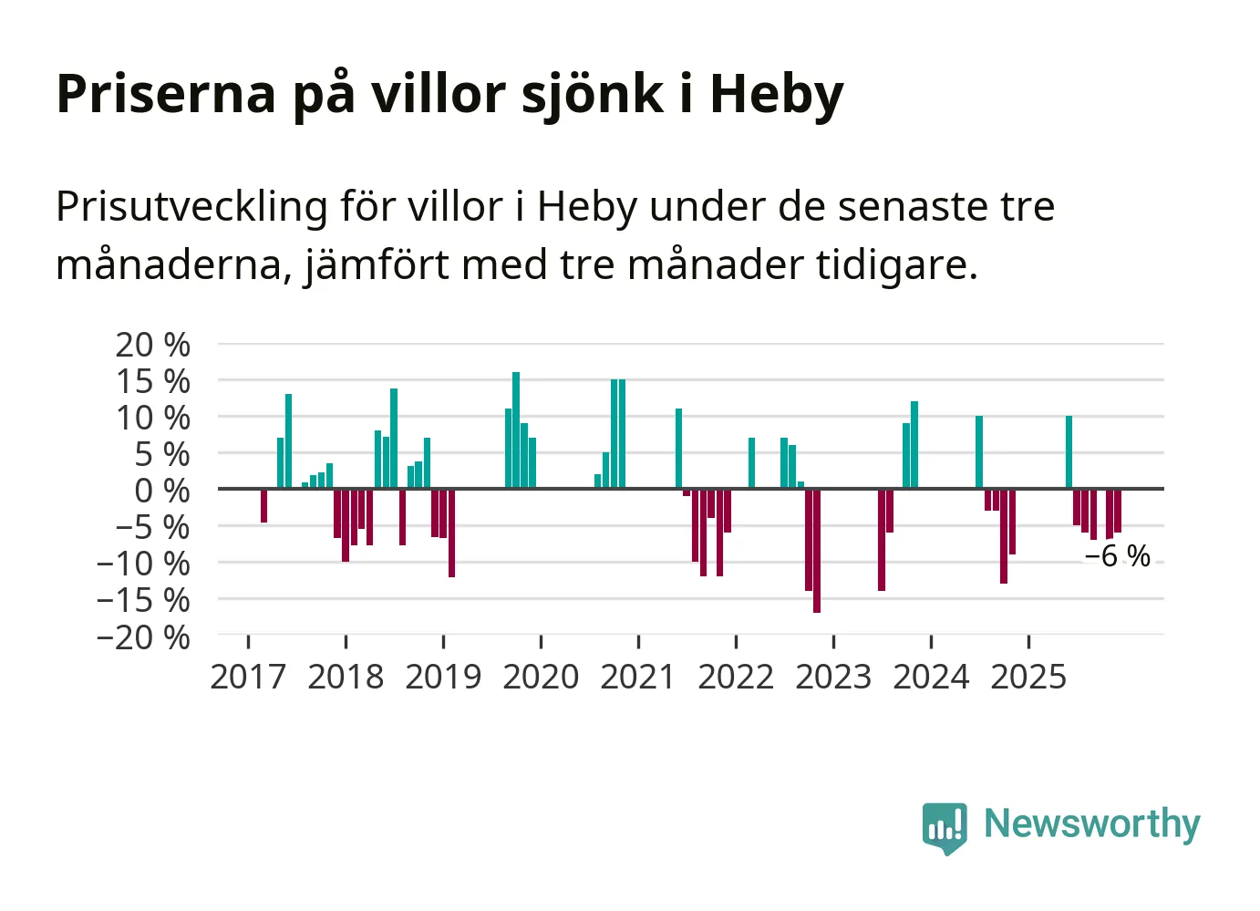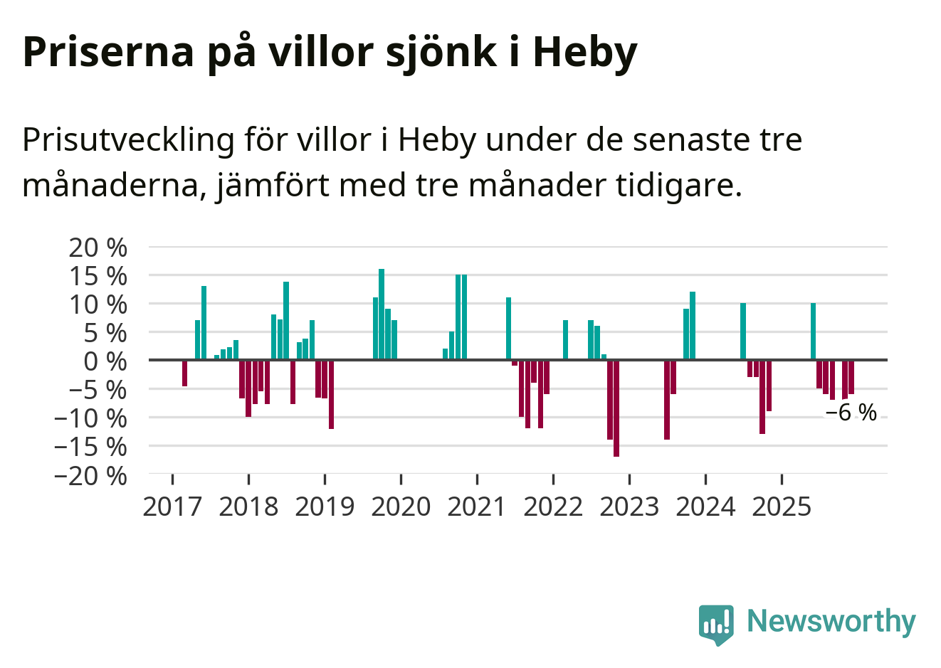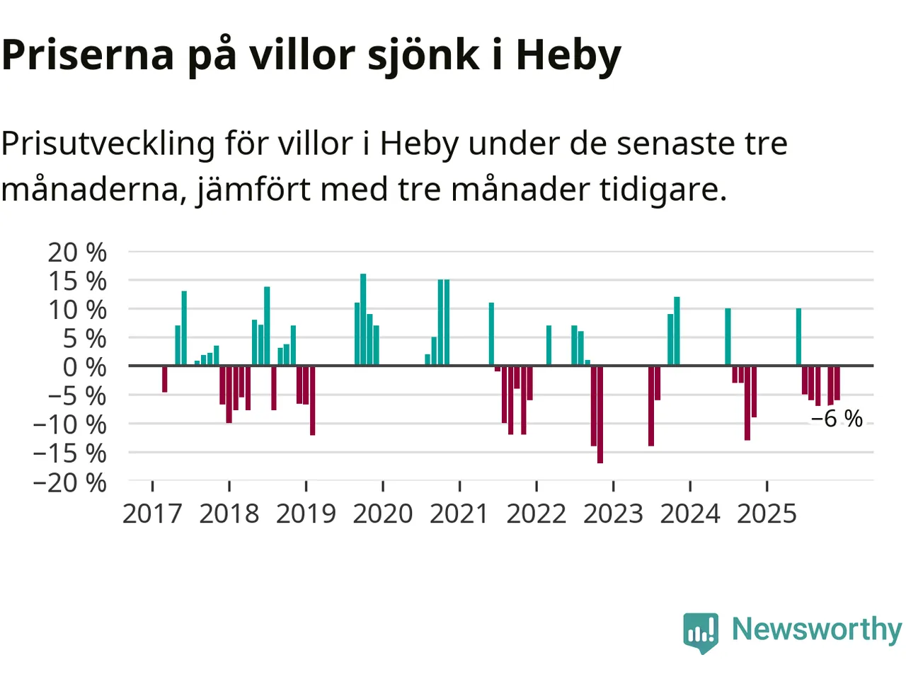 Statistiken visar även på en kännbar prisnedgång i Heby kommun. Medelpriset på försäljningarna av villor i kommunen var 6 procent lägre än för tre månader sedan. Även i hela Uppsala sjunker villapriserna. I hela länet noterades en prisnedgång på 3 procent.