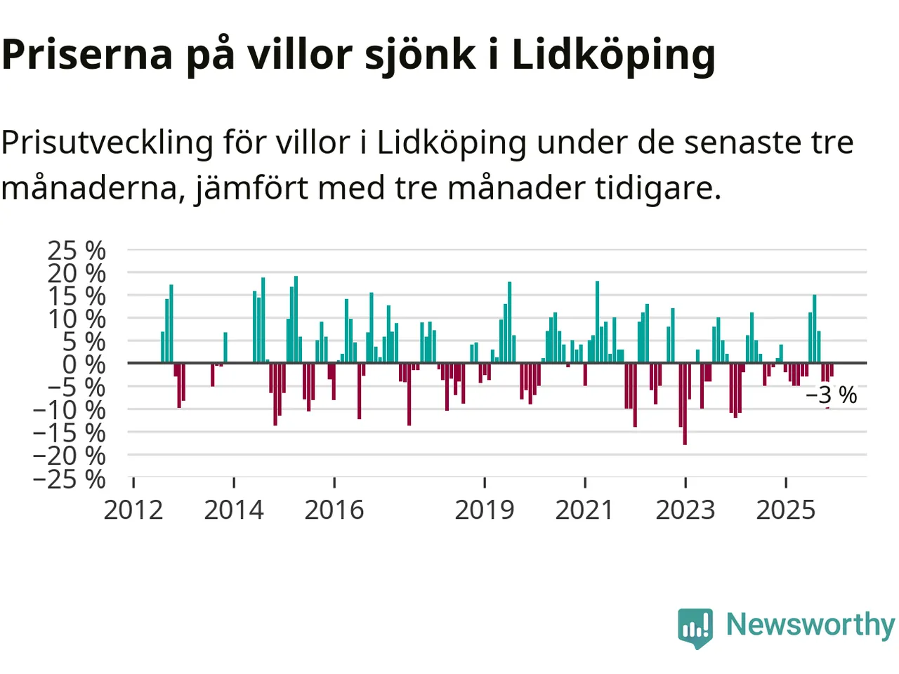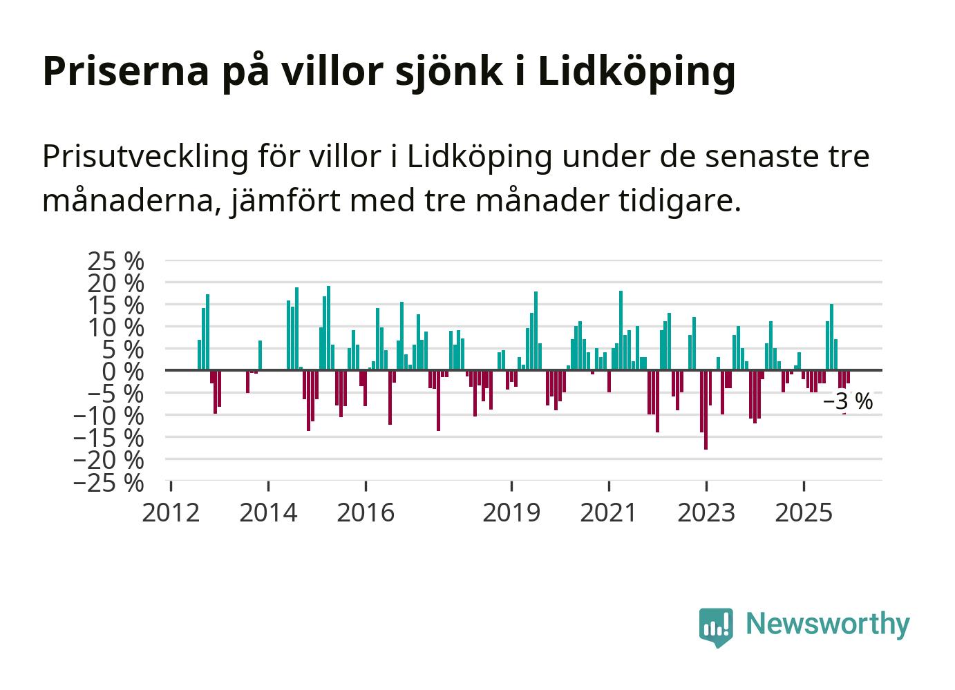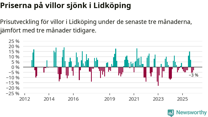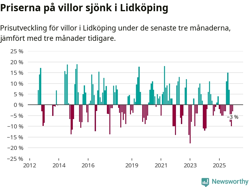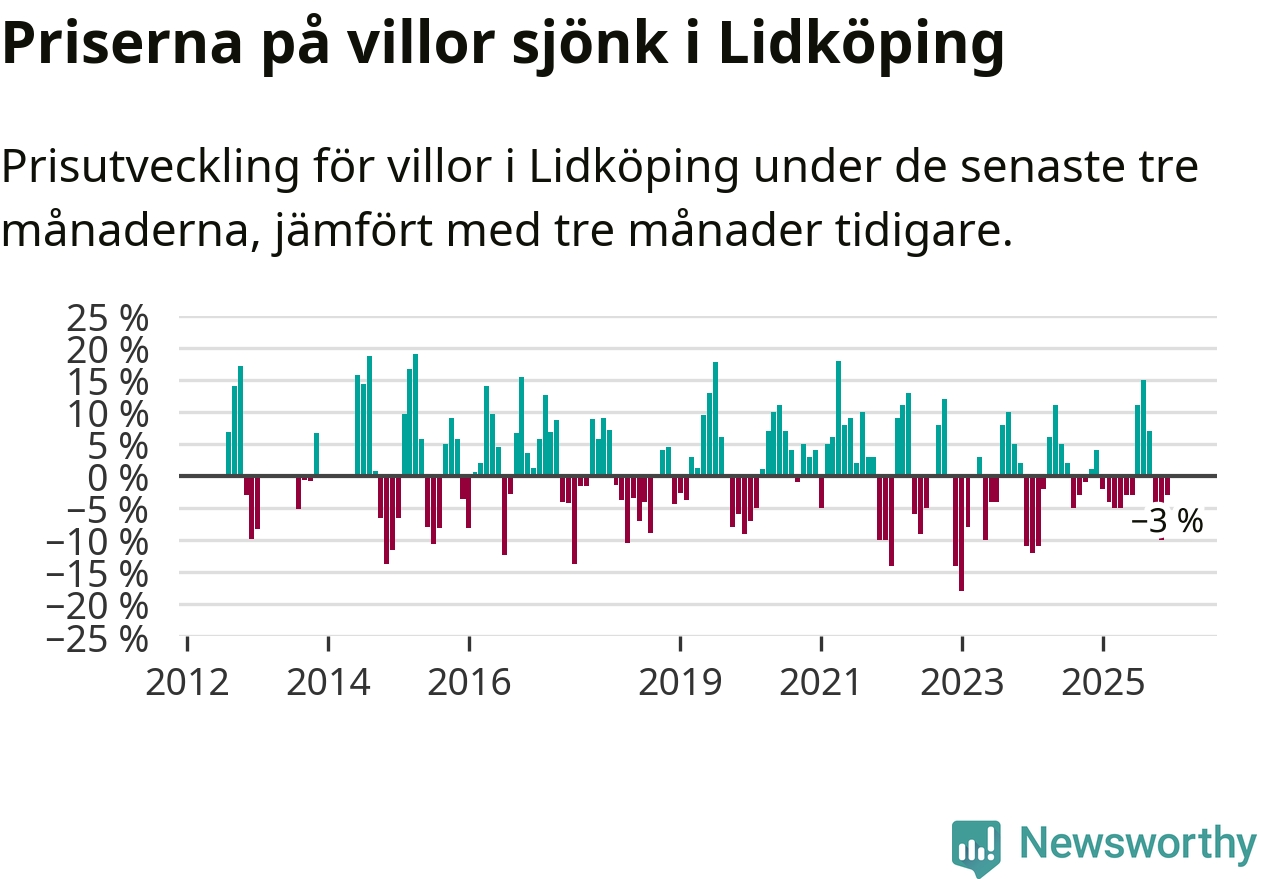 Villapriserna har gått ner i Lidköpings kommun. Medelpriset på försäljningarna under de senaste tre månaderna visar på en nedgång med 3 procent.