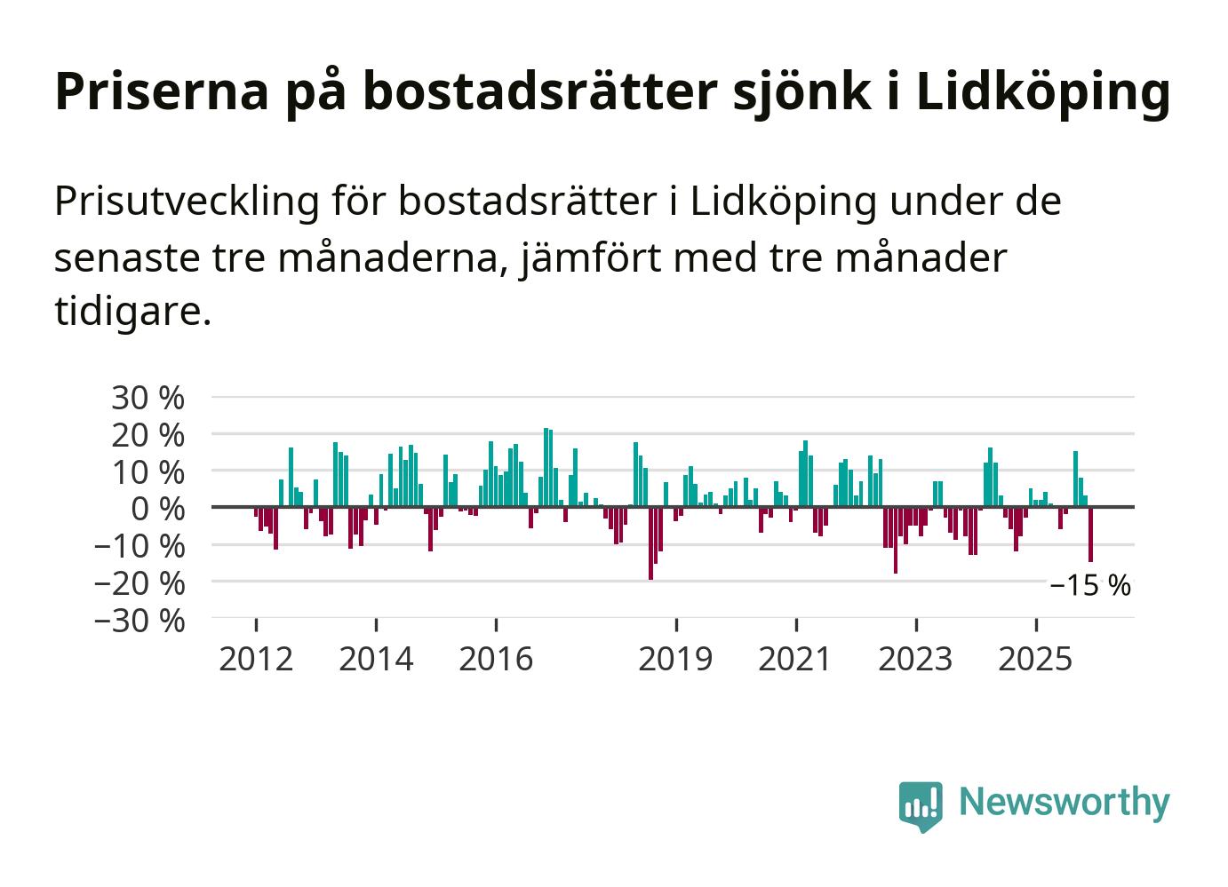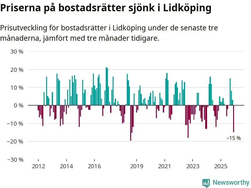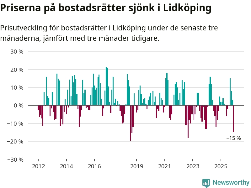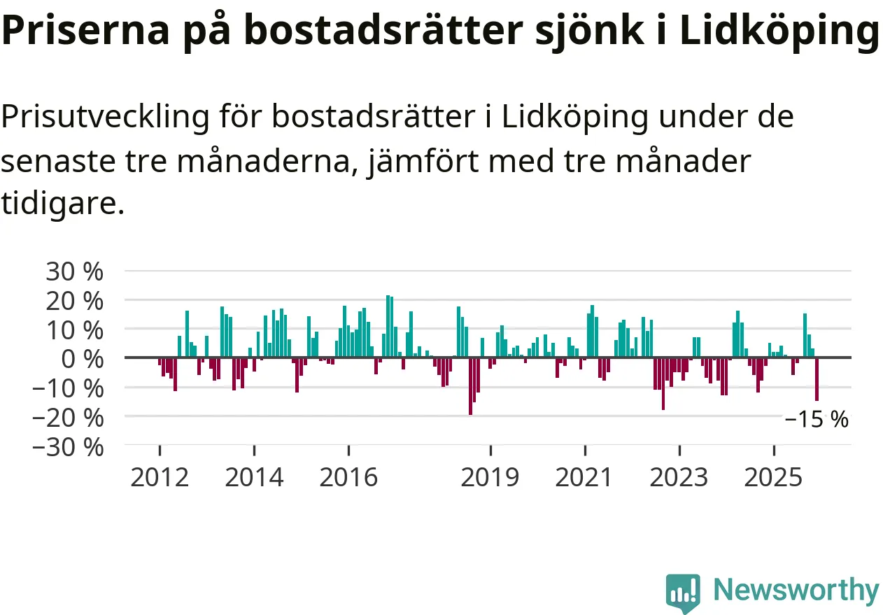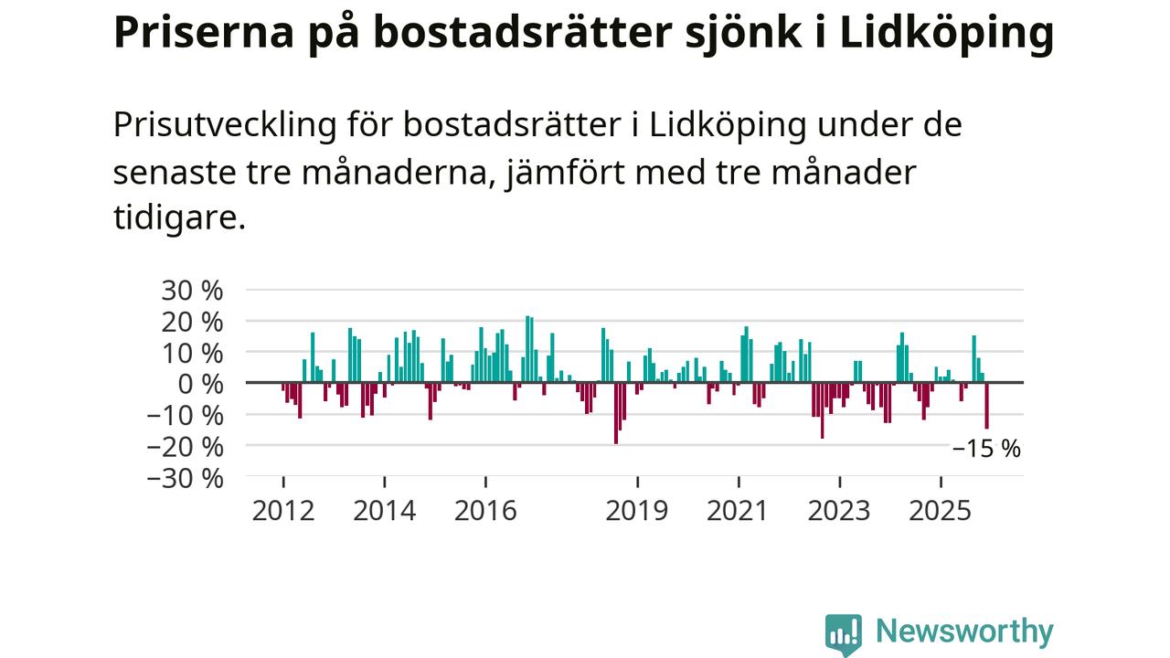 Priserna på bostadsrätter sjönk med 15 procent i Lidköpings kommun under de senaste tre månaderna. Det är den svagaste prisutvecklingen sedan 2022.