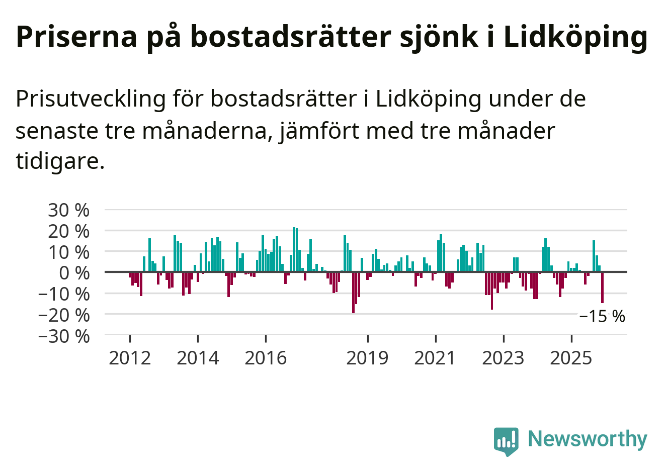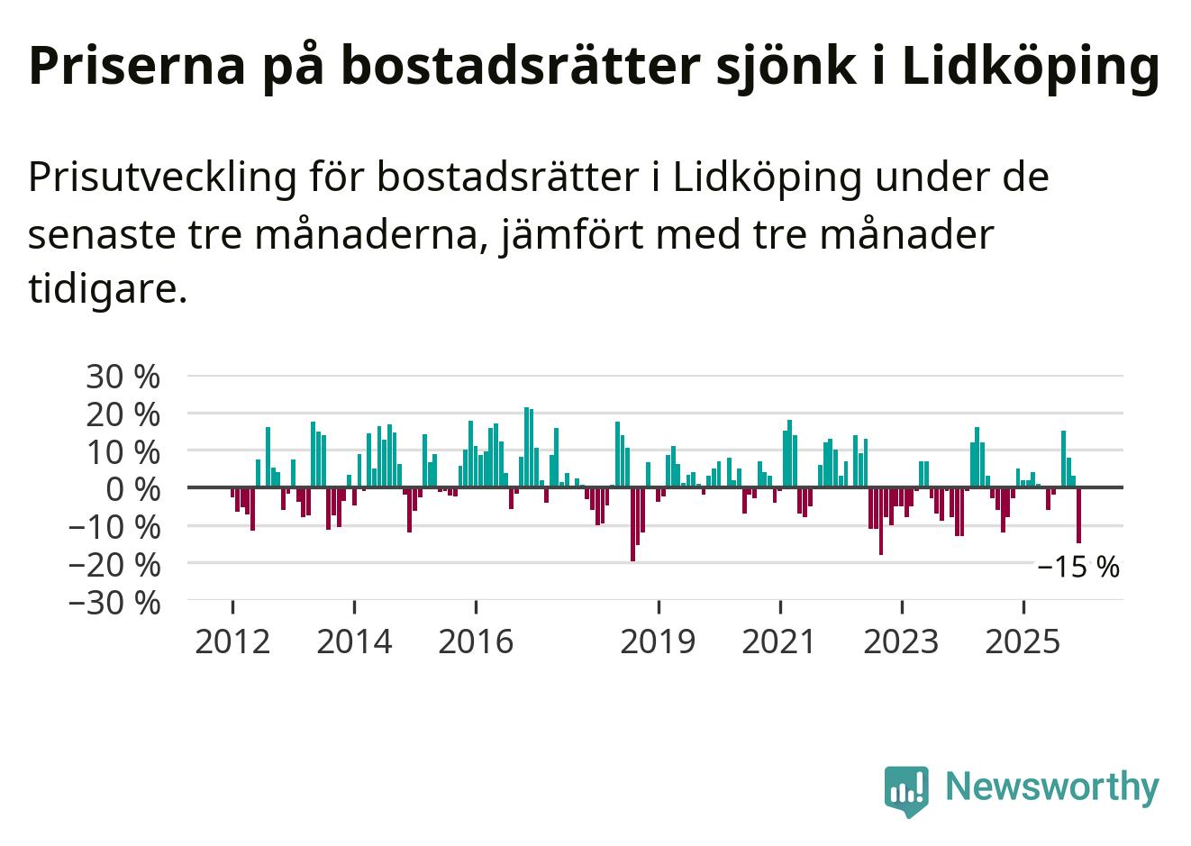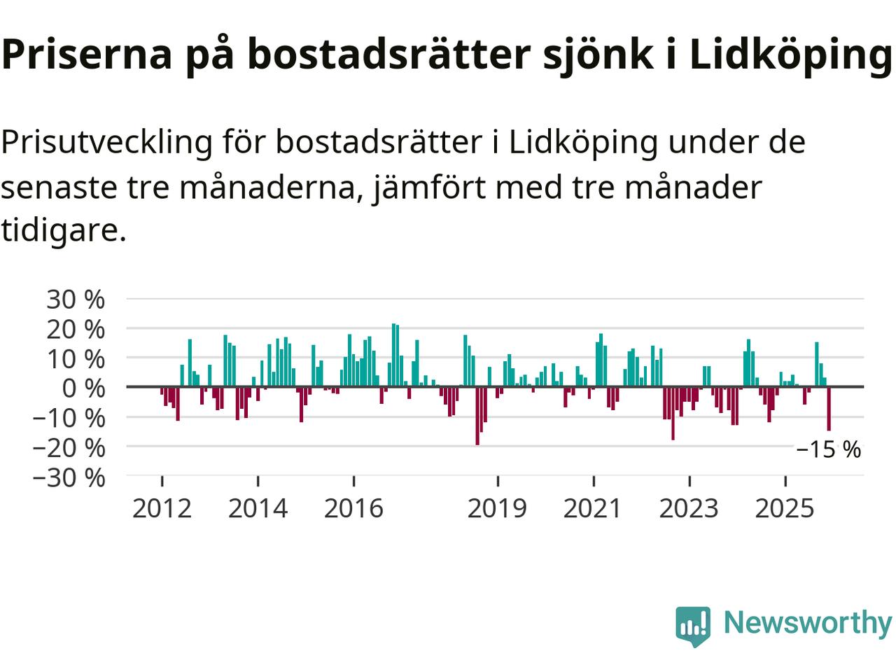 Priserna på bostadsrätter sjönk med 15 procent i Lidköpings kommun under de senaste tre månaderna. Det är den svagaste prisutvecklingen sedan 2022.