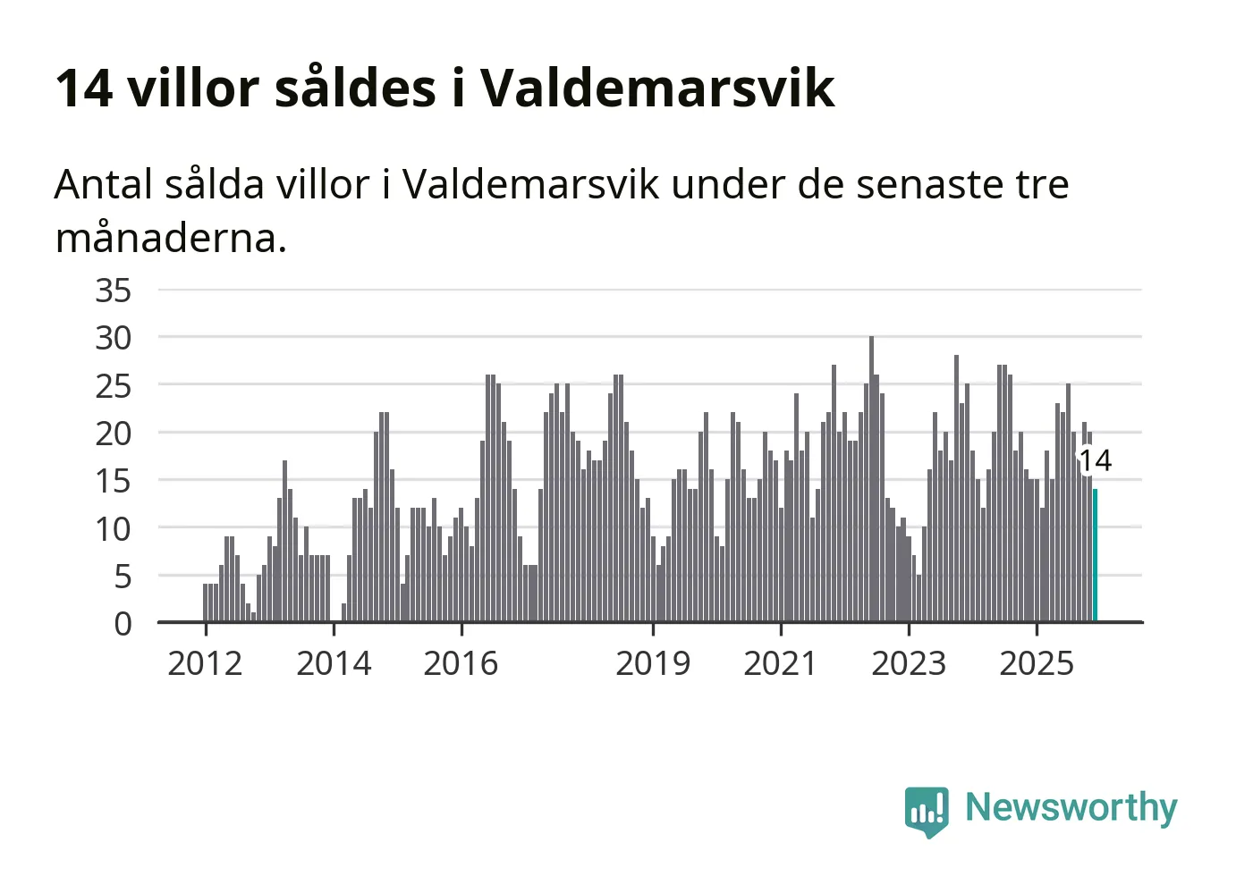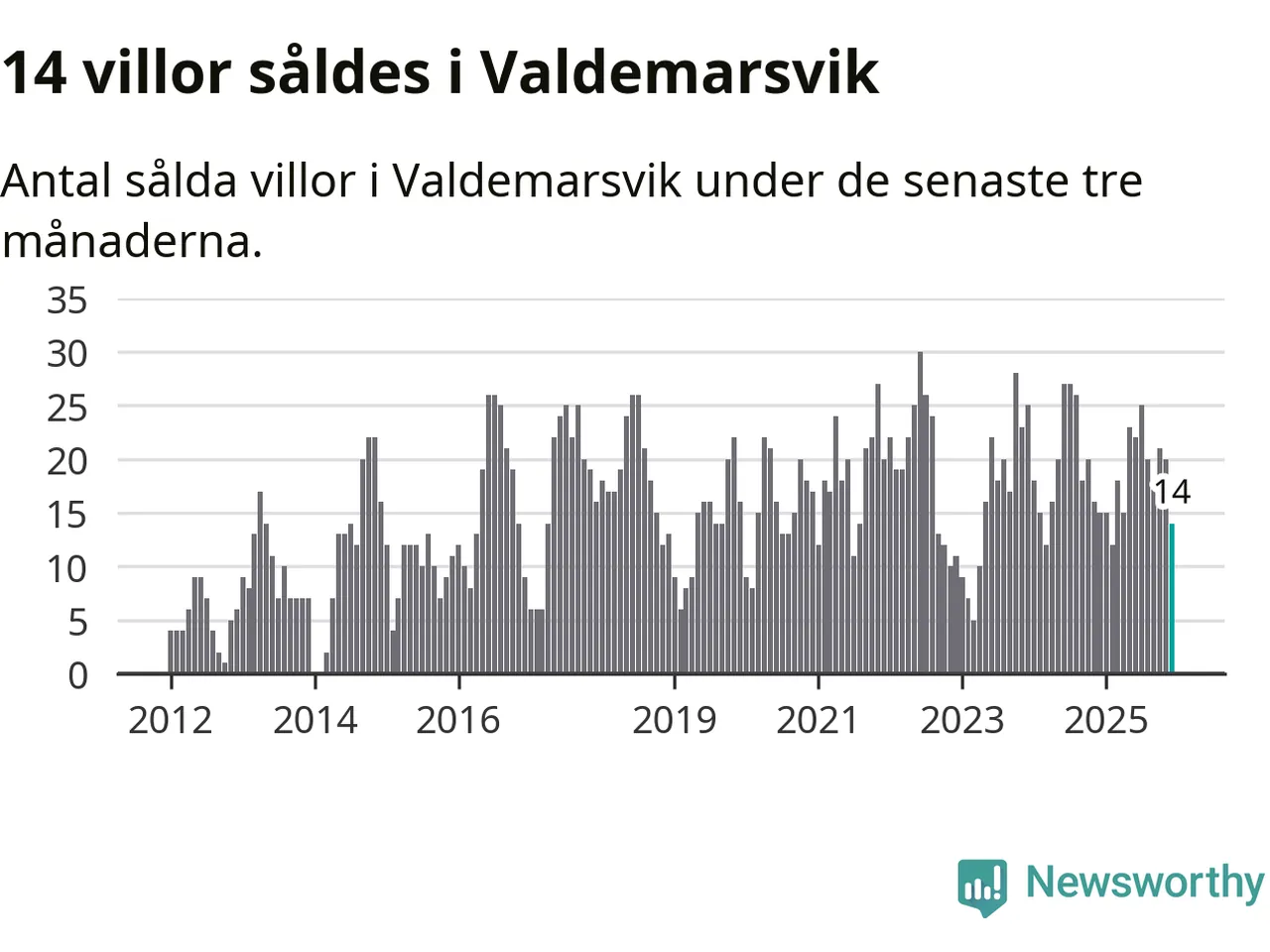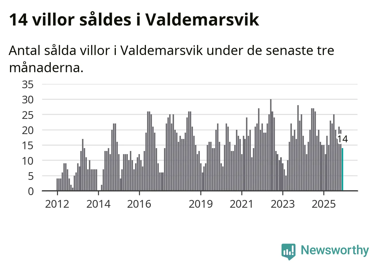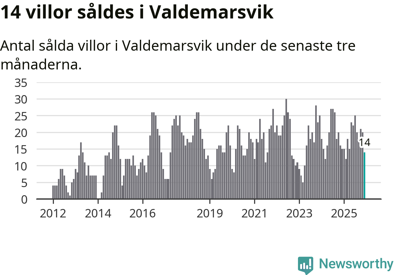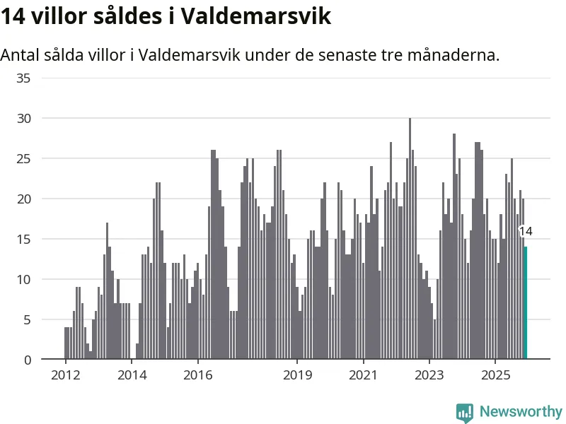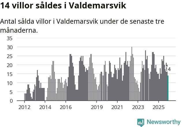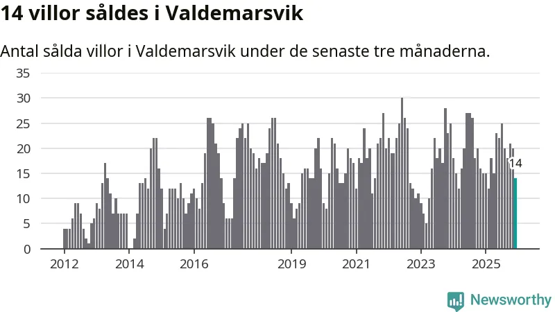 Mellan oktober och december gjordes sammanlagt 14 affärer med villor i Valdemarsviks kommun. Det kan jämföras med 15 vid motsvarande tid i fjol.