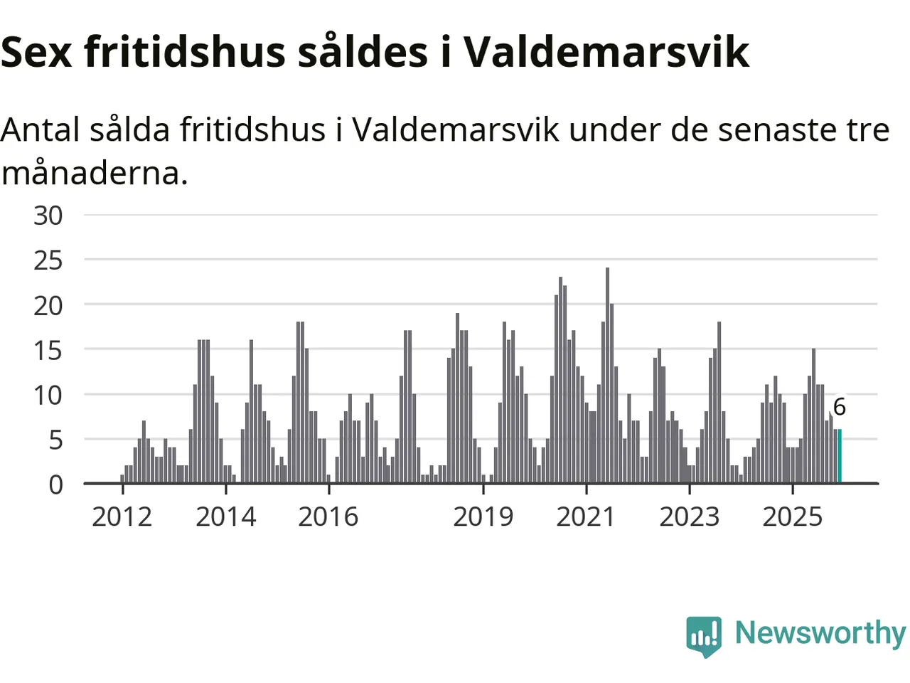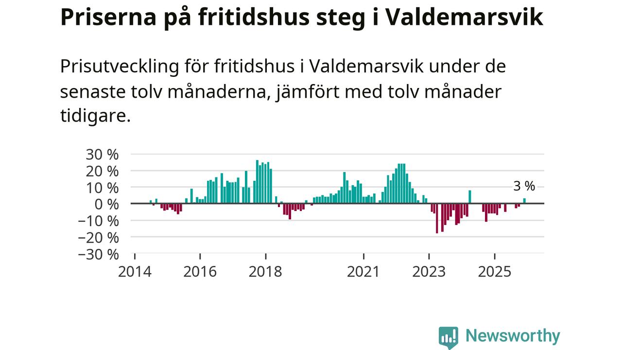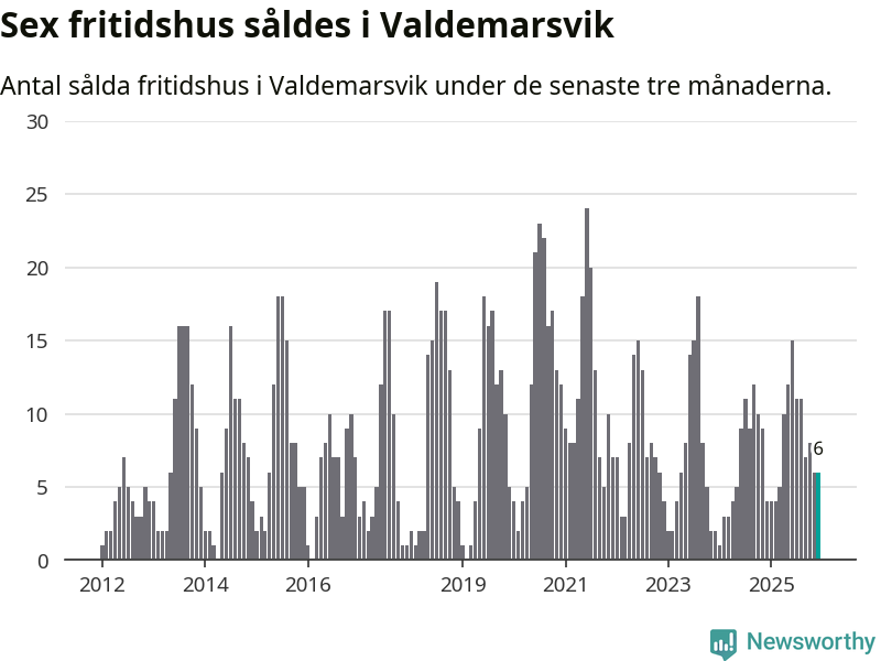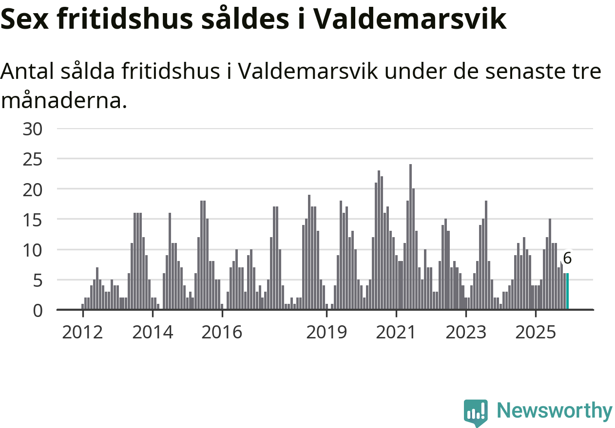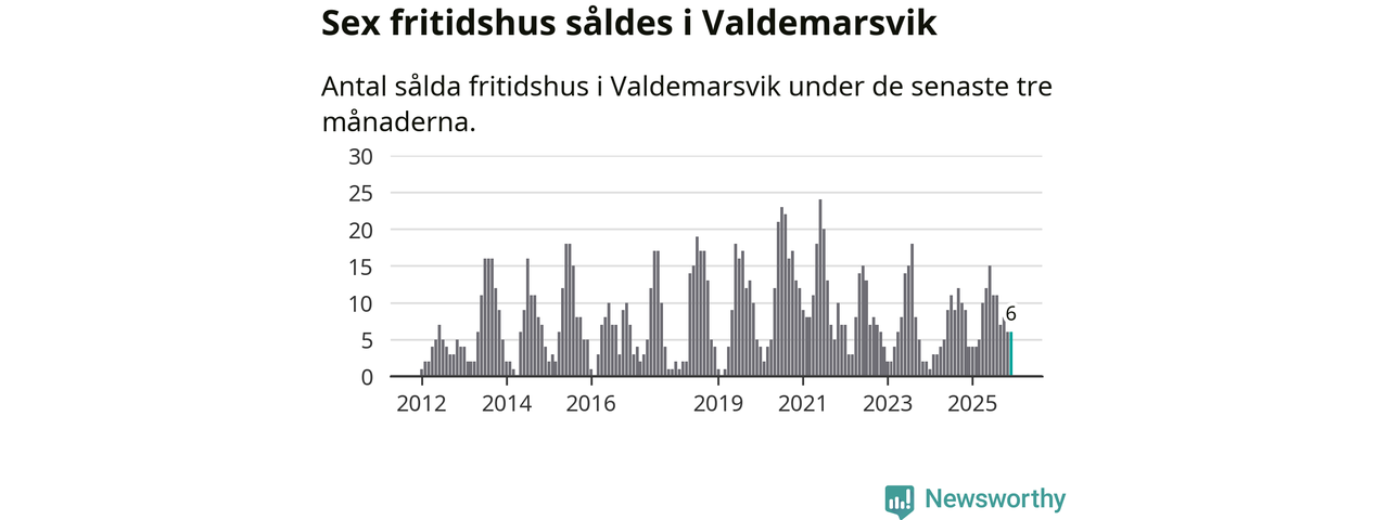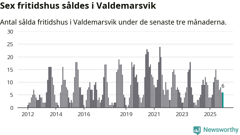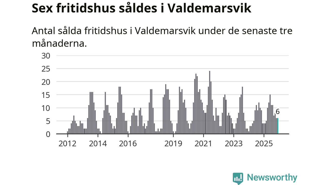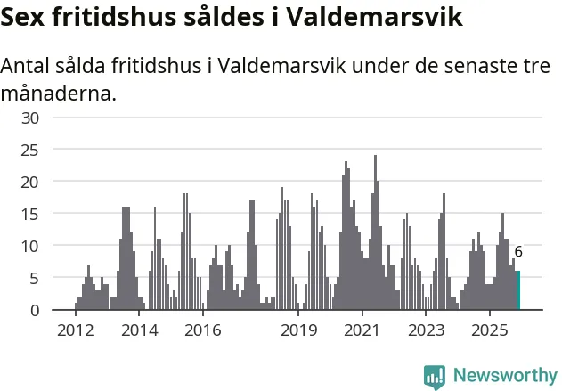 Sammanlagt såldes sex fritidshus i Valdemarsviks kommun mellan oktober 2025 och december 2025 till ett genomsnittligt pris på 2,6 miljoner kronor. I fjol gjordes fyra affärer vid den här tiden på året.