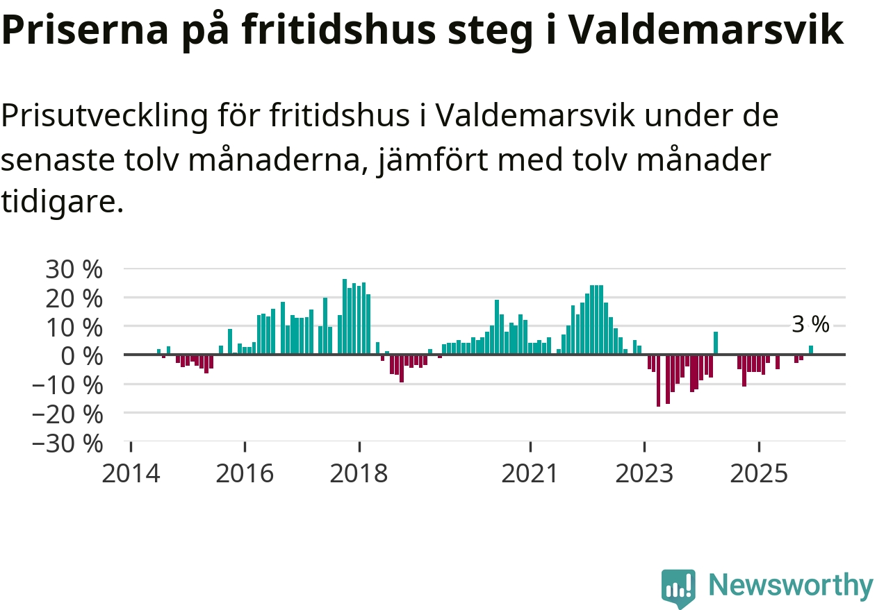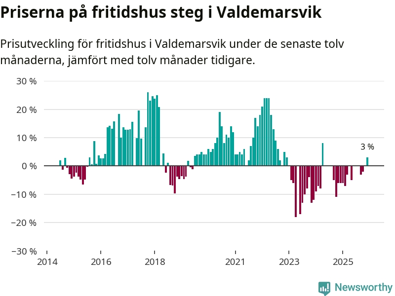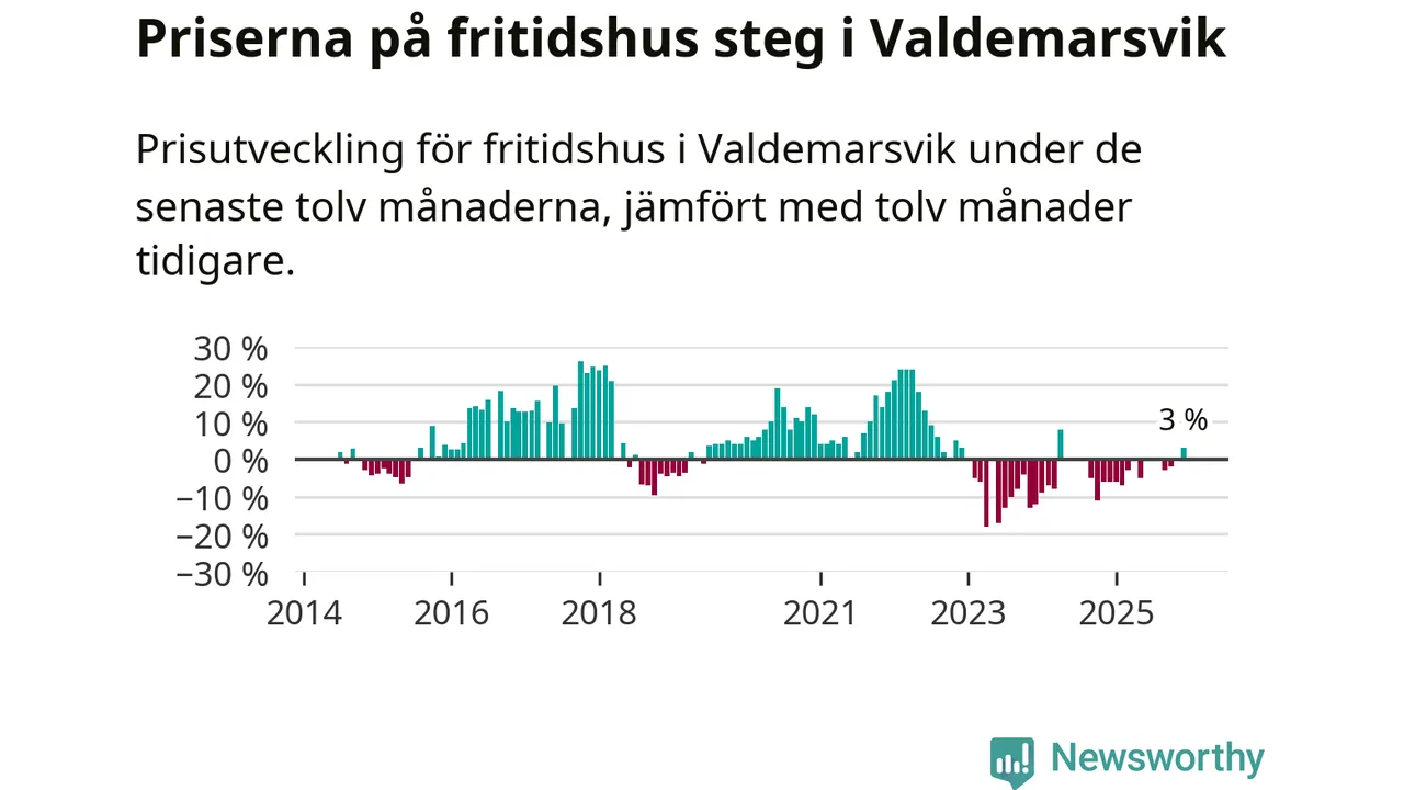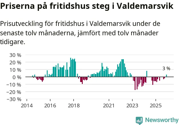 Priserna på fritidshus har gått upp i Valdemarsviks kommun. Medelpriset på försäljningarna under de senaste tolv månaderna visar på en uppgång med 3 procent.